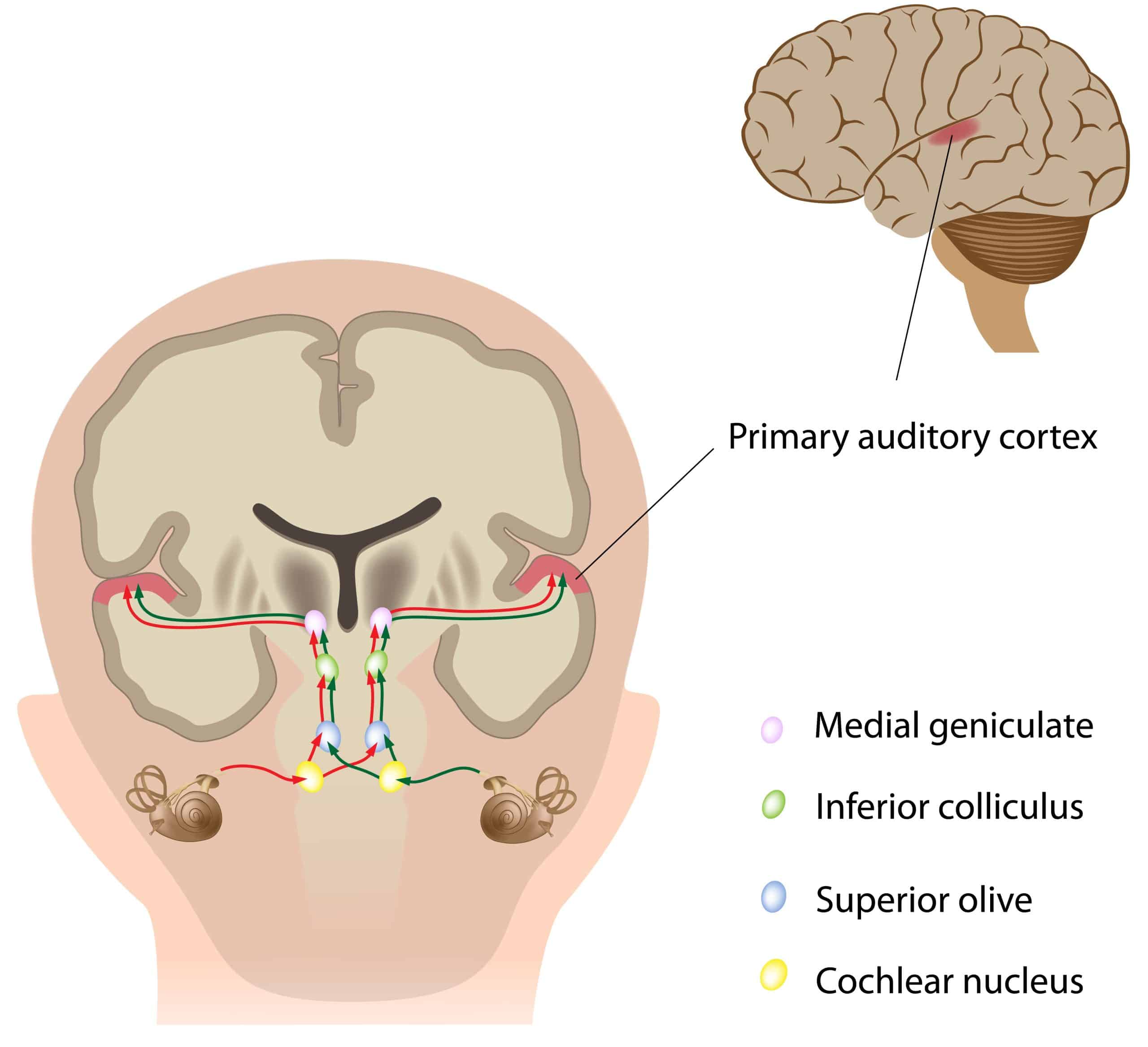 The auditory pathway conveys the special sense of hearing. Information travels from the receptors in the organ of Corti of the inner ear (cochlear hair cells) to the central nervous system, carried by the vestibulocochlear nerve (CN VIII). This pathway ultimately reaches the primary auditory cortex for conscious perception. In addition, unconscious processing of auditory information occurs in parallel. In this article, we will discuss the anatomy of the auditory pathway – its components, anatomical course and relevant anatomical landmarks.