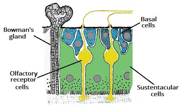 The olfactory nerve (CN I) is the first and shortest cranial nerve. It is a special visceral afferent nerve, which transmits information relating to smell. Embryologicallly, the olfactory nerve is derived from the olfactory placode (a thickening of the ectoderm layer), which also give rise to the glial cells which support the nerve. In this article, we shall look at the anatomy of the olfactory nerve – its structure, anatomical course and clinical relevance. By TeachMeSeries Ltd (2025) Fig 1Innervation of the nasal cavity. The olfactory nerve is responsible for the sense of smell. The nasociliary and nasopalatine nerves provide general sensation. Pro Feature - 3D Model You've Discovered a Pro Feature Access our 3D Model Library Explore, cut, dissect, annotate and manipulate our 3D models to visualise anatomy in a dynamic, interactive way. Learn More Anatomical Course The anatomical course of the olfactory nerve describes the transmission of special sensory information from the nasal epithelium to the primary olfactory cortex of the brain. Nasal Epithelium The sense of smell is detected by olfactory receptors located within the nasal epithelium. Their axons (fila olfactoria) assemble into small bundles of true olfactory nerves, which penetrate the small foramina in the cribriform plate of the ethmoid bone and enter the cranial cavity. Olfactory Bulb Once in the cranial cavity, the fibres enter the olfactory bulb, which lies in the olfactory groove within the anterior cranial fossa. The olfactory bulb is an ovoid structure which contains specialised neurones, called mitral cells. The olfactory nerve fibres synapse with the mitral cells, forming collections known as synaptic glomeruli. From the glomeruli, second order nerves then pass posteriorly into the olfactory tract. By TeachMeSeries Ltd (2025) Fig 2Initial olfactory nerve fibre course. Olfactory Tract The olfactory tract travels posteriorly on the inferior surface of the frontal lobe. As the tract reaches the anterior perforated substance (an area at the level of the optic chiasm) it divides into medial and lateral stria: Lateral stria – carries the axons to the primary olfactory cortex, located within the uncus of temporal lobe. Medial stria – carries the axons across the medial plane of the anterior commissure, where they meet the olfactory bulb of the opposite side. The primary olfactory cortex sends nerve fibres to many other areas of the brain, notably the piriform cortex, the amygdala, olfactory tubercle and the secondary olfactory cortex. These areas are involved in the memory and appreciation of olfactory sensations. Sensory Function The sensory function of the olfactory nerve is achieved via the olfactory mucosa. This mucosal layer not only senses smell, but it also detects the more advanced aspects of taste. It is located in the roof of the nasal cavity and is composed of pseudostratified columnar epithelium which contains a number of cells: Basal cells – form the new stem cells from which the new olfactory cells can develop. Sustentacular cells – tall cells for structural support. These are analogous to the glial cells located in the CNS. Olfactory receptor cells – bipolar neurons which consist of two processes: Dendritic process projects to the surface of the epithelium, where they project a number of short cilia, the olfactory hairs, into the mucous membrane. These cilia react to odors in the air and stimulate the olfactory cells. Central process (also known as the axon) projects in the opposite direction through the basement membrane. In addition to the epithelium, there are Bowman’s glands present in the mucosa, which secrete mucus. By TeachMeSeries Ltd (2025) Fig 3The cells of the olfactory epithelium Clinical Relevance Anosmia Anosmia is defined as the absence of the sense of smell. It can be temporary, permanent, progressive or congenital. Temporary anosmia can be caused by infection (e.g. meningitis) or by local disorders of the nose (e.g. common cold) Permanent anosmia can be caused by head injury, or tumours which occur in the olfactory groove (e.g. meningioma). Anosmia can also occur as a result of neurodegenerative conditions, such as Parkinson’s or Alzheimer’s disease. In these conditions, the anosmia is progressive and precedes motor symptoms but it is not often noticed by the patient. Anosmia is also a feature of a number of genetic conditions such as Kallmann syndrome (failure to start or finish puberty) and Primary Ciliary Dyskinesia (defect in cilia causing it to be immobile) Clinical Relevance Olfactory Nerve Examination Assessment of the olfactory nerve is an important part of a complete cranial nerve examination. First, the patient should be asked if they have noticed any changes in their taste or sense of smell. Then each nostril should be tested, asking the patient to identify a certain smell (peppermint or coffee are often used). The eyes should be closed for this part of the examination. Do you think you’re ready? Take the quiz below Pro Feature - Quiz The Olfactory Nerve (CN I) and Olfactory Pathway Question 1 of 3 Submitting... Skip Next Rate question: You scored 0% Skipped: 0/3 1800 More Questions Available Upgrade to TeachMeAnatomy Pro Challenge yourself with over 1800 multiple-choice questions to reinforce learning Learn More Rate This Article