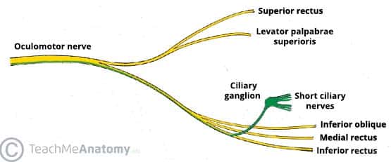 The oculomotor nerve is the third cranial nerve (CN III). It provides motor and parasympathetic innervation to some of the structures within the bony orbit. In this article we shall look at the anatomy of the oculomotor nerve – its anatomical course, functions and clinical correlations. Pro Feature - 3D Model You've Discovered a Pro Feature Access our 3D Model Library Explore, cut, dissect, annotate and manipulate our 3D models to visualise anatomy in a dynamic, interactive way. Learn More Overview Motor – Innervates the majority of the extraocular muscles (levator palpebrae superioris, superior rectus, inferior rectus, medial rectus and inferior oblique). Parasympathetic – Supplies the sphincter pupillae and the ciliary muscles of the eye. Sympathetic – No direct function, but sympathetic fibres run with the oculomotor nerve to innervate the superior tarsal muscle (helps to raise the eyelid). Anatomical Course The oculomotor nerve originates from the oculomotor nucleus – located within the midbrain of the brainstem, ventral to the cerebral aqueduct. It emerges from the anterior aspect of the midbrain, passing inferiorly to the posterior cerebral artery and superiorly to the superior cerebellar artery. The nerve then pierces the dura mater and enters the lateral aspect of the cavernous sinus. Within the cavernous sinus, it receives sympathetic branches from the internal carotid plexus. These fibres do not combine with the oculomotor nerve – they merely travel within its sheath. The nerve leaves the cranial cavity via the superior orbital fissure. At this point, it divides into superior and inferior branches: Superior branch – provides motor innervation to the superior rectus and levator palpabrae superioris. Sympathetic fibres run with the superior branch to innervate the superior tarsal muscle. Inferior branch – provides motor innervation to the inferior rectus, medial rectus and inferior oblique. Also supplies pre-ganglionic parasympathetic fibres to the ciliary ganglion, which ultimately innervates the sphincter pupillae and ciliary muscles. By TeachMeSeries Ltd (2025) Fig 1The oculomotor nerve arises from the midbrain of the brainstem By TeachMeSeries Ltd (2025) Fig 2The superior and inferior branches of the oculomotor nerve within the bony orbit. Motor Functions The oculomotor nerve innervates many of the extraocular muscles. These muscles move the eyeball and upper eyelid. Superior Branch Superior rectus – elevates the eyeball Levator palpabrae superioris – raises the upper eyelid. Additionally, there are sympathetic fibres that travel with the superior branch of the oculomotor nerve. They innervate the superior tarsal muscle, which acts to keep the eyelid elevated after the levator palpabrae superioris has raised it. Inferior Branch: Inferior rectus – depresses the eyeball Medial rectus – adducts the eyeball Inferior oblique – elevates, abducts and laterally rotates the eyeball By TeachMeSeries Ltd (2025) Fig 3Lateral view of the extraocular muscles. Parasympathetic Functions There are two structures in the eye that receive parasympathetic innervation from the oculomotor nerve: Sphincter pupillae – constricts the pupil, reducing the amount of light entering the eye. Ciliary muscles – contracts, causes the lens to become more spherical, and thus more adapted to short range vision. The pre-ganglionic parasympathetic fibres travel in the inferior branch of the oculomotor nerve. Within the orbit, they branch off and synapse in the ciliary ganglion. The post-ganglionic fibres are carried to the eye via the short ciliary nerves. By TeachMeSeries Ltd (2025) Fig 4Overview of the oculomotor nerve branches. The parasympathetic fibres have been highlighted in green. Clinical Relevance Oculomotor Nerve Palsy Oculomotor nerve palsy is a condition resulting from damage to the oculomotor nerve. The most common structural causes include: Raised intracranial pressure (compresses the nerve against the temporal bone). Posterior communicating artery aneurysm Cavernous sinus infection or trauma. Note: there are other pathological causes of oculomotor nerve palsy such as diabetes, multiple sclerosis, myasthenia gravis and giant cell arteritis. The oculomotor nerve provides motor and parasympathetic innervation to some of the structures within the bony orbit. Therefore, the clinical features of CN III injury are associated with the eye: Ptosis (drooping upper eyelid) – due to paralysis of the levator palpabrae superioris and unopposed activity of the orbicularis oculi muscle. ‘Down and out‘ position of the eye at rest – due to paralysis of the superior, inferior and medial rectus, and the inferior oblique (and therefore the unopposed activity of the lateral rectus and superior oblique). The patient is unable to elevate, depress or adduct the eye. Dilated pupil – due to the unopposed action of the dilator pupillae muscle. By TeachMeSeries Ltd (2025) Fig 5Right oculomotor nerve palsy, characterised by the ‘down and out’ dilated pupil with ipsilateral ptosis Do you think you’re ready? Take the quiz below Pro Feature - Quiz The Oculomotor Nerve (CN III) Question 1 of 3 Submitting... Skip Next Rate question: You scored 0% Skipped: 0/3 1800 More Questions Available Upgrade to TeachMeAnatomy Pro Challenge yourself with over 1800 multiple-choice questions to reinforce learning Learn More Rate This Article