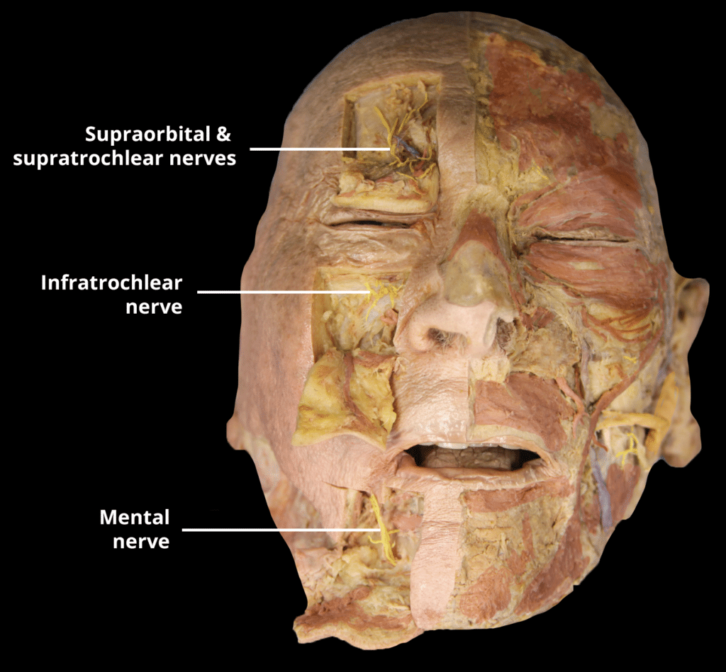 The trigeminal nerve (CN V) is the fifth paired cranial nerve. It is also the largest cranial nerve. In this article, we shall look at the anatomy of the trigeminal nerve – its course, functions and clinical correlations. Pro Feature - 3D Model You've Discovered a Pro Feature Access our 3D Model Library Explore, cut, dissect, annotate and manipulate our 3D models to visualise anatomy in a dynamic, interactive way. Learn More Summary The trigeminal nerve is associated with derivatives of the 1st pharyngeal arch. Sensory: Innervation to the skin, mucous membranes and sinuses of the face. Motor: Innervation to the muscles of mastication, anterior belly of digastric, mylohyoid, tensor veli palatini and tensor tympani. Parasympathetic Supply: Post-ganglionic neurones from parasympathetic ganglia travel with branches of the trigeminal nerve. Pro Feature - Dissection Images Cutaneous branches of the trigeminal nerve, supplying sensation to the face and scalp. Cutaneous branches of the trigeminal nerve, supplying sensation to the face and scalp. You've Discovered a Pro Feature Access our Dissection Image Library Enhance your understanding with high-resolution dissection images showcasing real-life anatomy. Learn More Anatomical Course The trigeminal nerve originates from three sensory nuclei (mesencephalic, principal sensory, spinal nuclei of trigeminal nerve) and one motor nucleus (motor nucleus of the trigeminal nerve) extending from the midbrain to the medulla. A nucleus (pl. nuclei) is a collection of neurone cell bodies within the central nervous system. At the level of the pons, the sensory nuclei merge to form a sensory root. The motor nucleus continues to form a motor root. These roots are analogous to the dorsal and ventral roots of the spinal cord. In the middle cranial fossa, the sensory root expands into the trigeminal ganglion. A ganglion (pl. ganglia) refers to a collection of the neurone cell bodies outside the central nervous system. The trigeminal ganglion is located lateral to the cavernous sinus, in a depression of the temporal bone. This depression is known as the trigeminal cave. The peripheral aspect of the trigeminal ganglion gives rise to 3 divisions: ophthalmic (V1), maxillary (V2) and mandibular (V3). The motor root passes inferiorly to the sensory root, along the floor of the trigeminal cave. Its fibres are only distributed to the mandibular division. The ophthalmic nerve and maxillary nerve travel lateral to the cavernous sinus exiting the cranium via the superior orbital fissure and foramen rotundum respectively. The mandibular nerve exits via the foramen ovale entering the infra-temporal fossa. (Note – be aware that while we talk about the nerves exiting the cranial cavity, the sensory components can also be said to be entering the cranial cavity, since they are afferent fibres). By TeachMeSeries Ltd (2025) Fig 1The origin of the sensory aspect of the trigeminal nerve. Note that the nuclei are situated within in the CNS, and the ganglia outside the CNS. By TeachMeSeries Ltd (2025) Fig 2Overview of the deep distribution of the trigeminal nerve and its terminal branches. Divisions Ophthalmic Nerve The ophthalmic nerve gives rise to three terminal branches: frontal, lacrimal and nasociliary. They innervate the skin and mucous membrane of derivatives of the frontonasal prominence derivatives: Forehead and scalp Frontal and ethmoidal sinus Upper eyelid and its conjunctiva Cornea (see clinical relevance) Dorsum of the nose Parasympathetic Supply: Lacrimal gland: Post ganglionic fibres from the pterygopalatine ganglion (derived from the facial nerve), travel with the zygomatic branch of V2 and then join the lacrimal branch of V1. The fibres supply parasympathetic innervation to the lacrimal gland. By TeachMeSeries Ltd (2025) Fig 3Nervous supply to the orbit from the ophthalmic and maxillary nerves. (other nerves e.g. orbital, not labelled). Note that the lacrimal nerve has been partly removed to expose the underlying structures. Clinical Relevance Corneal Reflex The corneal reflex is the involuntary blinking of the eyelids – stimulated by tactile, thermal or painful stimulation of the cornea. In the corneal reflex, the ophthalmic nerve acts as the afferent limb – detecting the stimuli. The facial nerve is the efferent limb, causing contraction of the orbicularis oculi muscle. If the corneal reflex is absent, it is a sign of damage to the trigeminal/ophthalmic nerve, or the facial nerve. By TeachMeSeries Ltd (2025) Fig 4The corneal reflex pathway. Maxillary Nerve The maxillary nerve gives rise to 14 terminal branches, which innervate the skin, mucous membranes and sinuses of derivatives of the maxillary prominence of the 1st pharyngeal arch: Lower eyelid and its conjunctiva Cheeks and maxillary sinus Nasal cavity and lateral nose Upper lip Upper molar, incisor and canine teeth and the associated gingiva Superior palate Parasympathetic Supply: Lacrimal gland: Post ganglionic fibres from the pterygopalatine ganglion (derived from the facial nerve), travel with the zygomatic branch of V2 and then join the lacrimal branch of V1. The fibres supply parasympathetic innervation to the lacrimal gland. Nasal glands: Parasympathetic fibres are also carried to the mucous glands of the nasal mucosa. Post-ganglionic fibres travel with the nasopalatine and greater palatine nerves (branches of V2) Mandibular Nerve The mandibular nerve gives rise to four terminal branches in the infra-temporal fossa: buccal nerve, inferior alveolar nerve, auriculotemporal nerve and lingual nerve. These branches innervate the skin, mucous membrane and striated muscle derivatives of the mandibular prominence of the 1st pharyngeal arch. Sensory Supply: Mucous membranes and floor of the oral cavity External ear Lower lip Chin Anterior 2/3 of the tongue (only general sensation; special taste sensation supplied by the chorda tympani, a branch of the facial nerve) Lower molar, incisor and canine teeth and 