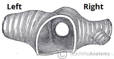 The trachea, bronchi and bronchioles form the tracheobronchial tree – a system of airways that allow passage of air into the lungs, where gas exchange occurs. These airways are located in the neck and thorax. In this article we will look at the anatomical position, structure and neurovascular supply of the airways; as well as considering their clinical relevance. Pro Feature - 3D Model You've Discovered a Pro Feature Access our 3D Model Library Explore, cut, dissect, annotate and manipulate our 3D models to visualise anatomy in a dynamic, interactive way. Learn More The Trachea Anatomical Position The trachea marks the beginning of the tracheobronchial tree. It arises at the lower border of cricoid cartilage in the neck, as a continuation of the larynx. It travels inferiorly into the superior mediastinum, bifurcating at the level of the sternal angle (forming the right and left main bronchi). As it descends, the trachea is located anteriorly to the oesophagus, and inclines slightly to the right. By Bibi Saint-Pol [CC BY-SA 3.0], via Wikimedia Commons Fig 1Overview of the tracheobronchial tree. Key: Green – upper lobe, yellow – middle lobe, blue – lower lobe Structure The trachea, like all of the larger respiratory airways, is held open by cartilage – here in C-shaped rings. The free ends of these rings are supported by the trachealis muscle. The trachea and bronchi are lined by ciliated pseudostratified columnar epithelium, interspersed by goblet cells, which produce mucus. The combination of sweeping movements by the cilia and mucus from the goblet cells forms the functional mucociliary escalator. This acts to trap inhaled particles and pathogens, moving them up out of the airways to be swallowed and destroyed. At the bifurcation of the primary bronchi, a ridge of cartilage called the carina runs anteroposteriorly between the openings of the two bronchi. This is the most sensitive area of the trachea for triggering the cough reflex, and can be seen on bronchoscopy. Neurovascular Supply The trachea receives sensory innervation from the recurrent laryngeal nerve. Arterial supply comes from the tracheal branches of the inferior thyroid artery, while venous drainage is via the brachiocephalic, azygos and accessory hemiazygos veins. Pro Feature - Dissection Images Contents of the superior mediastinum. Contents of the superior mediastinum. You've Discovered a Pro Feature Access our Dissection Image Library Enhance your understanding with high-resolution dissection images showcasing real-life anatomy. Learn More Bronchi At the level of the sternal angle, the trachea bifurcates into the right and left main bronchi. They undergo further branching to produce the secondary bronchi. Each secondary bronchi supplies a lobe of the lung, and gives rise to several segmental bronchi. Along with branches of the pulmonary artery and veins, the main bronchi make up the roots of the lungs. Structure Right main bronchus – wider, shorter, and descends more vertically than its left-sided counterpart. Clinically, this results in a higher incidence of foreign body inhalation. The right superior lobar bronchus arises before the right main bronchus enters the hilum. Left main bronchus – passes inferiorly to the arch of the aorta, and anteriorly to the thoracic aorta and oesophagus in order to reach the hilum of the left lung. Within the lungs, the main (primary) bronchi branch into lobar (secondary) bronchi. Each secondary bronchi supplies a lobe of the lung, thus there are 3 right lobar bronchi and 2 left. The lobar bronchi then bifurcate into several segmental (tertiary) bronchi, each of which supplies a bronchopulmonary segment. Bronchopulmonary segments are subdivisions of the lung lobes, and act as the functional unit of the lungs. The structure of bronchi are very similar to that of the trachea, though differences are seen in the shape of their cartilage. In the main bronchi, cartilage rings completely encircle the lumen. However in the smaller lobar and segmental bronchi cartilage is found only in crescent shapes. Neurovascular Supply The bronchi derive innervation from pulmonary branches of the vagus nerve (CN X). Blood supply to the bronchi is from branches of the bronchial arteries, while venous drainage is into the bronchial veins. By TeachMeSeries Ltd (2025) Fig 2Transverse section of the trachea, showing its bifurcation. By TeachMeSeries Ltd (2025) Fig 3The trachea and bronchi. Bronchioles The segmental bronchi undergo further branching to form numerous smaller airways – the bronchioles. Structure The smallest airways, bronchioles do not contain any cartilage or mucus-secreting goblet cells. Instead, club cells produce a surfactant lipoprotein which is instrumental in preventing the walls of the small airways sticking together during expiration. Initially there are many generations of conducting bronchioles, which transport air but lack glands and are not involved in gas exchange. Conducting bronchioles then eventually end as terminal bronchioles. These terminal bronchioles branch even further into respiratory bronchioles, which are distinguishable by the presence of alveoli extending from their lumens. Alveoli are tiny air-filled pockets with thin walls (simple squamous epithelium), and are the sites of gaseous exchange in the lungs. Altogether there are around 300 million alveoli in adult lungs, providing a large surface area for adequate gas exchange. Clinical Correlations: Asthma Asthma is a chronic inflammatory disorder of the airways, characterised by hypersensitivity, reversible outflow obstruction and bronchospasm. There is remodelling of the small airways, causing increased smooth muscle thickness around the bronchioles, damaged epithelium and a thickened basement membrane. “Asthma attacks” are acute exacerbations of the condition whereby a trigger (e.g. allergens, exercise) causes sudden inflammation and contraction of the smooth muscle around bronchioles (bronchospasm). T