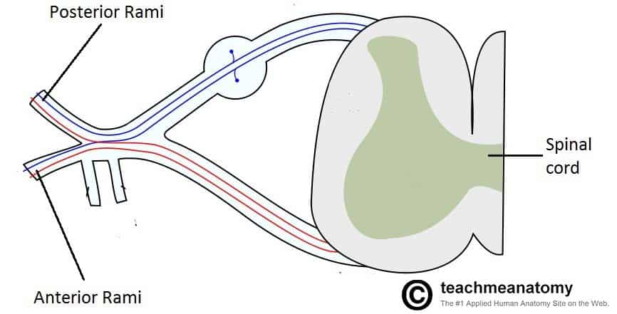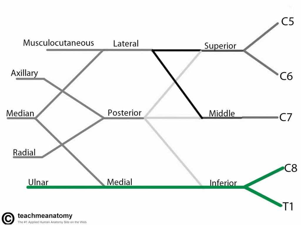 The brachial plexus is a network of nerve fibres that supplies the skin and musculature of the upper limb. It begins in the root of the neck, passes through the axilla, and runs through the entire upper extremity. The plexus is formed by the anterior rami (divisions) of cervical spinal nerves C5, C6, C7 and C8, and the first thoracic spinal nerve, T1. In this article, we shall look at the anatomy of the brachial plexus – its formation and anatomical course through the body. The brachial plexus is divided into five parts; roots, trunks, divisions, cords and branches (a good mnemonic for this is Read That Damn Cadaver Book). There are no functional differences between these divisions – they are simply used to aid explanation of the brachial plexus. Pro Feature - 3D Model You've Discovered a Pro Feature Access our 3D Model Library Explore, cut, dissect, annotate and manipulate our 3D models to visualise anatomy in a dynamic, interactive way. Learn More Roots The ‘roots’ refer the anterior rami of the spinal nerves that comprise the brachial plexus. These are the anterior rami of spinal nerves C5, C6, C7, C8, and T1. At each vertebral level, paired spinal nerves arise. They leave the spinal cord via the intervertebral foramina of the vertebral column. Each spinal nerve then divides into an anterior and a posterior ramus. The roots of the brachial plexus are formed by the anterior rami of spinal nerves C5-T1 (the posterior divisions innervate the skin and musculature of the intrinsic back muscles). After their formation, these nerves pass between the anterior and medial scalene muscles to enter the base of the neck. By TeachMeSeries Ltd (2025) Fig 1Proximal portion of the brachial plexus in the neck. By TeachMeSeries Ltd (2025) Fig 2The spinal cord outflow at each vertebral level. The anterior rami of vertebral levels C5-C8 and T1 make up the roots of the brachial plexus. Pro Feature - Dissection Images The root of the neck. The trunks of the brachial plexus are visible emerging between the anterior and middle scalene muscles. The root of the neck. The trunks of the brachial plexus are visible emerging between the anterior and middle scalene muscles. You've Discovered a Pro Feature Access our Dissection Image Library Enhance your understanding with high-resolution dissection images showcasing real-life anatomy. Learn More Trunks At the base of the neck, the roots of the brachial plexus converge to form three trunks. These structures are named by their relative anatomical location: Superior trunk – a combination of C5 and C6 roots. Middle trunk – continuation of C7. Inferior trunk – combination of C8 and T1 roots. The trunks traverse laterally, crossing the posterior triangle of the neck. Divisions Each trunk divides into two branches within the posterior triangle of the neck. One division moves anteriorly (toward the front of the body) and the other posteriorly (towards the back of the body). Thus, they are known as the anterior and posterior divisions. We now have three anterior and three posterior nerve fibres. These divisions leave the posterior triangle and pass into the axilla. They recombine into the cords of the brachial plexus. Cords Once the anterior and posterior divisions have entered the axilla, they combine together to form three cords, named by their position relative to the axillary artery. The lateral cord is formed by: The anterior division of the superior trunk The anterior division of the middle trunk The posterior cord is formed by: The posterior division of the superior trunk The posterior division of the middle trunk The posterior division of the inferior trunk The medial cord is formed by: The anterior division of the inferior trunk. The cords give rise to the major branches of the brachial plexus. By TeachMeSeries Ltd (2025) Fig 3Diagrammatic representation of the brachial plexus. For simplicity, the smaller branches of the brachial plexus are not shown. The posterior divisions are shown in yellow, and anterior divisions in black. Major Branches In the axilla and the proximal aspect of the upper limb, the three cords give rise to five major branches. These nerves continue into the upper limb to provide innervation to the muscles and skin present. In this section, we shall concentrate on these five nerves. Note: these are only brief notes on the function of the nerves – for more detailed information click on the title to visit their respective pages. Musculocutaneous Nerve See more detailed information here. Roots: C5, C6, C7. Motor Functions: Innervates the brachialis, biceps brachii and coracobrachialis muscles. Sensory Functions: Gives off the lateral cutaneous branch of the forearm, which innervates the lateral half of the anterior forearm, and a small lateral portion of the posterior forearm. By TeachMeSeries Ltd (2025) Fig 4The derivation of the musculocutaneous nerve from the brachial plexus Axillary Nerve See more detailed information here. Roots: C5 and C6. Motor Functions: Innervates the teres minor and deltoid muscles. Sensory Functions: Gives off the superior lateral cutaneous nerve of arm, which innervates the inferior region of the deltoid (“regimental badge area”). By TeachMeSeries Ltd (2025) Fig 5The derivation of the axillary nerve from the brachial plexus. Median Nerve See more detailed information here. Roots: C6 – T1. (Also contains fibres from C5 in some individuals). Motor Functions: Innervates most of the flexor muscles in the forearm, the thenar muscles, and the two lateral lumbricals associated with the index and middle fingers. Sensory Functions: Gives off the palmar cutaneous branch, which innervates the lateral part of the palm, and the digital cutaneous branch, which innervates the lateral three and a half fingers on the anterior (palmar) surface of the hand. By TeachMeSeries Ltd (2025) Fig 6The derivation of the median nerve from the brachial plexus Radial Nerve See more detailed information here. Roots: C5 – T1. Mot