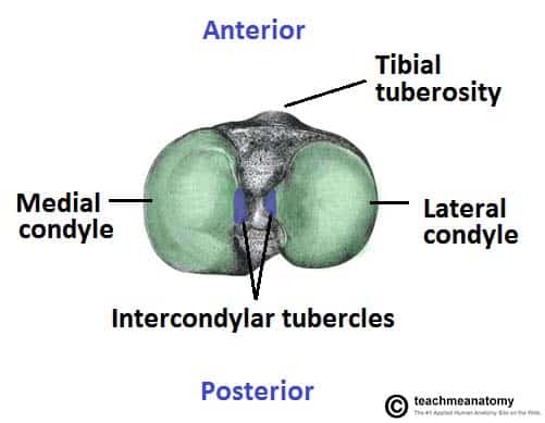 The tibia is the main bone of the lower leg, forming what is more commonly known as the shin. It expands at its proximal and distal ends; articulating at the knee and ankle joints respectively. The tibia is the second largest bone in the body and it is a key weight-bearing structure. In this article, we shall look at anatomy of the tibia – its bony landmarks, articulations and clinical correlations. By Anatomography [CC-BY-SA-2.1-jp], via Wikimedia Commons Fig 1Overview of the tibia in the human skeleton Pro Feature - 3D Model You've Discovered a Pro Feature Access our 3D Model Library Explore, cut, dissect, annotate and manipulate our 3D models to visualise anatomy in a dynamic, interactive way. Learn More Proximal The proximal tibia is widened by the medial and lateral condyles, which aid in weight-bearing. The condyles form a flat surface, known as the tibial plateau. This structure articulates with the femoral condyles to form the key articulation of the knee joint. Located between the condyles is a region called the intercondylar eminence – this projects upwards on either side as the medial and lateral intercondylar tubercles. This area is the main site of attachment for the ligaments and the menisci of the knee joint. The intercondylar tubercles of the tibia articulate with the intercondylar fossa of the femur. By TeachMeSeries Ltd (2025) Fig 2The tibial plateau. The tibial condyles articulate with the femoral condyles to form the knee joint. Shaft The shaft of the tibia is prism-shaped, with three borders and three surfaces; anterior, posterior and lateral. For brevity, only the anatomically and clinically important borders/surfaces are mentioned here. Anterior border – palpable subcutaneously down the anterior surface of the leg as the shin. The proximal aspect of the anterior border is marked by the tibial tuberosity; the attachment site for the patella ligament. Posterior surface – marked by a ridge of bone known as soleal line. This line is the site of origin for part of the soleus muscle, and extends inferomedially, eventually blending with the medial border of the tibia. There is usually a nutrient artery proximal to the soleal line. Lateral border – also known as the interosseous border. It gives attachment to the interosseous membrane that binds the tibia and the fibula together. By TeachMeSeries Ltd (2025) Fig 3Bony landmarks of the tibial shaft. Clinical Relevance Intraosseous Access Intraosseous access is a form of vascular access used in the emergency setting. It allows the administration of fluids, blood products and medications directly into the bone marrow. IO access is typically used in an emergency when intravenous access is not obtainable. There are two main sites in the tibia that are suitable for IO access: Anteromedial surface, 2-3cm below the tibial tuberosity Proximal to the medial malleolus Complications of IO access include osteomyelitis, iatrogenic fracture and compartment syndrome. IO infusions should be discontinued when IV access has been achieved. Distal The distal end of the tibia widens to assist with weight-bearing. The medial malleolus is a bony projection continuing inferiorly on the medial aspect of the tibia. It articulates with the tarsal bones to form part of the ankle joint. On the posterior surface of the tibia, there is a groove through which the tendon of tibialis posterior passes. Laterally is the fibular notch, where the fibula is bound to the tibia – forming the distal tibiofibular joint. Clinical Relevance Fractures of the Tibia Fractures of the tibia are relatively common. There are two main types: High energy trauma – occurs predominantly in the younger population. Low energy trauma or insufficiency fractures – occurs predominantly in the elderly. Fractures most commonly occur at the shaft of the tibia, and are typically associated with fibula fractures. Fractures of the proximal tibia are known as tibial plateau fractures; the condyles may be broken and injury to the menisci and ligaments of the knee is not uncommon. These fractures are classified using the Schatzker classification, and if very displaced will likely required operative management. It is important to monitor patients for signs of compartment syndrome in the pre-and post-operative phases. At the ankle, the medial malleolus can be fractured. This is caused by the ankle being twisted inwards (over-inversion) – the talus of the foot is forced against the medial malleolus, causing a spiral fracture. This rarely happens in isolation and typically the lateral malleolus is also fractured; potentially producing an unstable fracture that requires operative management. By James Heilman, MD [CC-BY-SA-3.0], via Wikimedia Commons Fig 4Fracture of the medial malleolus (black arrow) in a child, with the whiting arrow marking a normal growth plate. This is a Salter Harris type III fracture. Do you think you’re ready? Take the quiz below Pro Feature - Quiz The Tibia Question 1 of 3 Submitting... Skip Next Rate question: You scored 0% Skipped: 0/3 1800 More Questions Available Upgrade to TeachMeAnatomy Pro Challenge yourself with over 1800 multiple-choice questions to reinforce learning Learn More Rate This Article