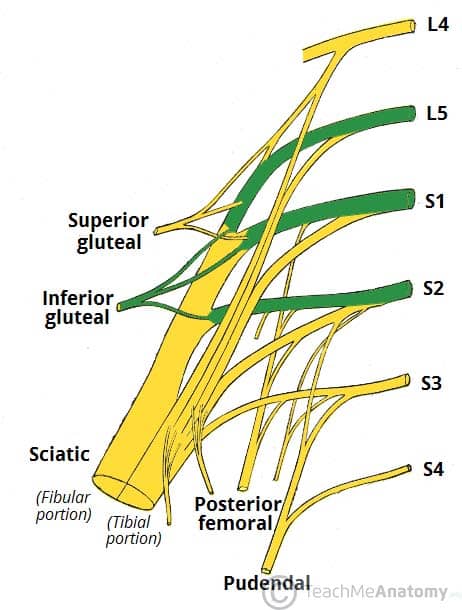 The sacral plexus is a network of nerve fibres that supplies the skin and muscles of the pelvis and lower limb. It is located on the surface of the posterior pelvic wall, anterior to the piriformis muscle. The plexus is formed by the anterior rami (divisions) of the sacral spinal nerves S1, S2, S3 and S4. It also receives contributions from the lumbar spinal nerves L4 and L5. In this article, we shall look at the anatomy of the sacral plexus – its formation and major branches. Pro Feature - 3D Model You've Discovered a Pro Feature Access our 3D Model Library Explore, cut, dissect, annotate and manipulate our 3D models to visualise anatomy in a dynamic, interactive way. Learn More Spinal Nerves The spinal nerves S1 – S4 form the basis of the sacral plexus. At each vertebral level, paired spinal nerves leave the spinal cord via the intervertebral foramina of the vertebral column. Each nerve then divides into anterior and posterior nerve fibres. The sacral plexus begins as the anterior fibres of the spinal nerves S1, S2, S3, and S4. They are joined by the 4th and 5th lumbar roots, which combine to form the lumbosacral trunk. This descends into the pelvis to meet the sacral roots as they emerge from the spinal cord. By TeachMeSeries Ltd (2025) Fig 1The spinal cord outflow at each vertebral level. The anterior rami of vertebral levels S1-S4 make up the roots of the sacral plexus. The Branches The anterior rami of the S1-S4 spinal roots (and the lumbosacral trunk) divide into several cords. These cords then combine together to form the five major peripheral nerves of the sacral plexus. These nerves then descend down the posterior pelvic wall. They have two main destinations: Leave the pelvis via the greater sciatic foramen – these nerves enter the gluteal region of the lower limb, innervating the structures there. Remain in the pelvis – these nerves innervate the pelvic muscles, organs and perineum. We shall now consider the branches of the sacral plexus. (Note: In this article we shall include only brief notes on the function of these nerves – for more detailed information click on the title to visit their respective pages) By TeachMeSeries Ltd (2025) Fig 2The right lumbar plexus and the left sacral plexus. Superior Gluteal Nerve The superior gluteal nerve leaves the pelvis via the greater sciatic foramen, entering the gluteal region superiorly to the piriformis muscle. It is accompanied by the superior gluteal artery and vein for much of its course. Roots: L4, L5, S1. Motor Functions: Innervates the gluteus minimus, gluteus medius and tensor fascia lata. Sensory Functions: None. A useful memory aid for the major branches of the sacral plexus is ‘Some Irish Sailor Pesters Polly’. This stands for Superior Gluteal, Inferior Gluteal, Sciatic, Posterior cutaneous nerve of thigh, Pudendal. By TeachMeSeries Ltd (2025) Fig 3Derivation of the superior gluteal nerve from the sacral plexus Inferior Gluteal Nerve The inferior gluteal nerve leaves the pelvis via the greater sciatic foramen, entering the gluteal region inferiorly to the piriformis muscle. It is accompanied by the inferior gluteal artery and vein for much of its course. Roots: L5, S1, S2. Motor Functions: Innervates gluteus maximus. Sensory Functions: None. By TeachMeSeries Ltd (2025) Fig 4Derivation of the inferior gluteal nerve from the lumbar plexus Sciatic Nerve See more detailed information here Roots: L4, L5, S1, S2, S3 Motor Functions: Tibial portion – Innervates the muscles in the posterior compartment of the thigh (apart from the short head of the biceps femoris), and the hamstring component of adductor magnus. Innervates all the muscles in the posterior compartment of the leg and sole of the foot. Common fibular portion – Short head of biceps femoris, all muscles in the anterior and lateral compartments of the leg and extensor digitorum brevis. Sensory Functions: Tibial portion: supplies the skin of the posterolateral leg, lateral foot and the sole of the foot. Common fibular portion: supplies the skin of the lateral leg and the dorsum of the foot. For more details about the Tibial nerve, click here. For more details about the Common Fibular nerve, click here. By TeachMeSeries Ltd (2025) Fig 5Derivation of the sciatic nerve from the sacral plexus. Posterior Femoral Cutaneous The posterior cutaneous nerve of thigh leaves the pelvis via the greater sciatic foramen, entering the gluteal region inferiorly to the piriformis muscle. It descends deep to the gluteus maximus and runs down the back of the thigh to the knee. Roots: S1, S2, S3 Motor Functions: None Sensory Functions: Innervates the skin on the posterior surface of the thigh and leg. Also innervates the skin of the perineum. By TeachMeSeries Ltd (2025) Fig 6Derivation of the posterior cutaneous nerve. Pudendal Nerve This nerve leaves the pelvis via the greater sciatic foramen, then re-enters via the lesser sciatic foramen. It moves anterosuperiorly along the lateral wall of the ischiorectal fossa, and terminates by dividing into several branches. Roots: S2, S3, S4 Motor Functions: Innervates the skeletal muscles in the perineum, the external urethral sphincter, the external anal sphincter, levator ani. Sensory Functions: Innervates the penis and the clitoris and most of the skin of the perineum. (Tip – an easy way to remember the functions of the pudendal nerve is S2, S3, S4 keeps poo off the floor!) By TeachMeSeries Ltd (2025) Fig 7Derivation of the pudendal nerve from the sacral plexus Other Branches In addition to the five major nerves of the sacral plexus, there are a number of smaller branches. These tend to be nerves that directly supplying muscles (with the exception of the perforating cutaneous nerve, which supplies the skin over the inferior gluteal region and the pelvic splanchnic nerves, which innervate the abdominal viscera): Nerve to piriformis Nerve to obturator internus Nerve to quadratus femoris Clinical Relevance Lumbosacral Plexopathy A l
