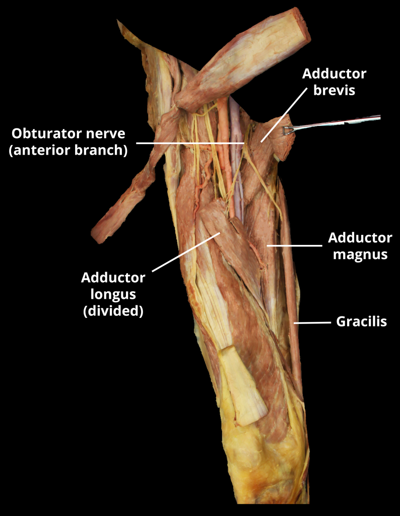 The obturator nerve is a major peripheral nerve of the lower limb. In this article, we shall look at the anatomy of the obturator nerve – its anatomical course, functions and clinical correlations. Pro Feature - 3D Model You've Discovered a Pro Feature Access our 3D Model Library Explore, cut, dissect, annotate and manipulate our 3D models to visualise anatomy in a dynamic, interactive way. Learn More Overview Nerve roots: L2-L4 Motor functions: Innervates the muscles of the medial compartment of the thigh (obturator externus, adductor longus, adductor brevis, adductor magnus and gracilis). Sensory functions: Cutaneous branches of the obturator nerve innervate the skin of the medial thigh. By TeachMeSeries Ltd (2025) Fig 1Derivation of the obturator nerve from the lumbar plexus Pro Feature - Dissection Images Prosection of the muscles of the medial compartment of the thigh. The adductor longus has been divided and reflected back to reveal the underlying structures. The anterior branch of the obturator nerve runs anterior to the adductor brevis. Prosection of the muscles of the medial compartment of the thigh. The adductor longus has been divided and reflected back to reveal the underlying structures. The anterior branch of the obturator nerve runs anterior to the adductor brevis. You've Discovered a Pro Feature Access our Dissection Image Library Enhance your understanding with high-resolution dissection images showcasing real-life anatomy. Learn More Anatomical Course The obturator nerve is formed from the lumbar plexus. It receives fibres from the anterior divisions of L2, L3 and L4. After its formation, the obturator nerve descends through the fibres of the psoas major and emerges from its medial border. It then travels posteriorly to the common iliac arteries and laterally along the pelvic wall – towards the obturator foramen of the pelvis. The obturator nerve enters the medial thigh via the obturator canal (formed within the obturator foramen by the obturator membrane). It then divides into anterior and posterior branches: Anterior division (anterior to the adductor brevis): Descends in a plane between the adductor longus and adductor brevis (towards the femoral artery). Here, it supplies motor fibres to the adductor longus, adductor brevis and gracilis. It can also supply the pectineus muscle. It then pierces the fascia lata to become the cutaneous branch of the obturator nerve. Posterior division (posterior to the adductor brevis): Pierces the obturator externus muscle, and then descends in a plane between the adductor brevis and adductor magnus. Innervates the obturator externus and adductor magnus muscles. By TeachMeSeries Ltd (2025) Fig 2The obturator canal, formed by the obturator membrane within the obturator foramen of the pelvis. By TeachMeSeries Ltd (2025) Fig 3View of the medial thigh, with the course of the obturator nerve highlighted. Motor Functions The obturator nerve innervates all the muscles in the medial compartment of the thigh – except the hamstring part of the adductor magnus (innervated by the tibial nerve). They are collectively known as the hip adductors: Adductor longus – adducts thigh Adductor brevis – adducts thigh Adductor magnus: Adductor part – adducts and flexes thigh Hamstring part – extends thigh Gracilis – adducts thigh Obturator externus – laterally rotates thigh By TeachMeSeries Ltd (2025) Fig 4Muscles of the medial thigh. The overlying muscles in the anterior compartment have been removed. Sensory Function The cutaneous branch of the obturator nerve supplies the skin of the middle part of the medial thigh. By TeachMeSeries Ltd (2025) Fig 5Image of the cutaneous distribution of the anterior thigh, with the area supplied by the obturator nerve highlighted. Clinical Relevance Damage to the Obturator Nerve The obturator nerve can be damaged during surgery involving the pelvis or abdomen. Symptoms include numbness and paraesthesia on the medial aspect of the thigh and weakness in adduction of the thigh. Alternatively, the patient could present with posture and gait problems due to the loss of adduction. Obturator Nerve Block Obturator nerve block is used in the management of pain after lower limb surgery or for chronic hip pain. The anaesthetic is injected inferior to the pubic tubercle and lateral to the tendon of the adductor longus muscle. This procedure can also be carried out under ultrasound guidance. Do you think you’re ready? Take the quiz below Pro Feature - Quiz The Obturator Nerve Question 1 of 3 Submitting... Skip Next Rate question: You scored 0% Skipped: 0/3 1800 More Questions Available Upgrade to TeachMeAnatomy Pro Challenge yourself with over 1800 multiple-choice questions to reinforce learning Learn More Rate This Article