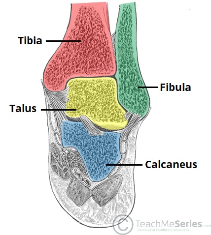 The ankle joint (or talocrural joint) is a synovial joint located in the lower limb. It is formed by the bones of the leg (tibia and fibula) and the foot (talus). Functionally, it is a hinge type joint, permitting dorsiflexion and plantarflexion of the foot. In this article, we shall look at the anatomy of the ankle joint; its articulating surfaces, ligaments, movements, and clinical correlations. By TeachMeSeries Ltd (2025) Fig 1The bones of the ankle joint; tibia, fibula and talus. Note that the calcaneous is not considered part of the ankle joint. Pro Feature - 3D Model You've Discovered a Pro Feature Access our 3D Model Library Explore, cut, dissect, annotate and manipulate our 3D models to visualise anatomy in a dynamic, interactive way. Learn More Articulating Surfaces The ankle joint is formed by three bones; the tibia and fibula of the leg, and the talus of the foot: The tibia and fibula are bound together by strong tibiofibular ligaments. Together, they form a bracket shaped socket, covered in hyaline cartilage. This socket is known as a mortise. The body of the talus fits snugly into the mortise formed by the bones of the leg. The articulating part of the talus is wedge shaped – it is broad anteriorly, and narrow posteriorly: Dorsiflexion – the anterior part of the talus is held in the mortise, and the joint is more stable. Plantarflexion – the posterior part of the talus is held in the mortise, and the joint is less stable. By TeachMeSeries Ltd (2025) Fig 2X-ray of a normal ankle joint. Note the bracket shaped socket formed by the tibia and fibula. By TeachMeSeries Ltd (2025) Fig 3The talus. It is broad anteriorly, which strengthens the joint during dorsiflexion. Ligaments There are two main sets of ligaments, which originate from each malleolus. Medial Ligament The medial ligament (or deltoid ligament) is attached to the medial malleolus (a bony prominence projecting from the medial aspect of the distal tibia). It consists of four ligaments, which fan out from the malleolus, attaching to the talus, calcaneus and navicular bones. The primary action of the medial ligament is to resist over-eversion of the foot. Lateral Ligament The lateral ligament originates from the lateral malleolus (a bony prominence projecting from the lateral aspect of the distal fibula). It resists over-inversion of the foot, and is comprised of three distinct and separate ligaments: Anterior talofibular – spans between the lateral malleolus and lateral aspect of the talus. Posterior talofibular – spans between the lateral malleolus and the posterior aspect of the talus. Calcaneofibular – spans between the lateral malleolus and the calcaneus. By OpenStax College [CC BY 3.0], via Wikimedia Commons Fig 4Ligaments of the ankle joint. Clinical Relevance The Ankle ‘Ring’ The ankle joint and associated ligaments can be visualised as a ring in the coronal plane: The upper part of the ring is formed by the articular surfaces of the tibia and fibula. The lower part of the ring is formed by the subtalar joint (between the talus and the calcaneus). The sides of the ring are formed by the medial and lateral ligaments. A ring, when broken, usually breaks in two places (the best way of illustrating this is with a polo mint – it is very difficult to break one side without breaking the other). When dealing with an injury to the ankle joint, a clinician must bear this in mind. For example, a fracture of the ankle joint may occur in association with ligament damage (which would not be apparent on x-ray). Movements and Muscles Involved The ankle joint is a hinge type joint, with movement permitted in one plane. Thus, plantarflexion and dorsiflexion are the main movements that occur at the ankle joint. Eversion and inversion are produced at the other joints of the foot, such as the subtalar joint. Plantarflexion – produced by the muscles in the posterior compartment of the leg (gastrocnemius, soleus, plantaris and posterior tibialis). Dorsiflexion – produced by the muscles in the anterior compartment of the leg (tibialis anterior, extensor hallucis longus and extensor digitorum longus). Neurovascular Supply The arterial supply to the ankle joint is derived from the malleolar branches of the anterior tibial, posterior tibial and fibular arteries. Innervation is provided by tibial, superficial fibular and deep fibular nerves. Clinical Relevance Ankle Sprain An ankle sprain refers to partial or complete tears in the ligaments of the ankle joint. It usually occurs via excessive inversion to a plantarflexed and weight-bearing foot. The lateral ligament is more likely to be damaged for two main reasons: The lateral ligament is weaker than the medial ligament. The lateral ligament resists inversion. The anterior talofibular ligament is the lateral ligament most at risk of irreversible damage. Clinical Relevance Pott’s Fracture-Dislocation A Pott’s fracture is a term used to describe a bimalleolar (medial and lateral malleoli) or trimalleolar (medial and lateral malleoli, and distal tibia) fracture. This type of injury is produced by forced eversion of the foot. It occurs in a series of stages: Forced eversion pulls on the medial ligaments, producing an avulsion fracture of the medial malleolus. The talus moves laterally, breaking off the lateral malleolus. The tibia is then forced anteriorly, shearing off the distal and posterior part against the talus. By Steven Fruitsmaak [CC BY-SA 3.0], from Wikimedia Commons Fig 5Bimalleolar fracture of the ankle. 1 – Fibula, 2 – Tibia. Do you think you’re ready? Take the quiz below Pro Feature - Quiz The Ankle Joint Question 1 of 3 Submitting... Skip Next Rate question: You scored 0% Skipped: 0/3 1800 More Questions Available Upgrade to TeachMeAnatomy Pro Challenge yourself with over 1800 multiple-choice questions to reinforce learning Learn More Rate This Article