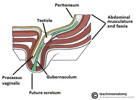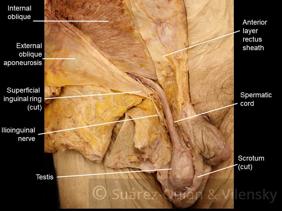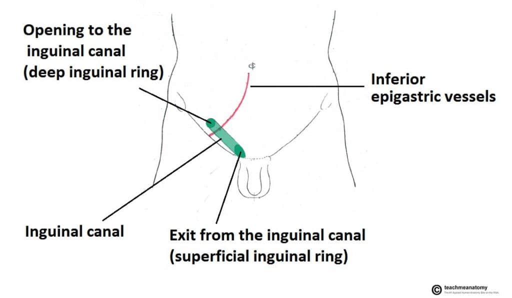 The inguinal canal is a short passage that extends inferiorly and medially through the inferior part of the abdominal wall. It is superior and parallel to the inguinal ligament. The canal serves as a pathway by which structures can pass from the abdominal wall to the external genitalia. It is of clinical importance as a potential weakness in the abdominal wall, and thus a common site of herniation. In this article, we shall look at the anatomy of the inguinal canal – its development, borders and contents. By TeachMeSeries Ltd (2025) Fig 1Overview of the inguinal canal. Clinically it is important to note that the opening to the inguinal canal is located laterally to the inferior epigastric artery. Pro Feature - 3D Model You've Discovered a Pro Feature Access our 3D Model Library Explore, cut, dissect, annotate and manipulate our 3D models to visualise anatomy in a dynamic, interactive way. Learn More Development of the Inguinal Canal During development, the tissue that will become gonads (either testes or ovaries) establish in the posterior abdominal wall, and descend through the abdominal cavity. A fibrous cord of tissue called the gubernaculum attaches the inferior portion of the gonad to the future scrotum or labia, and guides them during their descent. The inguinal canal is the pathway by which the testes (in an individual with an XY karyotype) leave the abdominal cavity and enter the scrotum. In the embryological stage, the canal is flanked by an out-pocketing of the peritoneum (processus vaginalis) and the abdominal musculature. The processus vaginalis normally degenerates, but a failure to do so can cause an indirect inguinal hernia, a hydrocele, or interfere with the descent of the testes. The gubernaculum (once it has shortened in the process of the descent of the testes) becomes a small scrotal ligament, tethering the testes to the scrotum and limiting their movement. Individuals with an XX karyotype also have a gubernaculum, which attaches the ovaries to the uterus and labia majora. Because the ovaries are attached to the uterus by the gubernaculum, they are prevented from descending as far as the testes, instead moving into the pelvic cavity. The gubernaculum then becomes two structures in the adult: the ovarian ligament and round ligament of uterus By TeachMeSeries Ltd (2025) Fig 2The descent and embryological development of the testes. Note that the processus vaginalis normally regresses after the descent of the testes Mid-Inguinal Point and Midpoint of the Inguinal Ligament These two terms are mentioned frequently in this article, and are often (mistakenly) used interchangeably: Mid-inguinal point – halfway between the pubic symphysis and the anterior superior iliac spine. The femoral pulse can be palpated here. Midpoint of the inguinal ligament – halfway between the pubic tubercle and the anterior superior iliac spine (the two attachments of the inguinal ligament). The opening to the inguinal canal is located just above this point. By TeachMeSeries Ltd (2025) Fig 3Coronal view of the pelvis, demonstrating the mid-inguinal point and the midpoint of the inguinal ligament Boundaries The inguinal canal is bordered by anterior, posterior, superior (roof) and inferior (floor) walls. It has two openings – the superficial and deep rings. Walls Anterior wall – aponeurosis of the external oblique, reinforced by the internal oblique muscle laterally. Posterior wall – transversalis fascia. Roof – transversalis fascia, internal oblique, and transversus abdominis. Floor – inguinal ligament (a ‘rolled up’ portion of the external oblique aponeurosis), thickened medially by the lacunar ligament. During periods of increased intra-abdominal pressure, the abdominal viscera are pushed into the posterior wall of the inguinal canal. To prevent herniation of viscera into the canal, the muscles of the anterior and posterior wall contract, and ‘clamp down’ on the canal. By TeachMeSeries Ltd (2025) Fig 4The borders of the inguinal canal. The anterior wall of the left inguinal canal has been removed. DARTMOUTH MEDICAL SCHOOL Fig 5Sagittal view of the inguinal canal, showing the borders. Rings The two openings to the inguinal canal are known as rings. There are two rings – deep (internal) and superficial (external): Deep (internal) ring: Marks the internal opening of the inguinal canal Found above the midpoint of the inguinal ligament (lateral to the epigastric vessels). The ring is created by the transversalis fascia, which invaginates to form a covering of the contents of the inguinal canal. Superficial (external) ring: Marks the external end of the inguinal canal Lies just superior to the pubic tubercle. It is a triangle shaped opening, formed by the invagination of the external oblique, which forms another covering of the inguinal canal contents. It contains intercrural fibres, which run perpendicular to the aponeurosis of the external oblique and prevent the ring from widening. Contents The contents of the inguinal canal include: Spermatic cord (biological males only) – contains neurovascular and reproductive structures that supply and drain the testes. See here for more information. Round ligament (biological females only) – originates from the uterine horn and travels through the inguinal canal to attach at the labia majora. Ilioinguinal nerve – contributes towards the sensory innervation of the genitalia Note: only travels through part of the inguinal canal, exiting via the superficial inguinal ring (it does not pass through the deep inguinal ring) This is the nerve most at risk of damage during an inguinal hernia repair. Genital branch of the genitofemoral nerve – supplies the cremaster muscle and anterior scrotal skin in males, and the skin of the mons pubis and labia majora in females. The walls of the inguinal canal are usually collapsed around their contents, preventing other structures from potentially entering the canal and becoming stuck. Clinical Rele
