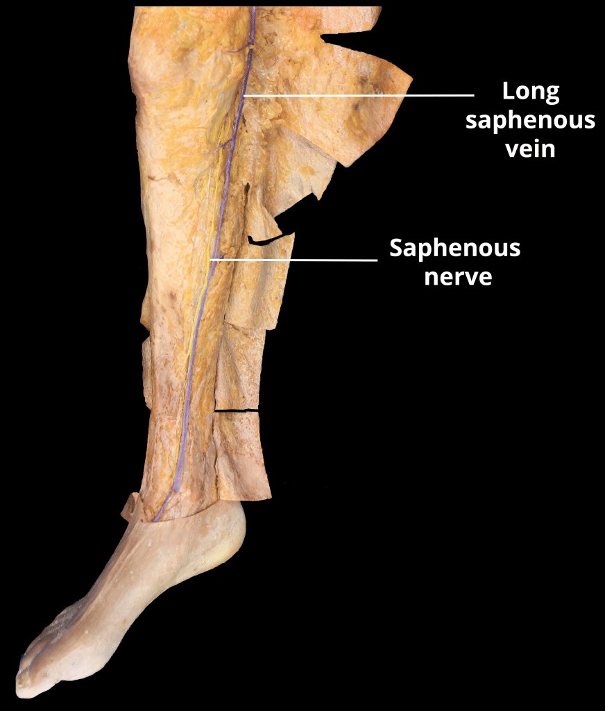 The saphenous nerve is a cutaneous branch of the femoral nerve in the lower limb. It supplies innervation to the skin of the medial knee, leg, and foot. Pro Feature - 3D Model You've Discovered a Pro Feature Access our 3D Model Library Explore, cut, dissect, annotate and manipulate our 3D models to visualise anatomy in a dynamic, interactive way. Learn More Course The saphenous nerve arises from the posterior division of the femoral nerve at the level of the mid-thigh. It accompanies the femoral artery within the adductor canal (a muscular tunnel located in the thigh). At the end of the canal, the adductor hiatus, the saphenous nerve pierces the fascia between the sartorius and gracilis muscles on the medial aspect of the knee. It then travels superficially along the medial side of the leg (accompanied by the long saphenous vein) – supplying the skin on the medial aspect of the knee, leg, and foot. By TeachMeSeries Ltd (2025) Fig 1 Anatomical course of the femoral nerve and its two cutaneous branches – anterior cutaneous fibres and saphenous nerve. Pro Feature - Dissection Images Medial aspect of the leg, demonstrating the long saphenous vein and saphenous nerve. Medial aspect of the leg, demonstrating the long saphenous vein and saphenous nerve. You've Discovered a Pro Feature Access our Dissection Image Library Enhance your understanding with high-resolution dissection images showcasing real-life anatomy. Learn More Sensory Functions The saphenous nerve supplies cutaneous innervation to the skin of the anteromedial knee, leg and foot. By TeachMeSeries Ltd (2025) Fig 2The cutaneous innervation of the branches of the femoral nerve. Rate This Article