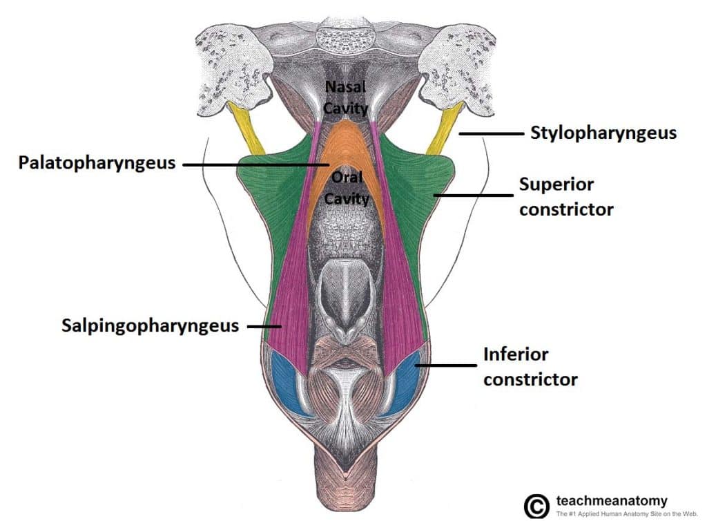 The palatopharyngeus is a muscle of the pharynx. It is also considered to be a muscle of the soft palate. Attachments: Originates from the hard palate of the oral cavity and inserts onto the pharyngeal wall. Actions: Elevates the pharynx during swallowing Innervation: Vagus nerve (CN X). Blood supply: Ascending pharyngeal artery (a branch of the external carotid artery) and tonsillar branch of the facial artery. By TeachMeSeries Ltd (2025) Fig 3Posterior view of the pharynx. The pharynx has been split down the midline and opened, to show the longitudinal muscles. Pro Feature - 3D Model You've Discovered a Pro Feature Access our 3D Model Library Explore, cut, dissect, annotate and manipulate our 3D models to visualise anatomy in a dynamic, interactive way. Learn More Rate This Article