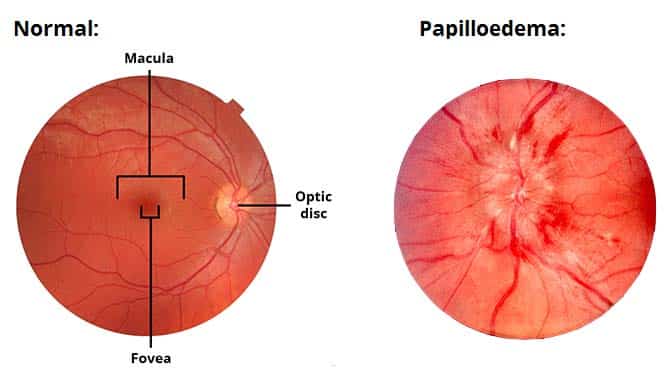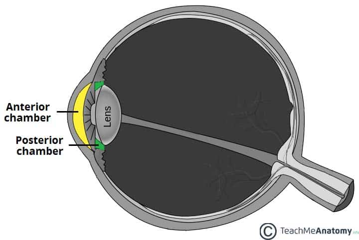 The eyeball is a bilateral and spherical organ, which houses the structures responsible for vision. It lies in a bony cavity within the facial skeleton – known as the bony orbit. Anatomically, the eyeball can be divided into three parts – the fibrous, vascular and inner layers. In this article, we shall consider the anatomy of the eyeball in detail, and its clinical correlations. Pro Feature - 3D Model You've Discovered a Pro Feature Access our 3D Model Library Explore, cut, dissect, annotate and manipulate our 3D models to visualise anatomy in a dynamic, interactive way. Learn More Layers of the Eyeball The eyeball is formed by three layers – fibrous, vascular and inner. Each of these layers has a specialised structure and function. Fibrous The fibrous layer of the eye is the outermost layer. It consists of the sclera and cornea, which are continuous with each other. Their main functions are to provide shape to the eye and support the deeper structures. The sclera comprises the majority of the fibrous layer (approximately 85%). It provides attachment to the extraocular muscles – these muscles are responsible for the movement of the eye. It is visible as the white part of the eye. The cornea is transparent and positioned centrally at the front of the eye. Light entering the eye is refracted by the cornea. By TeachMeSeries Ltd (2025) Fig 1.0The cornea and sclera of the eye. Vascular The vascular layer of the eye lies underneath the fibrous layer. It consists of the choroid, ciliary body and iris: Choroid – layer of connective tissue and blood vessels. It provides nourishment to the outer layers of the retina. Ciliary body – comprised of two parts – the ciliary muscle and ciliary processes. The ciliary muscle consists of a collection of smooth muscles fibres. These are attached to the lens of the eye by the ciliary processes. The ciliary body controls the shape of the lens, and contributes to the formation of aqueous humor Iris – circular structure, with an aperture in the centre (the pupil). The diameter of the pupil is altered by smooth muscle fibres within the iris, which are innervated by the autonomic nervous system. It is situated between the lens and the cornea. By TeachMeSeries Ltd (2025) Fig 1.1The vascular layer of the eye. Inner The inner layer of the eye is formed by the retina; its light detecting component. The retina is composed of two layers: Pigmented (outer) layer – formed by a single layer of cells. It is attached to the choroid and supports the choroid in absorbing light (preventing scattering of light within the eyeball). It continues around the whole inner surface of the eye. Neural (inner) layer – consists of photoreceptors, the light detecting cells of the retina. It is located posteriorly and laterally in the eye. Anteriorly, the pigmented layer continues but the neural layer does not – this is part is known as the non-visual retina. Posteriorly and laterally, both layers of the retina are present. This is the optic part of the retina. The optic part of the retina can be viewed during ophthalmoscopy. The centre of the retina is marked by an area known as the macula. It is yellowish in colour, and highly pigmented. The macula contains a depression called the fovea centralis, which has a high concentration of light detecting cells. It is the area responsible for high acuity vision. The area that the optic nerve enters the retina is known as the optic disc – it contains no light detecting cells. By TeachMeSeries Ltd (2025) Fig 1.1The optic part of the retina. Structures of the Eyeball Vitreous Body The vitreous body is a transparent gel which fills the posterior segment of the eyeball (the area posterior to the lens). It is marked by a narrow canal which runs from the optic disc to the lens – the hyaloid canal. This is a fetal remnant. The vitreous body has three main functions: Contributes to the magnifying power of the eye Supports the lens Holds the layers of the retina in place Lens The lens of the eye is located anteriorly, between the vitreous humor and the pupil. The shape of the lens is altered by the ciliary body, altering its refractive power. In old age, the lens can become opaque – a condition known as a cataract. Anterior and Posterior Chambers There are two fluid filled areas in the eye – known as the anterior and posterior chambers. The anterior chamber is located between the cornea and the iris, and the posterior chamber between the iris and ciliary processes. The chambers are filled with aqueous humor – a clear plasma-like fluid that nourishes and protects the eye. The aqueous humor is produced constantly, and drains via the trabecular meshwork, an area of tissue at the base of the cornea, near the anterior chamber. If the drainage of aqueous humor is obstructed, a condition known as glaucoma can result. By TeachMeSeries Ltd (2025) Fig 1.3Anterior and posterior chambers of the eye. Vasculature The eyeball receives arterial blood primarily via the ophthalmic artery. This is a branch of the internal carotid artery, arising immediately distal to the cavernous sinus. The ophthalmic artery gives rise to many branches, which supply different components of the eye. The central artery of the retina is the most important branch – supplying the internal surface of the retina. Occlusion of this artery will quickly result in blindness. Venous drainage of the eyeball is carried out by the superior and inferior ophthalmic veins. These drain into the cavernous sinus, a dural venous sinus in close proximity to the eye. Clinical Relevance Glaucoma Glaucoma refers to a group of eye diseases that result in damage to the optic nerve. There are two main clinical classifications of glaucoma: Open angle – where the outflow of aqueous humor through the trabecular meshwork is reduced. It causes a gradual reduction of the peripheral vision, until the end stages of the disease. Closed angle – where the iris is forced against the trabecular 