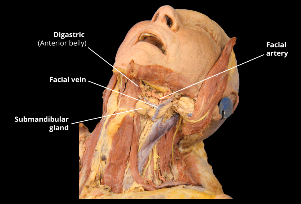 The submandibular glands are bilateral salivary glands located in the face. Their mixed serous and mucous salivary secretions are important for the lubrication of food during mastication to enable effective swallowing and aid digestion. In this article, we shall look at the anatomy of the submandibular gland – its location, blood supply and clinical correlations. Pro Feature - 3D Model You've Discovered a Pro Feature Access our 3D Model Library Explore, cut, dissect, annotate and manipulate our 3D models to visualise anatomy in a dynamic, interactive way. Learn More Anatomical Position The submandibular gland is located within the anterior part of the submandibular triangle. The boundaries of this triangle are: Superiorly: Inferior body of the mandible. Anteriorly: Anterior belly of the digastric muscle. Posteriorly: Posterior belly of the digastric muscle. Anatomical Structure Structurally, the submandibular glands are a pair of elongate, flattened hooks which have two sets of arms; superficial and deep. The positioning of these arms is in relation to the mylohyoid muscle, which the gland hooks around. Superficial arm – comprises the greater portion of the gland and lies partially inferior to the posterior half of the mandible, within an impression on its medial aspect (the submandibular fossa). It is situated outside the boundaries of the oral cavity. Deep arm – hooks around the posterior margin of mylohyoid through a triangular aperture to enter the oral cavity proper. It lies on the lateral surface of the hyoglossus, lateral to the root of the tongue. Secretions from the submandibular glands travel into the oral cavity via the submandibular duct (Wharton’s duct). This is approximately 5cm in length and emerges anteromedially from the deep arm of the gland between the mylohyoid, hypoglossus and genioglossus muscles. The duct ascends on its course to open as 1-3 orifices on a small sublingual papilla (caruncle) at the base of the lingual frenulum bilaterally. By TeachMeSeries Ltd (2025) Fig 1Submandibular triangle of the neck By TeachMeSeries Ltd (2025) Fig 2The superficial arm of the submandibular gland. Relationship with Nerves Both the submandibular gland and duct share an intimate anatomical relationship with three principal nerves; the lingual nerve, hypoglossal nerve and facial nerve (marginal mandibular branch). The courses of these nerves are briefly outlined: Lingual nerve: Beginning lateral to the submandibular duct, this nerve courses anteromedially by looping beneath the duct and then terminating as several medial branches. The terminal branches ascend on the external and superior surface of hypoglossus to provide general somatic afferent innervation to the mucus membrane of the anterior two-thirds of the tongue. Hypoglossal nerve: Lies deep to the submandibular gland and runs superficial to hyoglossus and deep to digastric muscle. Facial nerve (marginal mandibular branch): Exits the anterior-inferior portion of the parotid gland at the angle of the jaw and traverses the margin of the mandible in the plane between platysma and the investing layer of deep cervical fascia curving down inferior to the submandibular gland. Clinical Relevance Submandibular Gland Excision Submandibular gland excision is a common surgical procedure indicated for conditions such as submandibular gland neoplasia or recurrent calculi. By TeachMeSeries Ltd (2025) Fig 3The anatomical course of the hypoglossal nerve. As discussed previously, the gland and its duct lie in close proximity to three principal nerves, so the surgeon must be acutely aware of this regional anatomy. Consequences of the three nerve injuries are: Lingual nerve: Immediate post-operative ipsilateral parathesia and loss of taste from the anterior two-thirds of the tongue, which is rarely permanent. Hypoglossal nerve: Ipsilateral paresis or paralysis of the intrinsic muscles of the tongue leading to dysarthria and deviation of tongue to side of the lesion. This nerve is rarely injured in this procedure to an extent to produce noticeable disability. Facial nerve (marginal mandibular branch): Ipsilateral paresis or paralysis of the muscles supplying the lower lip and chin, including depressor labii inferioris, which characteristically presents as drooping of the lower lip. This is usually temporary, lasting for 6-12 weeks. Pro Feature - Dissection Images The submandibular gland and the overlying facial vessels. The submandibular gland and the overlying facial vessels. You've Discovered a Pro Feature Access our Dissection Image Library Enhance your understanding with high-resolution dissection images showcasing real-life anatomy. Learn More Vasculature The submandibular gland is supplied by the submental artery (branch of facial artery) and sublingual artery (branch of lingual artery). Its venous drainage is by two vessels: Facial vein – empties directly into the internal jugular vein. Sublingual vein – drains into the lingual vein and then internal jugular vein. Innervation The submandibular glands receive autonomic innervation through parasympathetic and sympathetic fibres, which directly and indirectly regulate salivary secretions respectively. Parasympathetic Parasympathetic innervation originates from the superior salivatory nucleus through pre-synaptic fibres, which travel via the chorda tympani branch of the facial nerve (CNVII). The chorda tympani then unifies with the lingual branch of the mandibular nerve (CNViii) before synapsing at the submandibular ganglion and suspending it by two nerve filaments. Post-ganglionic innervation consists of secretomotor fibres which directly induce the gland to produce secretions, and vasodilator fibres which accompany arteries to increase blood supply to the gland. Increased parasympathetic drive promotes saliva secretion. Sympathetic Sympathetic innervation originates from the superior cervical ganglion, where post-synaptic vasoconstrictive fibres travel as a plexus on the intern