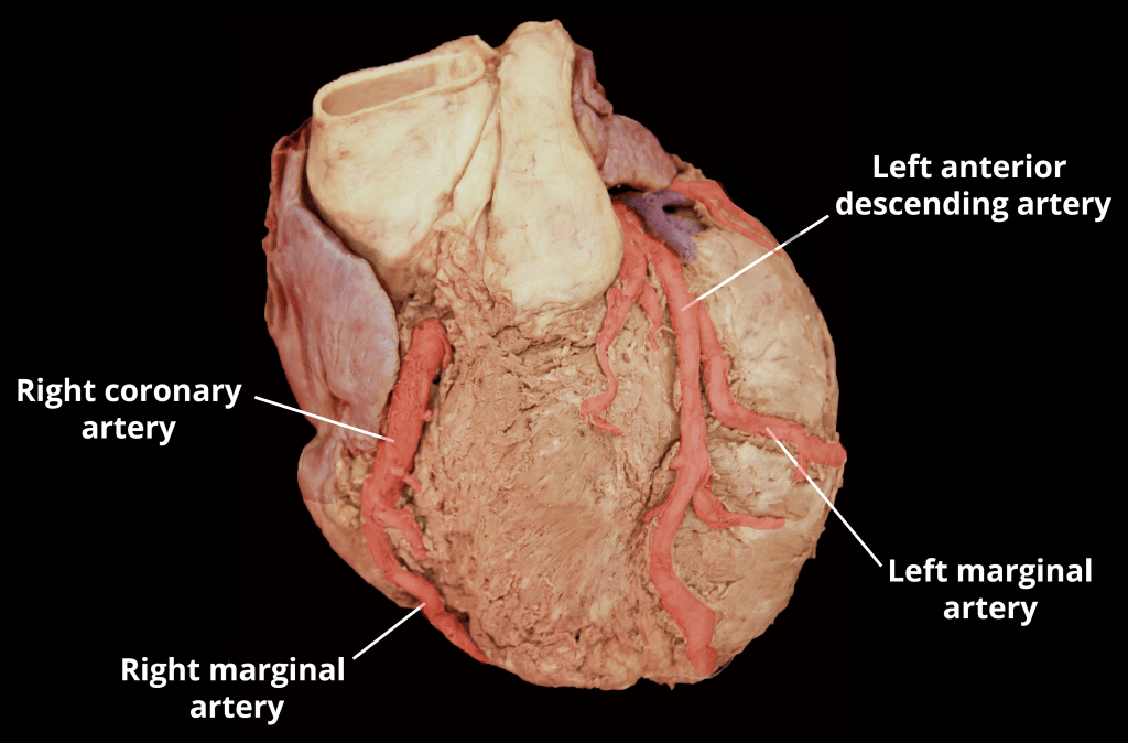 The entire body must be supplied with nutrients and oxygen via the circulatory system and the heart is no exception. The coronary circulation refers to the vessels that supply and drain the heart. Coronary arteries are named as such due to the way they encircle the heart, much like a crown. This article will outline the naming, distribution, and clinical relevance of vessels in the coronary circulation. Pro Feature - 3D Model You've Discovered a Pro Feature Access our 3D Model Library Explore, cut, dissect, annotate and manipulate our 3D models to visualise anatomy in a dynamic, interactive way. Learn More Naming Coronary Arteries There are two main coronary arteries which branch to supply the entire heart. They are named the left and right coronary arteries, and arise from the left and right aortic sinuses within the aorta. The aortic sinuses are small openings found within the aorta behind the left and right flaps of the aortic valve. When the heart is relaxed, the back-flow of blood fills these valve pockets, therefore allowing blood to enter the coronary arteries. The left coronary artery (LCA) initially branches to yield the left anterior descending (LAD), also called the anterior interventricular artery. The LCA also gives off the left marginal artery (LMA) and the left circumflex artery (Cx). In ~20-25% of individuals, the left circumflex artery contributes to the posterior interventricular artery (PIv). The right coronary artery (RCA) branches to form the right marginal artery (RMA) anteriorly. In 80-85% of individuals, it also branches into the posterior interventricular artery (PIv) posteriorly. By TeachMeSeries Ltd (2025) Fig 1Anterior view of the arterial supply to the heart. By TeachMeSeries Ltd (2025) Fig 2Overview of the branching structure of the coronary arteries. Cardiac Veins The venous drainage of the heart is mostly through the coronary sinus – a large venous structure located on the posterior aspect of the heart. The cardiac veins drain into the coronary sinus, which in turn, empties into the right atrium. There are also smaller cardiac veins which pass directly into the right atrium. The main tributaries of the coronary sinus are: Great cardiac vein (anterior interventricular vein) – the largest tributary of the coronary sinus. It originates at the apex of the heart and ascends in the anterior interventricular groove. It then curves to the left and continues onto the posterior surface of the heart. Here, it gradually enlarges to form the coronary sinus. Small cardiac vein – located on the anterior surface of the heart, in a groove between the right atrium and right ventricle. It travels within this groove onto the posterior surface of the heart, where it empties into the coronary sinus. Middle cardiac vein (posterior interventricular vein) – begins at the apex of the heart and ascends in the posterior interventricular groove to empty into the coronary sinus. Posterior cardiac vein – located on the posterior surface of the left ventricle. It lies to the left of the middle cardiac vein and empties into the coronary sinus. By TeachMeSeries Ltd (2025) Fig 3Anterior view of the venous drainage of the heart. Supplied by the great and small cardiac veins By TeachMeSeries Ltd (2025) Fig 4Posterior view of the heart, showing the venous drainage. Pro Feature - Dissection Images Anterior view of the coronary arteries. Anterior view of the coronary arteries. You've Discovered a Pro Feature Access our Dissection Image Library Enhance your understanding with high-resolution dissection images showcasing real-life anatomy. Learn More Distribution of the Coronary Arteries In general, the area of the heart which an artery passes over will be the area that it perfuses. The following describes the anatomical course of the coronary arteries. See Appendix A for a tabular overview of the arterial distribution. The RCA passes to the right of the pulmonary trunk and runs along the coronary sulcus before branching. The right marginal artery arises from the RCA and moves along the right and inferior border of the heart towards the apex. The RCA continues to the posterior surface of the heart, still running along the coronary sulcus. The posterior interventricular artery then arises from the RCA and follows the posterior interventricular groove towards the apex of the heart. The LCA passes between the left side of the pulmonary trunk and the left auricle. The LCA divides into the anterior interventricular branch and the circumflex branch. The anterior interventricular branch (LAD) follows the anterior interventricular groove towards the apex of the heart where it continues on the posterior surface to anastomose with the posterior interventricular branch. The circumflex branch follows the coronary sulcus to the left border and onto the posterior surface of the heart. This gives rise to the left marginal branch which follows the left border of the heart. By TeachMeSeries Ltd (2025) Fig 4Anterior view of territorial arterial supply to the heart. By TeachMeSeries Ltd (2025) Fig 5Posterior view of territorial arterial supply to the heart. Clinical Relevance Coronary Artery Disease Coronary artery disease or coronary heart disease (CHD) is a leading cause of death, both in the UK and worldwide. It describes a reduction in blood flow to the myocardium and has several causes and consequences. CHD can result in reduced blood flow to the heart as a result of narrowing or blockage of the coronary arteries. This may be due to atherosclerosis, thrombosis, high blood pressure, diabetes or smoking. All these factors lead to a reduced flow of blood to the heart through physical obstruction or changes in the vessel wall. Angina pectoris is one consequence of CHD. Angina pectoris describes the transient pain a person may feel on exercise as a result of lack of oxygen supplied to the heart. This pain is felt across the chest but is quickly resolved upon rest. Exercise is a trigger for angina as the co