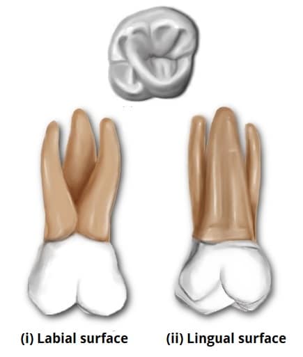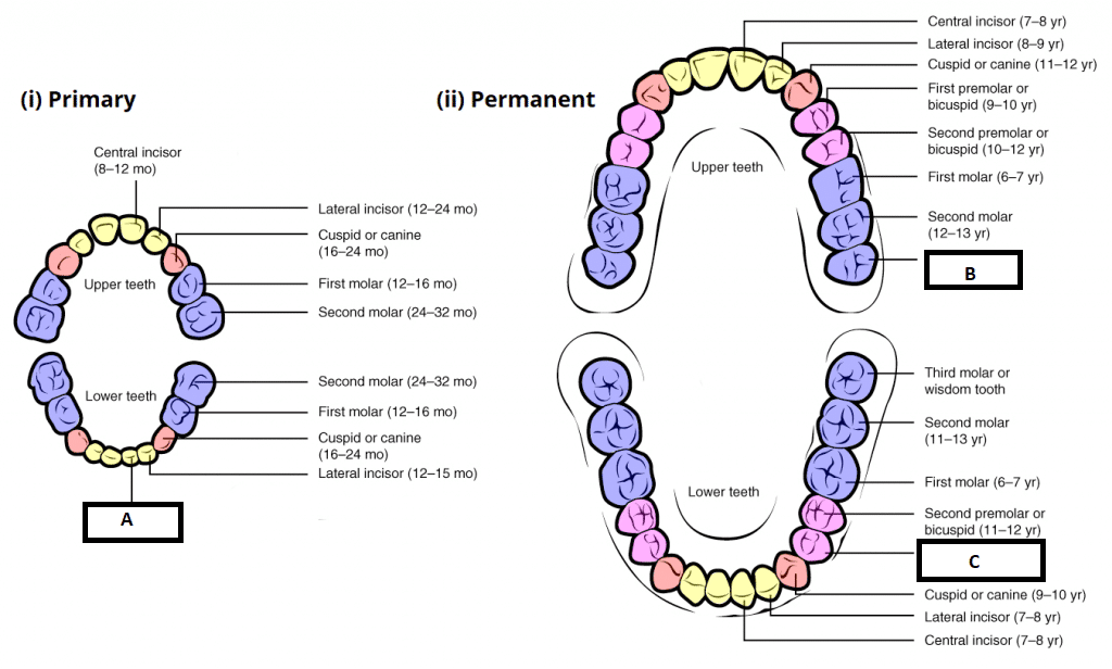 The human dentition is composed of two sets of teeth – primary and permanent. Teeth are organised into two opposing arches – maxillary (upper) and mandibular (lower). These can be divided down the midline (mid-sagittal plane) into left and right halves. Teeth are positioned in alveolar sockets and connected to the bone by a suspensory periodontal ligament. In this article, we shall look at the structure of teeth, identifying teeth, and primary vs permanent dentition. Pro Feature - 3D Model You've Discovered a Pro Feature Access our 3D Model Library Explore, cut, dissect, annotate and manipulate our 3D models to visualise anatomy in a dynamic, interactive way. Learn More Primary and Permanent Dentition The primary dentition is composed of 20 teeth, with 10 in each arch. There are five teeth in each quadrant, composed of two incisors (central and lateral), a canine, and two molars. These teeth are referred to as letters A, B, C, D and E. The primary teeth begin to erupt at 6 months of age. The permanent dentition is composed of 32 teeth with 16 in each arch. There are eight teeth in each quadrant, composed of two incisors (central and lateral), a canine, two premolars, and three molars. These teeth are referred to as numbers, 1 (central incisor) to 8 (3rd molar or ‘wisdom’ tooth). The permanent teeth begin to erupt, and replace the primary teeth, at 6 years of age. The permanent teeth complete eruption by approximately age 13 years – with the exception of the 3rd molar ‘wisdom’ teeth, which usually erupt by the age of 21 years. Adapted from work by OpenStax College [CC BY 3.0], via Wikimedia Common Fig 1Primary and permanent dentition. The eruption dates for each tooth are denoted in brackets. Tooth Structure A tooth can be divided into two main parts – the crown and the root. The part of a tooth which is visible in the mouth is referred to as the clinical crown, while the part which is not visible is, by definition, the clinical root. Anatomically, the crown and root can be distinguished based on their structure and the type of hard tooth tissue covering the external surface. Generally, the anatomic crown is covered by enamel, whilst the anatomic root is covered by cementum: Enamel is a robust, avascular hard tissue with a high mineral content. It is, in effect, designed to provide thermal insulation for a tooth, and to protect the internal vital tissues from destruction. Enamel is susceptible to dental caries, tooth wear and acid dissolution. Cementum is a softer, more sensitive tissue. It becomes visible if a tooth is extruded from the alveolar socket during a traumatic dental injury, and when periodontal disease (disease of the tooth supporting tissues) causes root exposure; a person becomes “long in the tooth”. A layer of dentine lies beneath the enamel and cementum, throughout the crown and root. Dentine is a vital, innervated tissue that accounts for the majority of the hard tooth structure. The part of the tooth where the dentine and enamel meet is called the dentino-enamel junction (DEJ). The boundary where the anatomic crown meets the anatomic root (where the enamel meets the cementum) is called the cemento-enamel junction (CEJ). The pulp cavity is the space within a tooth root that is filled with the vital dental pulp, a pink mass of innervated, vascular tissue. The end of the root is called the apex. The apical foramen is the space at the apex through which blood vessels and nerves enter the dental pulp, and through which pulp infection may enter the alveolus and surrounding soft tissues. Adapted from work by Time3000 and Ian Furst [CC-BY-SA-3.0], via Wikimedia Commonss Fig 2Tooth structure. The anatomic crown is covered by enamel, whilst the anatomic root is covered by cementum. Identifying Teeth There are four main types of teeth – incisors, canines, premolars, and molars. The premolars are only present in the permanent dentition. Note: There is an accepted order that is used when naming teeth: dentition, arch, quadrant, tooth type. E.g. permanent mandibular right lateral incisor. Incisors There are 8 incisors in both the primary and permanent dentition; 4 maxillary and 4 mandibular. Central and lateral incisors have straight edges that are designed to incise into food. They are located at the front of mouth with central incisors nearest the midline, and lateral incisors between the central incisors and the canines. Incisor teeth, particularly in the maxilla, are at risk of damage during a traumatic dental injury, due to their relatively unprotected position, and their size and shape. Traumatic dental injuries are common in childhood (at least 1 in 10 children are affected). The consequences of traumatic dental injuries can be significant in terms of function, aesthetics, dental anxiety, and quality of life for affected children and their carers. By Ανώνυμος Βικιπαιδιστής [CC BY 3.0], via Wikimedia Commons Fig 3Labial and lingual views of the maxillary central incisor. Canines There are 4 canines in both the primary and permanent dentition; 2 maxillary and 2 mandibular. They are located at corners of the mouth and have an incisal edge that has a sharp, triangular shaped projection. The function of the cusp is to pierce and hold food. They are sometimes referred to as cuspid teeth. Canines have long stable roots that withstand greater forces than incisors. Teenagers who experience dental crowding (the total width of the teeth exceeds the available width of the arch for the teeth to erupt in to) may present with unerupted canines. These are frequently located radiographically in the palate, or high the buccal sulcus. Oral surgery may be required to aid the eruption of these teeth. Premolars The permanent dentition has 8 premolars that generally have 2 cusps, but this is not always the case. They are sometimes referred to as bicuspid teeth. They are located between the canines and the molars, and they share some of the characteristics o