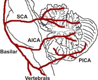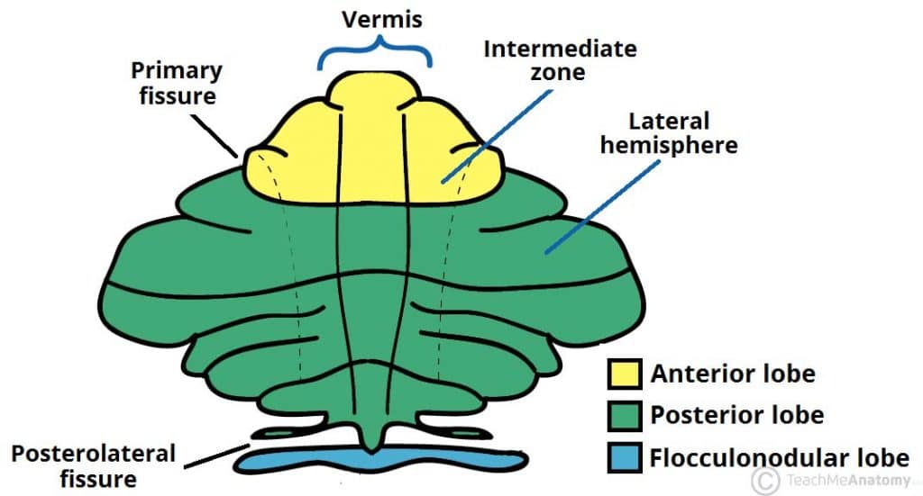 The cerebellum, which stands for “little brain”, is a structure of the central nervous system. It has an important role in motor control, with cerebellar dysfunction often presenting with motor signs. In particular, it is active in the coordination, precision and timing of movements, as well as in motor learning. During embryonic development, the anterior portion of the neural tube forms three parts that give rise to the brain and associated structures: Forebrain (prosencephalon) Midbrain (mesencephalon) Hindbrain (rhombencephalon) The hindbrain subsequently divides into the metencephalon (superior) and the myelencephalon (inferior). The cerebellum develops from the metencephalon division. This article will focus on the anatomy of the cerebellum. It will provide a brief overview of its functions and development, and finally it will highlight the clinical relevance of cerebellar disorders. Pro Feature - 3D Model You've Discovered a Pro Feature Access our 3D Model Library Explore, cut, dissect, annotate and manipulate our 3D models to visualise anatomy in a dynamic, interactive way. Learn More Anatomical Location The cerebellum is located at the back of the brain, immediately inferior to the occipital and temporal lobes, and within the posterior cranial fossa. It is separated from these lobes by the tentorium cerebelli, a tough layer of dura mater. It lies at the same level of and posterior to the pons, from which it is separated by the fourth ventricle. By TeachMeSeries Ltd (2025) Fig 1Anatomical position of the cerebellum. It is inferior to the cerebrum, and posterior to the pons. Anatomical Structure and Divisions The cerebellum consists of two hemispheres which are connected by the vermis, a narrow midline area. Like other structures in the central nervous system, the cerebellum consists of grey matter and white matter: Grey matter – located on the surface of the cerebellum. It is tightly folded, forming the cerebellar cortex. White matter – located underneath the cerebellar cortex. Embedded in the white matter are the four cerebellar nuclei (the dentate, emboliform, globose, and fastigi nuclei). There are three ways that the cerebellum can be subdivided – anatomical lobes, zones and functional divisions Anatomical Lobes There are three anatomical lobes that can be distinguished in the cerebellum; the anterior lobe, the posterior lobe and the flocculonodular lobe. These lobes are divided by two fissures – the primary fissure and posterolateral fissure. By TeachMeSeries Ltd (2025) Fig 2Anatomical lobes of the cerebellum. Zones There are three cerebellar zones. In the midline of the cerebellum is the vermis. Either side of the vermis is the intermediate zone. Lateral to the intermediate zone are the lateral hemispheres. There is no difference in gross structure between the lateral hemispheres and intermediate zones By Nrets [CC-BY-SA-3.0], from Wikimedia Commons Fig 3Superior view of an “unrolled” cerebellum, placing the vermis in one plane. Functional Divisions The cerebellum can also be divided by function. There are three functional areas of the cerebellum – the cerebrocerebellum, the spinocerebellum and the vestibulocerebellum. Cerebrocerebellum – the largest division, formed by the lateral hemispheres. It is involved in planning movements and motor learning. It receives inputs from the cerebral cortex and pontine nuclei, and sends outputs to the thalamus and red nucleus. This area also regulates coordination of muscle activation and is important in visually guided movements. Spinocerebellum – comprised of the vermis and intermediate zone of the cerebellar hemispheres. It is involved in regulating body movements by allowing for error correction. It also receives proprioceptive information. Vestibulocerebellum – the functional equivalent to the flocculonodular lobe. It is involved in controlling balance and ocular reflexes, mainly fixation on a target. It receives inputs from the vestibular system, and sends outputs back to the vestibular nuclei. Vasculature The cerebellum receives its blood supply from three paired arteries: Superior cerebellar artery (SCA) Anterior inferior cerebellar artery (AICA) Posterior inferior cerebellar artery (PICA) The SCA and AICA are branches of the basilar artery, which wraps around the anterior aspect of the pons before reaching the cerebellum. The PICA is a branch of the vertebral artery. Venous drainage of the cerebellum is by the superior and inferior cerebellar veins. They drain into the superior petrosal, transverse and straight dural venous sinuses. By TeachMeSeries Ltd (2025) Fig 4Arterial supply to the cerebellum. Clinical Relevance Cerebellar Dysfunction Dysfunction of the cerebellum can produce a wide range of symptoms and signs. The aetiology is varied; causes include stroke, physical trauma, tumours and chronic alcohol excess. The clinical picture is dependent on the functional area of the cerebellum that is affected. Damage to the cerebrocerebellum and spinocerebellum presents with problems in carrying out skilled and planned movements and in motor learning. A wide variety of manifestations are possible. These can be remembered using the acronym ‘DANISH‘: Dysdiadochokinesia (difficulty in carrying out rapid, alternating movements) Ataxia Nystagmus (coarse) Intention tremor Scanning speech Hypotonia Damage to the vestibulocerebellum can manifest with loss of balance, abnormal gait with a wide stance. By James Heilman, MD (Own work) [CC BY-SA 3.0], via Wikimedia Commons Fig 5CT scan of a left sided cerebellar stroke. Do you think you’re ready? Take the quiz below Pro Feature - Quiz The Cerebellum Question 1 of 3 Submitting... Skip Next Rate question: You scored 0% Skipped: 0/3 1800 More Questions Available Upgrade to TeachMeAnatomy Pro Challenge yourself with over 1800 multiple-choice questions to reinforce learning Learn More Rate This Article