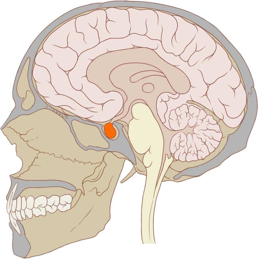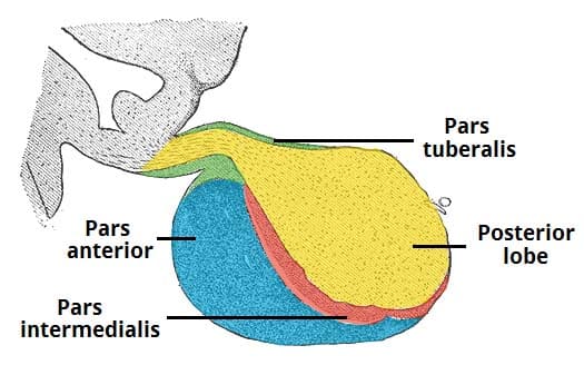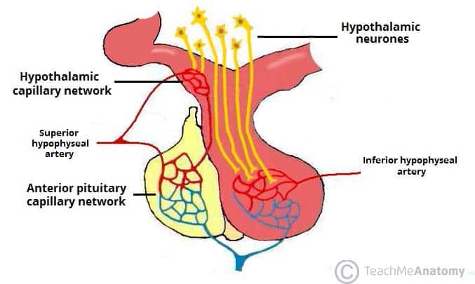 The pituitary gland (the hypophysis) is a major gland of the endocrine system. It secretes hormones that control the actions of other endocrine organs and various tissues around the body. In this article, we shall look at the anatomy of the pituitary gland – its position, structure and vascular supply. By Patrick J. Lynch, medical illustrator [CC BY-SA 3.0], via Wikimedia Commons Fig 1The pituitary gland. Pro Feature - 3D Model You've Discovered a Pro Feature Access our 3D Model Library Explore, cut, dissect, annotate and manipulate our 3D models to visualise anatomy in a dynamic, interactive way. Learn More Anatomical Position and Relations The pituitary gland is a pea-sized oval structure, suspended from the underside of the brain by the pituitary stalk (known as the infundibulum). It sits within a small depression in the sphenoid bone, known as the sella turcica (‘’Turkish saddle’’). The superior surface of the gland is covered by a reflection of the dura mater – the diaphragma sellae. This membrane has a central opening which allows passage of the infundibulum. The gland has several key anatomical relations: Anteriorly – sphenoid sinus (the pituitary gland is accessed surgically via the sphenoid sinus, known as a trans-sphenoidal approach). Posteriorly – posterior intercavernous sinus, dorsum sellae (posterior wall of the sella turcica), basilar artery and the pons. Superiorly – diaphragma sellae (fold of dura mater that covers the pituitary gland), optic chiasm. Inferiorly – sphenoid sinus Laterally – cavernous sinus. By TeachMeSeries Ltd (2025) Fig 2Anatomical position and relations of the pituitary gland. Clinical Significance: Pituitary Adenoma A pituitary adenoma is a neoplasm of the pituitary gland. These tumours are usually benign and can be divided into two categories: non-functional tumours and hormone secreting tumours. As the tumour increases in size, it can compress surrounding structures, such as the optic chiasm. A lesion of the optic chiasm characteristically produces a visual defect known as a bitemporal hemianopia. A pituitary tumour can also cause excessive hormone production, or insufficient hormone production (by destroying the normal glandular tissue). Definitive treatment of a pituitary adenoma is via trans-sphenoidal surgery. This technique involves gaining access to the gland via the nasal cavity and sphenoid sinus (which is located immediately inferiorly to the gland). Anatomical Structure Anatomically, the pituitary gland is a ‘’two-in-one’’ structure consisting of the anterior pituitary and the posterior pituitary. These parts have different embryonic origins and function very differently. Anterior Lobe The anterior lobe (adenohypophysis) is derived from an outpouching of the roof of the pharynx, called Rathke’s pouch. It is composed of glandular epithelium and secretes a number of hormones. The lobe can be further divided into three parts: Pars anterior – the largest part, responsible for hormone secretion. Pars intermedia – a thin epithelial layer that separates the pars anterior from the posterior lobe. Pars tuberalis – an upwards extension of the pars anterior that surrounds the anterolateral aspect of the infundibulum. The release of hormones is under the control of the hypothalamus, which communicates with the gland via neurotransmitters secreted into the hypophyseal portal vessels. These vessels ensure that the hypothalamic hormones remain concentrated, rather than being diluted in the systemic circulation. Posterior Lobe The posterior lobe (neurohypophysis) consists of nervous tissue. It arises from the embryonic forebrain, and is, in essence, an extension of the hypothalamus. Upon stimulation, the posterior lobe secretes two hormones – ADH (responsible for control of blood osmolarity), and oxytocin (involved in parturition and milk secretion). Both of these substances are produced in the supraoptic and paraventricular nuclei of the hypothalamus and then subsequently stored in the posterior pituitary gland, ready for release. By TeachMeSeries Ltd (2025) Fig 3The structure of the pituitary gland. Vasculature The vasculature of the pituitary gland is complex and unique. Whilst the anterior lobe and posterior lobe have the same venous drainage (anterior and posterior hypophyseal veins), they have an individual arterial supply: Anterior Pituitary The anterior pituitary gland receives arterial supply from the superior hypophyseal artery (a branch of the internal carotid artery). This vessel first forms a capillary network around the hypothalamus – blood from this network is then transported to a secondary capillary plexus surrounding the anterior pituitary. Known as the hypophyseal portal system, this structure allows the hypothalamus to communicate with the anterior pituitary via the release of neurotransmitters into the bloodstream. Posterior Pituitary The infundibulum and posterior pituitary gland receive a rich blood supply from many arteries. Of these, the major vessels are the superior hypophyseal artery, infundibular artery and inferior hypophyseal artery. By TeachMeSeries Ltd (2025) Fig 4The blood supply to the anterior and posterior lobes of the pituitary gland. Do you think you’re ready? Take the quiz below Pro Feature - Quiz The Pituitary Gland Question 1 of 3 Submitting... Skip Next Rate question: You scored 0% Skipped: 0/3 1800 More Questions Available Upgrade to TeachMeAnatomy Pro Challenge yourself with over 1800 multiple-choice questions to reinforce learning Learn More Rate This Article