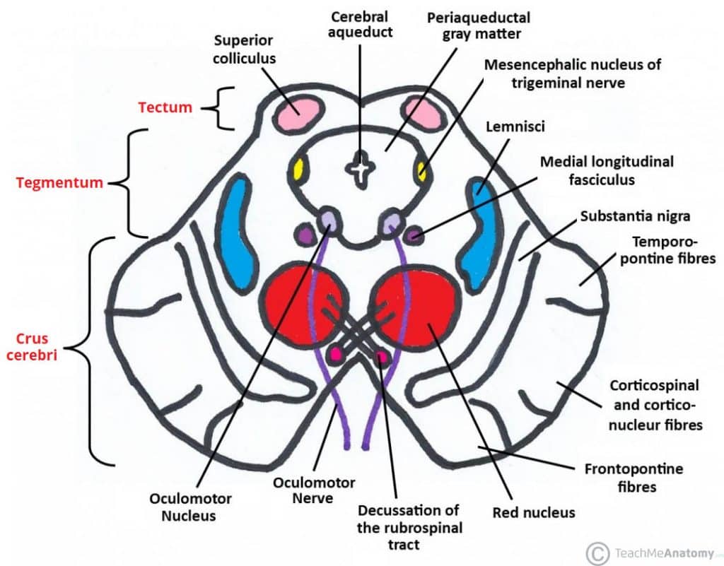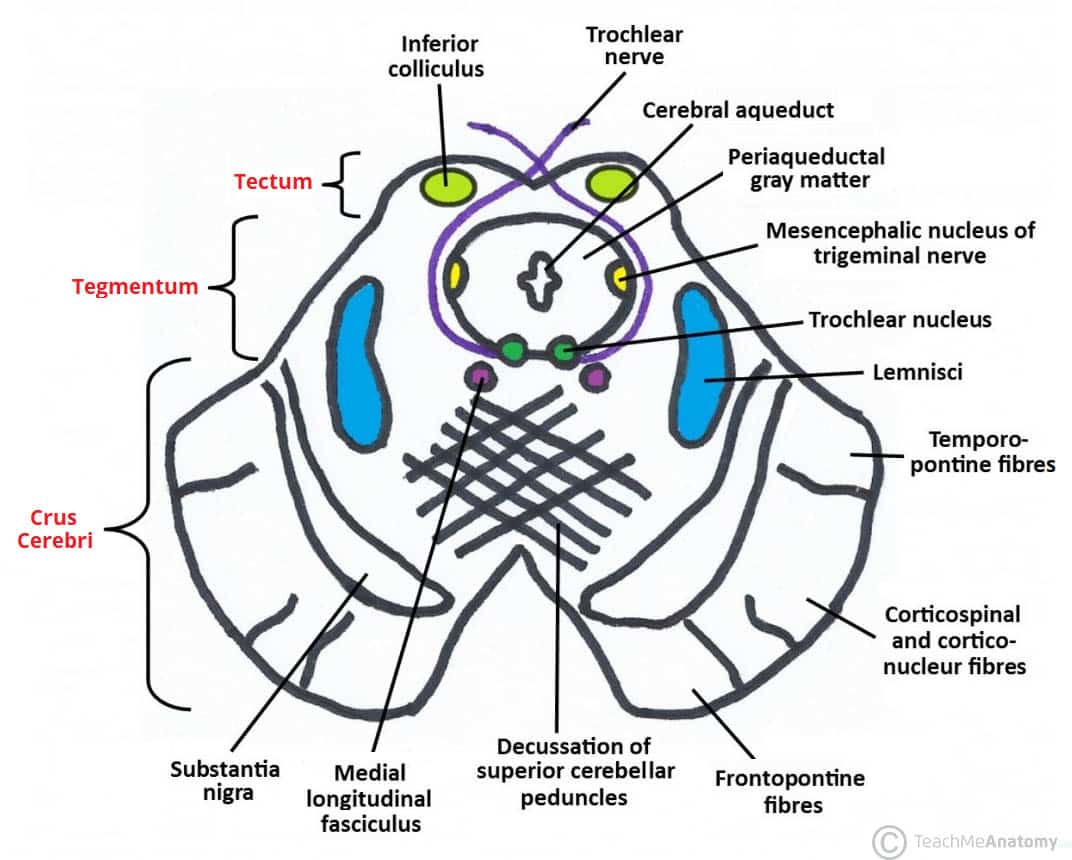 The midbrain (also known as the mesencephalon) is the most superior of the three regions of the brainstem. It acts as a conduit between the forebrain above and the pons and cerebellum below. In this article, we will discuss the anatomy of the midbrain – its external anatomy, internal anatomy, and vasculature. By OpenStax College [CC BY 3.0], via Wikimedia Commons Figure 1The three major parts of the brainstem. Pro Feature - 3D Model You've Discovered a Pro Feature Access our 3D Model Library Explore, cut, dissect, annotate and manipulate our 3D models to visualise anatomy in a dynamic, interactive way. Learn More External Anatomy of the Midbrain The midbrain is the smallest of the three regions of the brainstem, measuring around 2cm in length. As it ascends, the midbrain travels through the opening in the tentorium cerebelli. It can be divided into two main parts: Tectum – located posterior to the cerebral aqueduct Paired cerebral peduncles – located anteriorly and laterally. Internally, the cerebral peduncles are further separated by the substania nigra into the crus cerebri (anterior) and the tegmentum (posterior). Tectum The tectum houses four rounded prominences named colliculi (collectively the corpora quadrigemina) which sit directly inferior to the pineal gland. The colliculi are separated by the cruciform sulcus; there are two superior and two inferior colliculi. Extending laterally from each colliculi are the quadrigeminal brachium: Superior quadrigeminal brachium forms a pathway between the superior colliculus and the retina of the eye. Inferior quadrigeminal brachium conveys fibres from the lateral lemniscus and inferior colliculus to the medial geniculate body. Inferior to the colliculi, the trochlear nerve (CN IV) emerges before sweeping across to the anterior surface. Cerebral Peduncles The paired cerebral peduncles extend from the cerebral hemispheres to converge as they meet the pons. They are separated anteriorly in the midline by the interpeduncular fossa, the floor of which is termed the posterior perforated substance (as many perforating blood vessels can be identified). The oculomotor nerve (CNIII) is seen exiting from between the peduncles while the optic tract runs around the superior border of the midbrain. By TeachMeSeries Ltd (2025) Fig 2Posterolateral view of the external anatomy of the midbrain. Internal Anatomy of the Midbrain Two transverse sections of the midbrain will be discussed: the level of the inferior colliculus, and the level of the superior colliculus. Level of the Inferior Colliculus The anteriolateral surface of the midbrain houses the paired crus cerebri. Four fibre tracts run within the crus: Frontopontine fibres – located most medially. Corticospinal fibres – motor fibres from the primary motor cortex. Corticobulbar tracts – motor fibres from the primary motor cortex. Temporopontine fibres – located posterolaterally. Posteriorly is the substantia nigra – a pigmented nucleus that separates the two regions of the cerebral peduncles. It is further broken down into the pars reticulata (anterior) and pars compacta (posterior). The tegmentum is located posterior to the substantia nigra. It is continuous with that found in the pons by the same name. It is important to note that unlike the crus cerebri, the tegmentum is continuous at the midline. The cerebral aqueduct (see ventricles) is a midline structure surrounded by central gray matter – the periaqueductal gray matter. Within this gray matter lies the mesencephalic nucleus of the trigeminal nerve, as well as the trochlear nucleus with its fibres continuing around the gray matter to exit the midbrain. Anterior to this, the medial longitudinal fasciculus can be seen. The decussation of the superior cerebellar peduncles can be seen centrally at this level with some reticular formation (noted throughout the brainstem) lying lateral. Between the central gray matter and the substantia nigra are four lemnisci. Moving anterior to posterior they are the medial, spinal, trigeminal, and lateral leminisci. At the very posterior pole, we find the tectum which, at this level, contains the inferior colliculus. By TeachMeSeries Ltd (2025) Figure 3Cross-section of the midbrain at the level of the inferior colliculi. NOTE: corticonuclear fibres are also known as corticobulbar. Level of the Superior Colliculus Much of the internal structure of the midbrain is unchanged at this level and should be assumed present unless mentioned below. The central portion which previously was occupied by the decussation of the superior cerebellar peduncles now contains the large paired red nuclei with some decussation of the rubrospinal tract occuring anterior to this. The reticular formation now fans around the posterior borders of the red nuclei. The trochlear nucleus is replaced with the oculomotor nucleus while the oculomotor nerve projects anteriorly. The medial, spinal and trigeminal lemnisci are all present in much the same location however the lateral lemnisci does not reach to this level. Needless to say, the tectum now contains the superior colliculi rather than the inferior colliculi. By TeachMeSeries Ltd (2025) Figure 4 Cross-section of midbrain at the level of the superior colliculus. Vasculature The midbrain receives vascular supply from the basilar artery and its branches. The major vessels are: Posterior cerebral artery and its peduncular branch Superior cerebellar artery Posterior choroidal artery Interpeduncular branches of the basilar artery. By TeachMeSeries Ltd (2025) Fig 5Vascular supply of the midbrain. Do you think you’re ready? Take the quiz below Pro Feature - Quiz The Midbrain Question 1 of 3 Submitting... Skip Next Rate question: You scored 0% Skipped: 0/3 1800 More Questions Available Upgrade to TeachMeAnatomy Pro Challenge yourself with over 1800 multiple-choice questions to reinforce learning Learn More Rate This Article