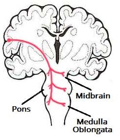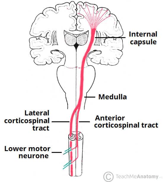 This article is about the descending tracts of the central nervous system. The descending tracts are the pathways by which motor signals are sent from the brain to lower motor neurones. The lower motor neurones then directly innervate muscles to produce movement. The motor tracts can be functionally divided into two major groups: Pyramidal tracts – These tracts originate in the cerebral cortex, carrying motor fibres to the spinal cord and brain stem. They are responsible for the voluntary control of the musculature of the body and face. Extrapyramidal tracts – These tracts originate in the brain stem, carrying motor fibres to the spinal cord. They are responsible for the involuntary and automatic control of all musculature, such as muscle tone, balance, posture and locomotion There are no synapses within the descending pathways. At the termination of the descending tracts, the neurones synapse with a lower motor neurone. Thus, all the neurones within the descending motor system are classed as upper motor neurones. Their cell bodies are found in the cerebral cortex or the brain stem, with their axons remaining within the CNS. By TeachMeSeries Ltd (2025) Fig 1Schematic of the motor nervous system. The descending tracts are represented by upper motor neurones. Pro Feature - 3D Model You've Discovered a Pro Feature Access our 3D Model Library Explore, cut, dissect, annotate and manipulate our 3D models to visualise anatomy in a dynamic, interactive way. Learn More Pyramidal Tracts The pyramidal tracts derive their name from the medullary pyramids of the medulla oblongata, which they pass through. These pathways are responsible for the voluntary control of the musculature of the body and face. Functionally, these tracts can be subdivided into two: Corticospinal tracts – supplies the musculature of the body. Corticobulbar tracts – supplies the musculature of the head and neck. We shall now discuss both pathways in further detail. By TeachMeSeries Ltd (2025) Fig 2The medullary pyramids Corticospinal Tracts The corticospinal tracts begin in the cerebral cortex, from which they receive a range of inputs: Primary motor cortex Premotor cortex Supplementary motor area They also receive nerve fibres from the somatosensory area, which play a role in regulating the activity of the ascending tracts. After originating from the cortex, the neurones converge, and descend through the internal capsule (a white matter pathway, located between the thalamus and the basal ganglia). This is clinically important, as the internal capsule is particularly susceptible to compression from haemorrhagic bleeds, known as a ‘capsular stroke‘. Such an event could cause a lesion of the descending tracts. After the internal capsule, the neurones pass through the crus cerebri of the midbrain, the pons and into the medulla. In the most inferior (caudal) part of the medulla, the tract divides into two: The fibres within the lateral corticospinal tract decussate (cross over to the other side of the CNS). They then descend into the spinal cord, terminating in the ventral horn (at all segmental levels). From the ventral horn, the lower motor neurones go on to supply the muscles of the body. The anterior corticospinal tract remains ipsilateral, descending into the spinal cord. They then decussate and terminate in the ventral horn of the cervical and upper thoracic segmental levels. By TeachMeSeries Ltd (2025) Fig 3The corticospinal tracts. Note the area of decussation of the lateral corticospinal tract in the medulla. Corticobulbar Tracts The corticobulbar tracts arise from the lateral aspect of the primary motor cortex. They receive the same inputs as the corticospinal tracts. The fibres converge and pass through the internal capsule to the brainstem. The neurones terminate on the motor nuclei of the cranial nerves. Here, they synapse with lower motor neurones, which carry the motor signals to the muscles of the face and neck. Clinically, it is important to understand the organisation of the corticobulbar fibres. Many of these fibres innervate the motor neurones bilaterally. For example, fibres from the left primary motor cortex act as upper motor neurones for the right and left trochlear nerves. There are a few exceptions to this rule: Upper motor neurones for the facial nerve (CN VII) have a contralateral innervation. This only affects the muscles in the lower quadrant of the face – below the eyes. (The reasons for this are beyond the scope of this article) Upper motor neurons for the hypoglossal (CN XII) nerve only provide contralateral innervation. By TeachMeSeries Ltd (2025) Fig 4Overview of the right corticobulbar tract. Note that this is a simplified diagram, ignoring the bilateral nature of these pathways. Extrapyramidal Tracts The extrapyramidal tracts originate in the brainstem, carrying motor fibres to the spinal cord. They are responsible for the involuntary and automatic control of all musculature, such as muscle tone, balance, posture and locomotion. There are four tracts in total. The vestibulospinal and reticulospinal tracts do not decussate, providing ipsilateral innervation. The rubrospinal and tectospinal tracts do decussate, and therefore provide contralateral innervation Vestibulospinal Tracts There are two vestibulospinal pathways; medial and lateral. They arise from the vestibular nuclei, which receive input from the organs of balance. The tracts convey this balance information to the spinal cord, where it remains ipsilateral. Fibres in this pathway control balance and posture by innervating the ‘anti-gravity’ muscles (flexors of the arm, and extensors of the leg), via lower motor neurones. Reticulospinal Tracts The two recticulospinal tracts have differing functions: Medial reticulospinal tract – arises from the pons. It facilitates voluntary movements, and increases muscle tone. Lateral reticulospinal tract – arises from the medulla. It inhibits voluntary movements, and reduces muscle 
