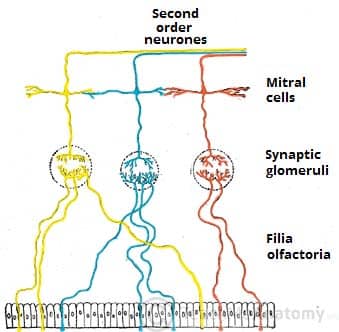 The olfactory nerve (CN I) is the first and shortest cranial nerve. It is a special visceral afferent nerve, which transmits information relating to smell. Embryologicallly, the olfactory nerve is derived from the olfactory placode (a thickening of the ectoderm layer), which also give rise to the glial cells which support the nerve. In this article, we shall look at the anatomy of the olfactory nerve – its structure, anatomical course and clinical relevance. By TeachMeSeries Ltd (2025) Fig 1Innervation of the nasal cavity. The olfactory nerve is responsible for the sense of smell. The nasociliary and nasopalatine nerves provide general sensation. Pro Feature - 3D Model You've Discovered a Pro Feature Access our 3D Model Library Explore, cut, dissect, annotate and manipulate our 3D models to visualise anatomy in a dynamic, interactive way. Learn More Anatomical Course The anatomical course of the olfactory nerve describes the transmission of special sensory information from the nasal epithelium to the primary olfactory cortex of the brain. Nasal Epithelium The sense of smell is detected by olfactory receptors located within the nasal epithelium. Their axons (fila olfactoria) assemble into small bundles of true olfactory nerves, which penetrate the small foramina in the cribriform plate of the ethmoid bone and enter the cranial cavity. Olfactory Bulb Once in the cranial cavity, the fibres enter the olfactory bulb, which lies in the olfactory groove within the anterior cranial fossa. The olfactory bulb is an ovoid structure which contains specialised neurones, called mitral cells. The olfactory nerve fibres synapse with the mitral cells, forming collections known as synaptic glomeruli. From the glomeruli, second order nerves then pass posteriorly into the olfactory tract. By TeachMeSeries Ltd (2025) Fig 2Initial olfactory nerve fibre course. Olfactory Tract The olfactory tract travels posteriorly on the inferior surface of the frontal lobe. As the tract reaches the anterior perforated substance (an area at the level of the optic chiasm) it divides into medial and lateral stria: Lateral stria – carries the axons to the primary olfactory cortex, located within the uncus of temporal lobe. Medial stria – carries the axons across the medial plane of the anterior commissure, where they meet the olfactory bulb of the opposite side. The primary olfactory cortex sends nerve fibres to many other areas of the brain, notably the piriform cortex, the amygdala, olfactory tubercle and the secondary olfactory cortex. These areas are involved in the memory and appreciation of olfactory sensations. Sensory Function The sensory function of the olfactory nerve is achieved via the olfactory mucosa. This mucosal layer not only senses smell, but it also detects the more advanced aspects of taste. It is located in the roof of the nasal cavity and is composed of pseudostratified columnar epithelium which contains a number of cells: Basal cells – form the new stem cells from which the new olfactory cells can develop. Sustentacular cells – tall cells for structural support. These are analogous to the glial cells located in the CNS. Olfactory receptor cells – bipolar neurons which consist of two processes: Dendritic process projects to the surface of the epithelium, where they project a number of short cilia, the olfactory hairs, into the mucous membrane. These cilia react to odors in the air and stimulate the olfactory cells. Central process (also known as the axon) projects in the opposite direction through the basement membrane. In addition to the epithelium, there are Bowman’s glands present in the mucosa, which secrete mucus. By TeachMeSeries Ltd (2025) Fig 3The cells of the olfactory epithelium Clinical Relevance Anosmia Anosmia is defined as the absence of the sense of smell. It can be temporary, permanent, progressive or congenital. Temporary anosmia can be caused by infection (e.g. meningitis) or by local disorders of the nose (e.g. common cold) Permanent anosmia can be caused by head injury, or tumours which occur in the olfactory groove (e.g. meningioma). Anosmia can also occur as a result of neurodegenerative conditions, such as Parkinson’s or Alzheimer’s disease. In these conditions, the anosmia is progressive and precedes motor symptoms but it is not often noticed by the patient. Anosmia is also a feature of a number of genetic conditions such as Kallmann syndrome (failure to start or finish puberty) and Primary Ciliary Dyskinesia (defect in cilia causing it to be immobile) Clinical Relevance Olfactory Nerve Examination Assessment of the olfactory nerve is an important part of a complete cranial nerve examination. First, the patient should be asked if they have noticed any changes in their taste or sense of smell. Then each nostril should be tested, asking the patient to identify a certain smell (peppermint or coffee are often used). The eyes should be closed for this part of the examination. Do you think you’re ready? Take the quiz below Pro Feature - Quiz The Olfactory Nerve (CN I) and Olfactory Pathway Question 1 of 3 Submitting... Skip Next Rate question: You scored 0% Skipped: 0/3 1800 More Questions Available Upgrade to TeachMeAnatomy Pro Challenge yourself with over 1800 multiple-choice questions to reinforce learning Learn More Rate This Article