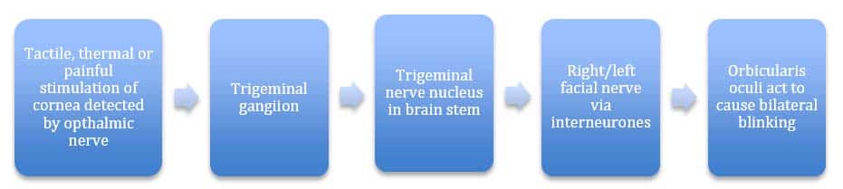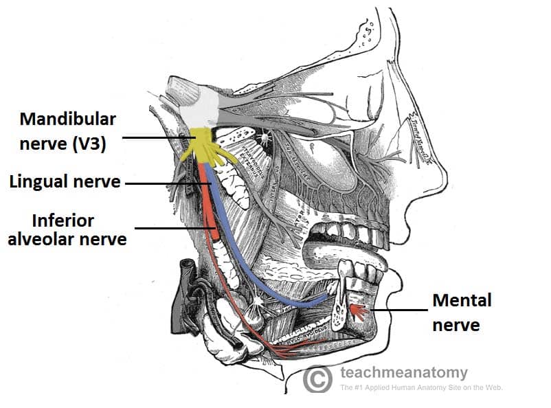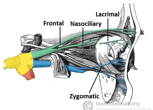 The trigeminal nerve (CN V) is the fifth paired cranial nerve. It is also the largest cranial nerve. In this article, we shall look at the anatomy of the trigeminal nerve – its course, functions and clinical correlations. Pro Feature - 3D Model You've Discovered a Pro Feature Access our 3D Model Library Explore, cut, dissect, annotate and manipulate our 3D models to visualise anatomy in a dynamic, interactive way. Learn More Summary The trigeminal nerve is associated with derivatives of the 1st pharyngeal arch. Sensory: Innervation to the skin, mucous membranes and sinuses of the face. Motor: Innervation to the muscles of mastication, anterior belly of digastric, mylohyoid, tensor veli palatini and tensor tympani. Parasympathetic Supply: Post-ganglionic neurones from parasympathetic ganglia travel with branches of the trigeminal nerve. Pro Feature - Dissection Images Cutaneous branches of the trigeminal nerve, supplying sensation to the face and scalp. Cutaneous branches of the trigeminal nerve, supplying sensation to the face and scalp. You've Discovered a Pro Feature Access our Dissection Image Library Enhance your understanding with high-resolution dissection images showcasing real-life anatomy. Learn More Anatomical Course The trigeminal nerve originates from three sensory nuclei (mesencephalic, principal sensory, spinal nuclei of trigeminal nerve) and one motor nucleus (motor nucleus of the trigeminal nerve) extending from the midbrain to the medulla. A nucleus (pl. nuclei) is a collection of neurone cell bodies within the central nervous system. At the level of the pons, the sensory nuclei merge to form a sensory root. The motor nucleus continues to form a motor root. These roots are analogous to the dorsal and ventral roots of the spinal cord. In the middle cranial fossa, the sensory root expands into the trigeminal ganglion. A ganglion (pl. ganglia) refers to a collection of the neurone cell bodies outside the central nervous system. The trigeminal ganglion is located lateral to the cavernous sinus, in a depression of the temporal bone. This depression is known as the trigeminal cave. The peripheral aspect of the trigeminal ganglion gives rise to 3 divisions: ophthalmic (V1), maxillary (V2) and mandibular (V3). The motor root passes inferiorly to the sensory root, along the floor of the trigeminal cave. Its fibres are only distributed to the mandibular division. The ophthalmic nerve and maxillary nerve travel lateral to the cavernous sinus exiting the cranium via the superior orbital fissure and foramen rotundum respectively. The mandibular nerve exits via the foramen ovale entering the infra-temporal fossa. (Note – be aware that while we talk about the nerves exiting the cranial cavity, the sensory components can also be said to be entering the cranial cavity, since they are afferent fibres). By TeachMeSeries Ltd (2025) Fig 1The origin of the sensory aspect of the trigeminal nerve. Note that the nuclei are situated within in the CNS, and the ganglia outside the CNS. By TeachMeSeries Ltd (2025) Fig 2Overview of the deep distribution of the trigeminal nerve and its terminal branches. Divisions Ophthalmic Nerve The ophthalmic nerve gives rise to three terminal branches: frontal, lacrimal and nasociliary. They innervate the skin and mucous membrane of derivatives of the frontonasal prominence derivatives: Forehead and scalp Frontal and ethmoidal sinus Upper eyelid and its conjunctiva Cornea (see clinical relevance) Dorsum of the nose Parasympathetic Supply: Lacrimal gland: Post ganglionic fibres from the pterygopalatine ganglion (derived from the facial nerve), travel with the zygomatic branch of V2 and then join the lacrimal branch of V1. The fibres supply parasympathetic innervation to the lacrimal gland. By TeachMeSeries Ltd (2025) Fig 3Nervous supply to the orbit from the ophthalmic and maxillary nerves. (other nerves e.g. orbital, not labelled). Note that the lacrimal nerve has been partly removed to expose the underlying structures. Clinical Relevance Corneal Reflex The corneal reflex is the involuntary blinking of the eyelids – stimulated by tactile, thermal or painful stimulation of the cornea. In the corneal reflex, the ophthalmic nerve acts as the afferent limb – detecting the stimuli. The facial nerve is the efferent limb, causing contraction of the orbicularis oculi muscle. If the corneal reflex is absent, it is a sign of damage to the trigeminal/ophthalmic nerve, or the facial nerve. By TeachMeSeries Ltd (2025) Fig 4The corneal reflex pathway. Maxillary Nerve The maxillary nerve gives rise to 14 terminal branches, which innervate the skin, mucous membranes and sinuses of derivatives of the maxillary prominence of the 1st pharyngeal arch: Lower eyelid and its conjunctiva Cheeks and maxillary sinus Nasal cavity and lateral nose Upper lip Upper molar, incisor and canine teeth and the associated gingiva Superior palate Parasympathetic Supply: Lacrimal gland: Post ganglionic fibres from the pterygopalatine ganglion (derived from the facial nerve), travel with the zygomatic branch of V2 and then join the lacrimal branch of V1. The fibres supply parasympathetic innervation to the lacrimal gland. Nasal glands: Parasympathetic fibres are also carried to the mucous glands of the nasal mucosa. Post-ganglionic fibres travel with the nasopalatine and greater palatine nerves (branches of V2) Mandibular Nerve The mandibular nerve gives rise to four terminal branches in the infra-temporal fossa: buccal nerve, inferior alveolar nerve, auriculotemporal nerve and lingual nerve. These branches innervate the skin, mucous membrane and striated muscle derivatives of the mandibular prominence of the 1st pharyngeal arch. Sensory Supply: Mucous membranes and floor of the oral cavity External ear Lower lip Chin Anterior 2/3 of the tongue (only general sensation; special taste sensation supplied by the chorda tympani, a branch of the facial nerve) Lower molar, incisor and canine teeth and 