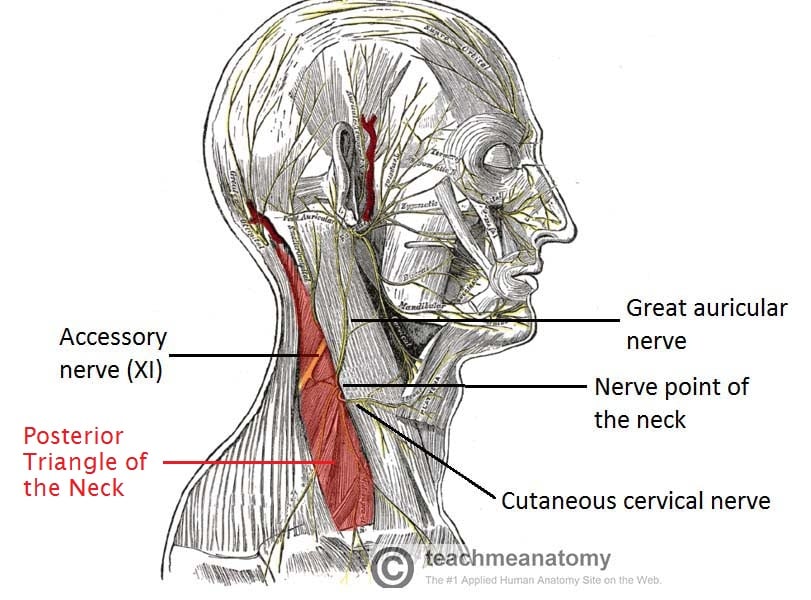 The posterior triangle of the neck is an anatomical area located at the posterolateral aspect of the neck. In this article, we shall look at the anatomy of the posterior triangle of the neck – its borders, contents and clinical correlations. Pro Feature - 3D Model You've Discovered a Pro Feature Access our 3D Model Library Explore, cut, dissect, annotate and manipulate our 3D models to visualise anatomy in a dynamic, interactive way. Learn More Borders The posterior triangle of the neck has three borders: Anterior – posterior border of the sternocleidomastoid. Posterior – anterior border of the trapezius muscle. Inferior – middle 1/3 of the clavicle. The roof is formed by the investing layer of fascia, and the floor is formed by the prevertebral fascia (see fascial layers of the neck). By TeachMeSeries Ltd (2025) Fig 1The borders and floor of the posterior triangle of the neck. Pro Feature - Dissection Images Prosection of the posterior triangle of the neck and its contents. Prosection of the posterior triangle of the neck and its contents. You've Discovered a Pro Feature Access our Dissection Image Library Enhance your understanding with high-resolution dissection images showcasing real-life anatomy. Learn More Contents Muscles The posterior triangle of the neck contains many muscles, which make up the borders and the floor of the area. A significant muscle in the posterior triangle region is the omohyoid muscle. It is split into two bellies by a tendon. The inferior belly crosses the posterior triangle, travelling in an supero-medial direction, and splitting the triangle into two. The muscle then crosses underneath the SCM to enter the anterior triangle of the neck. A number of vertebral muscles (covered by prevertebral fascia) form the floor of the posterior triangle: Splenius capitis Levator scapulae Anterior, middle and posterior scalenes Vasculature The external jugular vein is one of the major veins of the neck region. Formed by the retromandibular and posterior auricular veins, it lies superficially, entering the posterior triangle after crossing the sternocleidomastoid muscle. Within the posterior triangle, the external jugular vein pierces the investing layer of fascia and empties into the subclavian vein. The subclavian vein is often used as a point of access to the venous system, via a central catheter. The transverse cervical and suprascapular veins also lie in the posterior triangle The subclavian, transverse cervical and suprascapular veins are accompanied by their respective arteries in the posterior triangle. The distal part of the subclavian artery can be located as it emerges between the anterior and middle scalene muscles. As it crosses the first rib, it becomes the axillary artery, which goes onto supply the upper limb. Clinical Relevance The External Jugular Vein The external jugular vein has a relatively superficial course down the neck, leaving it vulnerable to damage. If it is severed, in an injury such as a knife slash, its lumen is held open – this is due to the thick layer of investing fascia (for more information see Fascial Layers of the Neck). Air will be drawn into the vein, producing cyanosis, and can stop blood flow through the right atrium. This is a medical emergency, managed by the application of pressure to the wound – stopping the bleeding, and the entry of air. Nerves The accessory nerve (CN XI) exits the cranial cavity, descends down the neck, innervates sternocleidomastoid and enters the posterior triangle. It crosses the posterior triangle in an oblique, inferoposterior direction, within the investing layer of fascia. It lies relatively superficial in the posterior triangle, leaving it vulnerable to injury. The cervical plexus forms within the muscles of the floor of the posterior triangle. A major branch of this plexus is the phrenic nerve, which arises from the anterior divisions of spinal nerves C3-C5. It descends down the neck, within the prevertebral fascia, to innervate the diaphragm. Other branches of the cervical plexus innervate the vertebral muscles, and provide cutaneous innervation to parts of the neck and scalp. The trunks of the brachial plexus also cross the floor of the posterior triangle. By TeachMeSeries Ltd (2025) Figure 2Nerves within the posterior triangle of the neck. Clinical Relevance Cervical Plexus Nerve Block For anaesthesia of the neck area, a cervical plexus block can be used. Local anaesthetic is injected along the posterior border of sternocleidomastoid at the junction of its superior and middle thirds. This junction is where the cutaneous branches of the cervical plexus emerge, known as the nerve point of the neck. Subdivisions The omohyoid muscle divides the posterior triangle of the neck into two areas: Occipital triangle – located superior to the omohyoid. Subclavian triangle – located inferior to the omohyoid. It contains the distal portion of the subclavian artery Do you think you’re ready? Take the quiz below Pro Feature - Quiz The Posterior Triangle of the Neck Question 1 of 3 Submitting... Skip Next Rate question: You scored 0% Skipped: 0/3 1800 More Questions Available Upgrade to TeachMeAnatomy Pro Challenge yourself with over 1800 multiple-choice questions to reinforce learning Learn More Rate This Article