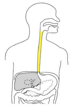 The oesophagus is a fibromuscular tube, approximately 25cm in length, that transports food from the pharynx to the stomach. It originates at the inferior border of the cricoid cartilage (C6) and extends to the cardiac orifice of the stomach (T11). In this article we shall examine the anatomy of the oesophagus – its structure, vascular supply and clinical correlations. By TeachMeSeries Ltd (2025) Fig 1.0The oesophagus Pro Feature - 3D Model You've Discovered a Pro Feature Access our 3D Model Library Explore, cut, dissect, annotate and manipulate our 3D models to visualise anatomy in a dynamic, interactive way. Learn More Anatomical Course The oesophagus begins in the neck, at the level of C6. Here, it is continuous superiorly with the laryngeal part of the pharynx (the laryngopharynx). It descends downward into the superior mediastinum of the thorax, positioned between the trachea and the vertebral bodies of T1 to T4. It then enters the abdomen via the oesophageal hiatus (an opening in the right crus of the diaphragm) at T10. The abdominal portion of the oesophagus is approximately 1.25cm long – it terminates by joining the cardiac orifice of the stomach at level of T11. Pro Feature - Dissection Images Dissection of the thorax, demonstrating the passage of the oesophagus, inferior vena cava and descending aorta through the diaphragm. Note how the right crus of the diaphragm has a 'pinch-cock' effect on the oesophagus to form the lower oesophageal sphincter Dissection of the thorax, demonstrating the passage of the oesophagus, inferior vena cava and descending aorta through the diaphragm. Note how the right crus of the diaphragm has a 'pinch-cock' effect on the oesophagus to form the lower oesophageal sphincter You've Discovered a Pro Feature Access our Dissection Image Library Enhance your understanding with high-resolution dissection images showcasing real-life anatomy. Learn More Anatomical Structure The oesophagus shares a similar structure with many of the organs in the alimentary tract: Adventitia – outer layer of connective tissue. Note: The very distal and intraperitoneal portion of the oesophagus has an outer covering of serosa, instead of adventitia. Muscle layer – external layer of longitudinal muscle and inner layer of circular muscle. The external layer is composed of different muscle types in each third: Superior third – voluntary striated muscle Middle third – voluntary striated and smooth muscle Inferior third – smooth muscle Submucosa Mucosa – non-keratinised stratified squamous epithelium (contiguous with columnar epithelium of the stomach). Food is transported through the oesophagus by peristalsis – rhythmic contractions of the muscles which propagate down the oesophagus. Hardening of these muscular layers can interfere with peristalsis and cause difficulty in swallowing (dysphagia). Adapted from work by Cancer Research UK [CC BY-SA 4.0] Fig 2The layers of the oesophagus. The muscle layer is further divided into an outer longitudinal layer and inner circular layer. Oesophageal Sphincters There are two sphincters present in the oesophagus, known as the upper and lower oesophageal sphincters. They act to prevent the entry of air and the reflux of gastric contents respectively. Upper Oesophageal Sphincter The upper sphincter is an anatomical, striated muscle sphincter at the junction between the pharynx and oesophagus. It is produced by the cricopharyngeus muscle. Normally, it is constricted to prevent the entrance of air into the oesophagus. Lower Oesophageal Sphincter The lower oesophageal sphincter is located at the gastro-oesophageal junction (between the stomach and oesophagus). The gastro-oesophageal junction is situated to the left of the T11 vertebra, and is marked by the change from oesophageal to gastric mucosa. The sphincter is classified as a physiological (or functional) sphincter, as it does not have any specific sphincteric muscle. Instead, the sphincter is maintained by four factors: Oesophagus enters the stomach at an acute angle. Walls of the intra-abdominal section of the oesophagus are compressed when there is a positive intra-abdominal pressure. Prominent mucosal folds at the gastro-oesophageal junction aid in occluding the lumen. Right crus of the diaphragm has a “pinch-cock” effect. During oesophageal peristalsis, the sphincter is relaxed to allow food to enter the stomach. Otherwise at rest, the function of this sphincter is to prevent the reflux of acidic gastric contents into the oesophagus. Anatomical Relations The anatomical relations of the oesophagus give rise to four physiological constrictions in its lumen – it is these areas where food/foreign objects are most likely to become impacted. They can be remembered using the acronym ‘ABCD‘: Arch of aorta Bronchus (left main stem) Cricoid cartilage Diaphragmatic hiatus The table below lists the anatomical relations of the oesophagus: Anterior Posterior Right Left Cervical and thoracic Trachea Left recurrent laryngeal nerve Pericardium Thoracic vertebral bodies Thoracic duct Azygous veins Descending aorta Pleura Terminal part of azygous vein Subclavian artery Aortic arch Thoracic duct Pleura Abdominal Left vagus nerve Posterior surface of the heart Right vagus nerve Left crus of the diaphragm Vasculature In respect to its arterial and venous supply, the oesophagus can be divided into its thoracic and abdominal components. Thoracic The thoracic part of the oesophagus receives its arterial supply from the branches of the thoracic aorta and the inferior thyroid artery (a branch of the thyrocervical trunk). Venous drainage into the systemic circulation occurs via branches of the azygous veins and the inferior thyroid vein. Abdominal The abdominal oesophagus is supplied by the left gastric artery (a branch of the coeliac trunk) and left inferior phrenic artery. This part of the oesophagus has a mixed venous drainage via two routes: To the portal circulation via left gastric ve