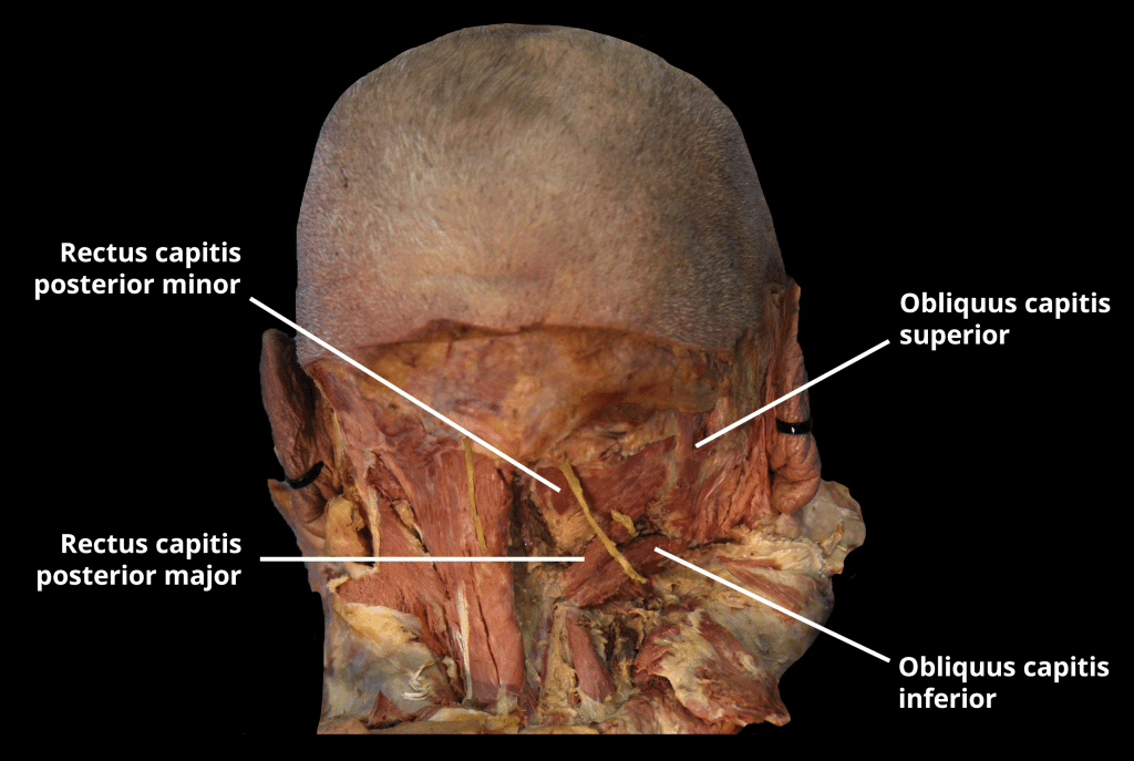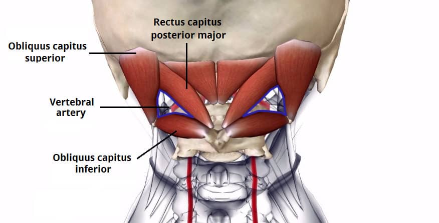 The suboccipital muscles are a group of four muscles situated underneath the occipital bone. All the muscles in this group are innervated by the suboccipital nerve. They are located within the suboccipital compartment of the neck; deep to the sternocleidomastoid, trapezius, splenius and semispinalis muscles. They collectively act to extend and rotate the head. In this article, we shall look at the anatomy of the suboccipital muscles – their attachments, actions and innervation. Pro Feature - 3D Model You've Discovered a Pro Feature Access our 3D Model Library Explore, cut, dissect, annotate and manipulate our 3D models to visualise anatomy in a dynamic, interactive way. Learn More Rectus Capitis Posterior Major The rectus capitis posterior major is the larger of the rectus capitis muscles. It is located laterally to the rectus capitis posterior minor. Attachments: Originates from the spinous process of the C2 vertebrae (axis) and inserts into the lateral part of the inferior nuchal line of the occipital bone. Actions: Extension and rotation of the head. Innervation: Suboccipital nerve (posterior ramus of C1). Pro Feature - Dissection Images Dissection of the suboccipital muscles of the neck Dissection of the suboccipital muscles of the neck You've Discovered a Pro Feature Access our Dissection Image Library Enhance your understanding with high-resolution dissection images showcasing real-life anatomy. Learn More Rectus Capitis Posterior Minor The rectus capitis posterior minor is the most medial of the suboccipital muscles. There is a connective tissue bridge between this muscle and the dura mater (outer membrane of the meninges) – which may play a role in cervicogenic headaches. Attachments: Originates from the posterior tubercle (a rudimentary spinous process) of the C1 vertebra. Attaches to the medial part of the inferior nuchal line of the occipital bone. Actions: Extension of the head. Innervation: Suboccipital nerve (posterior ramus of C1). By TeachMeSeries Ltd (2025) Fig 1The left occipital muscles, which lie underneath the deep muscles of the back. Obliquus Capitis Inferior The obliquus capitis inferior is the most inferiorly positioned of the suboccipital muscles. It is the only muscle within this group which has no attachment to the cranium. Attachments: Originates from the spinous process of the C2 vertebra and attaches onto the transverse process of C1. Actions: Extension and rotation of the head. Innervation: Suboccipital nerve (posterior ramus of C1) Obliquus Capitis Superior The obliquus capitis superior is located laterally in the suboccipital compartment. Attachments: Originates from the transverse process of C1 and attaches onto the occipital bone (between the superior and inferior nuchal lines). Actions: Extension of the head. Innervation: Suboccipital nerve (posterior ramus of C1) Suboccipital Triangle The suboccipital triangle is an area bordered by three of the suboccipital muscles. It contains the vertebral artery (can be identified during surgery), suboccipital venous plexus and suboccipital nerve. Its borders are as follows: Superomedial: Rectus capitus posterior major Superolateral: Obliquus capitus superior Inferior: Obliquus capitus inferior Floor: Posterior atlanto-occipital membrane and posterior arch of the C1 vertebrae (atlas) Roof: Semispinalis capitus Biodigital Human 2016 Fig 2The suboccipital triangle. It can be used to locate the vertebral artery, as shown on this illustration. Do you think you’re ready? Take the quiz below Pro Feature - Quiz The Suboccipital Muscles Question 1 of 3 Submitting... Skip Next Rate question: You scored 0% Skipped: 0/3 1800 More Questions Available Upgrade to TeachMeAnatomy Pro Challenge yourself with over 1800 multiple-choice questions to reinforce learning Learn More Rate This Article