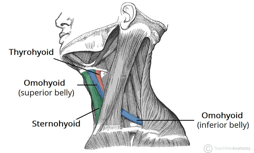 The infrahyoid muscles are a group of four muscles that are located inferiorly to the hyoid bone in the neck. They can be divided into two groups: Superficial plane – omohyoid and sternohyoid muscles. Deep plane – sternothyroid and thyrohyoid muscles. The arterial supply to the infrahyoid muscles is via the superior and inferior thyroid arteries, with venous drainage via the corresponding veins. In this article, we shall look at the anatomy of the infrahyoid muscles – their attachments, actions and innervations. Pro Feature - 3D Model You've Discovered a Pro Feature Access our 3D Model Library Explore, cut, dissect, annotate and manipulate our 3D models to visualise anatomy in a dynamic, interactive way. Learn More Omohyoid The omohyoid is comprised of two muscle bellies, which are connected by a muscular tendon. Attachments: Superior belly arises from the hyoid bone and inferior belly arises from the scapula. Two muscle bellies are connected by an intermediate tendon, which is anchored to the clavicle by the deep cervical fascia. Actions: Depresses the hyoid bone. Innervation: Anterior rami of C1-C3, carried by a branch of the ansa cervicalis. By TeachMeSeries Ltd (2025) Fig 1Lateral view of the infrahyoid muscles of the neck. Pro Feature - Dissection Images You've Discovered a Pro Feature Access our Dissection Image Library Enhance your understanding with high-resolution dissection images showcasing real-life anatomy. Learn More Sternohyoid The sternohyoid muscle is located in the superficial plane of the neck, along with the omohyoid muscle. Attachments: Originates from the sternum and sternoclavicular joint. Ascends to insert onto the hyoid bone. Actions: Depresses the hyoid bone. Innervation: Anterior rami of C1-C3, carried by a branch of the ansa cervicalis. Sternothyroid The sternothyroid muscle is a wide muscle, located underneath the sternohyoid in the deep plane of the neck. Attachments: Arises from the manubrium of the sternum and attaches to the thyroid cartilage. Actions: Depresses the thyroid cartilage. Innervation: Anterior rami of C1-C3, carried by a branch of the ansa cervicalis. Thyrohyoid The thyrohyoid is a short band of muscle, thought to be a continuation of the sternothyroid muscle. Attachments: Arises from the thyroid cartilage of the larynx and ascends to attach to the hyoid bone. Actions: Depresses the hyoid. If the hyoid bone is fixed, it can elevate the larynx. Innervation: Anterior ramus of C1, carried within the hypoglossal nerve. By TeachMeSeries Ltd (2025) Fig 2Anterior view of the infrahyoid muscles of the neck. Do you think you’re ready? Take the quiz below Pro Feature - Quiz The Infrahyoid Muscles Question 1 of 3 Submitting... Skip Next Rate question: You scored 0% Skipped: 0/3 1800 More Questions Available Upgrade to TeachMeAnatomy Pro Challenge yourself with over 1800 multiple-choice questions to reinforce learning Learn More Rate This Article