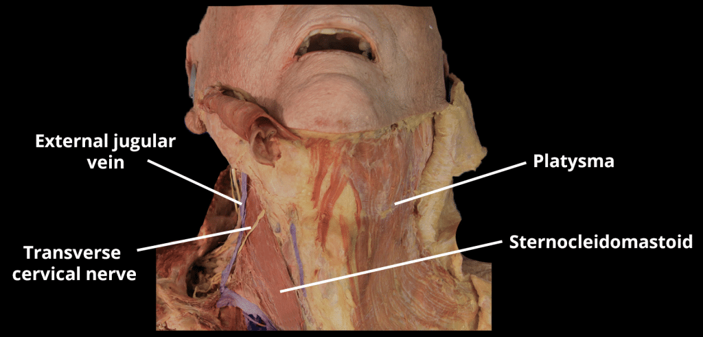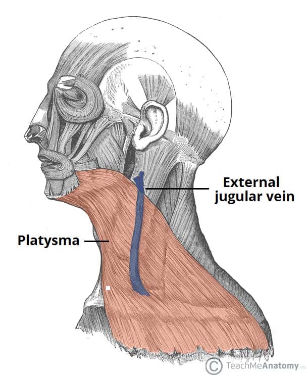Fascia is an internal connective tissue which forms bands or sheets that surround and support muscles, vessels and nerves in the body. In the neck, these layers of fascia not only act to support internal structures, but also help to compartmentalise structures of the neck. There are two fascias in the neck – the superficial cervical fascia and the deep cervical fascia. In this article, we shall look at the anatomy of the fascial layers of the neck – their attachments, anatomical relationships and their clinical relevance. Pro Feature - 3D Model You've Discovered a Pro Feature Access our 3D Model Library Explore, cut, dissect, annotate and manipulate our 3D models to visualise anatomy in a dynamic, interactive way. Learn More Superficial Cervical Fascia The superficial cervical fascia lies between the dermis and the deep cervical fascia. It contains numerous structures: Neurovascular supply to the skin Superficial veins (e.g. the external jugular vein) Superficial lymph nodes Fat Platysma muscle Platysma The superficial cervical fascia blends with the ‘paper thin’ platysma muscle. The platysma is a broad superficial muscle which lies anteriorly in the neck. It has two heads, which originate from the fascia of the pectoralis major and deltoid. The fibres from the two heads cross the clavicle, and meet in the midline, fusing with the muscles of the face. Superiorly, the platysma inserts into the inferior border of the mandible. Innervation to the platysma is via the cervical branch of the facial nerve. By TeachMeSeries Ltd (2025) Fig 1The platysma muscle, located within the superficial cervical fascia. Pro Feature - Dissection Images Superficial dissection of the neck, demonstrating the platysma and underlying structures. Superficial dissection of the neck, demonstrating the platysma and underlying structures. You've Discovered a Pro Feature Access our Dissection Image Library Enhance your understanding with high-resolution dissection images showcasing real-life anatomy. Learn More Deep Cervical Fascia The deep cervical fascia lies, as its name suggests, ‘deep’ to the superficial fascia and platysma muscle. This fascia is organised into several layers. These layers act like a shirt collar, supporting the structures and vessels of the neck. We shall now look at the layers of the deep cervical fascia in more detail (superficial to deep): Investing Layer The investing layer is the most superficial of the deep cervical fascia. It surrounds all the structures in the neck. Where it meets the trapezius and sternocleidomastoid muscles, it splits into two, completely surrounding them. The investing fascia can be thought of as a tube; with superior, inferior, anterior and posterior attachments: Superior – attaches to the external occipital protuberance and the superior nuchal line of the skull. Anteriorly – attaches to the hyoid bone. Inferiorly – attaches to the spine and acromion of the scapula, the clavicle, and the manubrium of the sternum. Posterior – attaches along the nuchal ligament of the vertebral column By TeachMeSeries Ltd (2025) Fig 2Transverse section of the neck, with the investing layer of fascia highlighted in blue. Pretracheal Layer The pretracheal layer of fascia is situated in the anterior neck. It spans between the hyoid bone superiorly and the thorax inferiorly (where it fuses with the pericardium). The trachea, oesophagus, thyroid gland and infrahyoid muscles are enclosed by the pretracheal fascia. Anatomically, it can be divided into two parts: Muscular part – encloses the infrahyoid muscles. Visceral part – encloses the thyroid gland, trachea and oesophagus. The posterior aspect of the visceral fascia is formed by contributions from the buccopharyngeal fascia (a fascial covering of the pharynx). By TeachMeSeries Ltd (2025) Fig 3Transverse section of the neck, showing the pretracheal fascia in red. Prevertebral Layer The prevertebral fascia surrounds the vertebral column and its associated muscles; scalene muscles, prevertebral muscles, and the deep muscles of the back. It has attachments along the antero-posterior and supero-inferior axes: Superior attachment – base of the skull. Anterior attachment – transverse processes and vertebral bodies of the vertebral column. Posterior attachment – along the nuchal ligament of the vertebral column Inferior attachment – fusion with the endothoracic fascia of the ribcage. The anterolateral portion of prevertebral fascia forms the floor of the posterior triangle of the neck. It also surrounds the brachial plexus as it leaves the neck and subclavian artery as it passes through the lower neck region – in doing so, it forms the axillary sheath. By TeachMeSeries Ltd (2025) Fig 4The carotid sheath and prevertebral fascia of the neck. Carotid Sheath The carotid sheaths are paired structures on either side of the neck, which enclose an important neurovascular bundle of the neck. The contents of the carotid sheath are: Common carotid artery Internal jugular vein. Vagus nerve. Accompanying cervical lymph nodes. The fascia of the carotid sheath is formed by contributions from the pretracheal, prevertebral, and investing fascia layers. The carotid artery bifurcates within the sheath into the external and internal carotid arteries. The carotid fascia is organised into a column, which runs between the base of the skull to the thoracic mediastinum. This is of clinical importance as a pathway for the spread of infection. Clinical Relevance Fascial Spaces of the Neck The neck fascia compartmentalises structures within the neck. These layers of tough fascia can limit the spread of infection (for example, a superficial skin abscess may be prevented from spreading deeper into the neck by the investing fascia). However, infections that reach the potential spaces between the neck fascia have a well-defined spread: Retropharyngeal space – located between the buccopharyngeal fascia (posterior aspect of the visceral pretrache