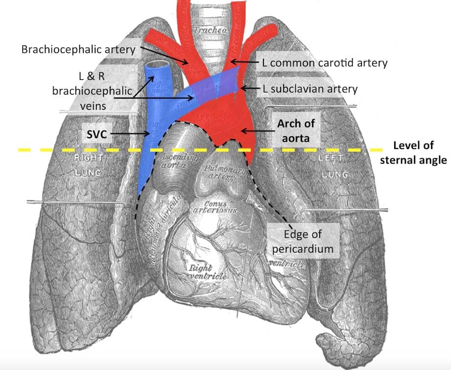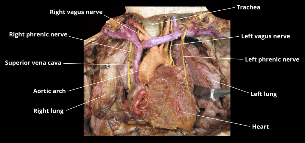 The mediastinum is the central compartment of the thoracic cavity, located between the two pleural sacs. It contains most of the thoracic organs, and acts as a conduit for structures traversing the thorax on their way into the abdomen. Anatomically, the mediastinum is divided into two parts by an imaginary line that runs from the sternal angle (the angle formed by the junction of the sternal body and manubrium) to the T4 vertebrae: Superior mediastinum – extends upwards, terminating at the superior thoracic aperture. Inferior mediastinum – extends downwards, terminating at the diaphragm. It is further subdivided into the anterior mediastinum, middle mediastinum and posterior mediastinum. In this article, we shall look at the anatomy of the superior mediastinum – its borders, contents and clinical correlations. Pro Feature - 3D Model You've Discovered a Pro Feature Access our 3D Model Library Explore, cut, dissect, annotate and manipulate our 3D models to visualise anatomy in a dynamic, interactive way. Learn More Borders The superior mediastinum is bordered by the following thoracic structures: Superior – Thoracic inlet. Inferior – Continuous with the inferior mediastinum at the level of the sternal angle. Anterior – Manubrium of the sternum. Posterior – Vertebral bodies of T1-4. Lateral – Pleurae of the lungs. By TeachMeSeries Ltd (2025) Fig 1The mediastina of the thorax. Pro Feature - Dissection Images Contents of the superior mediastinum. Contents of the superior mediastinum. You've Discovered a Pro Feature Access our Dissection Image Library Enhance your understanding with high-resolution dissection images showcasing real-life anatomy. Learn More Contents The superior mediastinum contains neural, vascular and respiratory structures passing from the adjacent regions of the neck and abdomen (via the inferior mediastinum). Great Vessels The great systemic blood vessels of the heart lie within the superior mediastinum and their main branches arise before passing through the superior thoracic aperture (Fig 2). Arch of Aorta The three major branches of the aortic arch arise within the superior mediastinum: Brachiocephalic artery – supplying the right side of the head & neck and the right upper limb. Left common carotid artery – to the left side of the head & neck. Left subclavian artery – to the left upper limb. Superior Vena Cava The following tributaries of the superior vena cava are located within the superior mediastinum: Brachiocephalic veins – draining blood from the upper body. Left superior intercostal vein – collects blood from the left 2nd and 3rd intercostal vein. It drains into the left brachiocephalic vein. Supreme intercostal vein – drains the vein from first intercostal space directly into the brachiocephalic veins. Azygos vein – receiving blood from the right posterior intercostal veins. The left intercostal veins drain first into the hemiazygos and accessory hemiazygos veins before joining the azygos vein around T7-T9. By TeachMeSeries Ltd (2025) Fig 2Great vessels within the superior mediastinum. Nerves Vagus Nerve In the superior mediastinum, the vagus nerve has two distinctive paths: Right vagus nerve – runs parallel to the trachea and passes posteriorly to the superior vena cava and the right primary bronchus. Left vagus nerve (Fig 3) – enters the superior mediastinum between the left common carotid and the left subclavian arteries. It descends anteriorly to the aortic arch, before travelling posterior to the left bronchus. The left recurrent laryngeal nerve arises from the left vagus nerve as it passes the aortic arch. It loops under the arch, to the left of ligamentum arteriosum, before continuing its journey to the larynx in the tracheal-oesophageal groove. Phrenic Nerve From the anterior surface of the anterior scalene muscle, the phrenic nerves (roots C3, C4 and C5) enter the superior mediastinum lateral to the great vessels. They then descend anteriorly into the middle mediastinum, passing anteriorly to the hilum of the lungs. Other Nerves Cardiac nerves – originate from the superior, middle and inferior cardiac ganglion and form the superficial and deep cardiac plexuses in the superior mediastinum. The superior plexus sits between the aortic arch and right pulmonary artery. The deep plexus lies on the surface of the trachea at the point of bifurcation. Sympathetic trunk – runs bilaterally to the vertebral bodies along the entire length of the vertebral column. By Truth-seeker2004 [CC-BY-SA-3.0], via Wikimedia Commons Fig 3Overview of the anatomical course of the left vagus nerve Other Structures in the Superior Mediastinum Thymus The thymus gland is the most anterior structure within the superior mediastinum. It sits flush against the posterior surface of the sternum and extends into the anterior mediastinum (Fig 4) and can often reach into the neck. Trachea The trachea bifurcates into the primary bronchi posterior to the ascending aorta at the level of the sternal angle. Oesophagus The oesophagus ascends towards the pharynx, which it joins at the level of C6. Thoracic duct In the superior mediastinum, the thoracic duct passes to the left of the oesophagus on its path to the junction of the left internal jugular and subclavian veins. Muscles The sternohyoid and sternothyroid muscles originate from the posterior surface of the manubrium. They are part of the infrahyoid muscle group of the neck. The inferior aspect of the longus colli muscle also originates within the superior mediastinum. By TeachMeSeries Ltd (2025) Fig 3The spacial relationship of structures that pass from the superior mediastinum to neighbouring regions. Note: for easier comprehension, this schematic does not contain all structures mentioned in this article. Do you think you’re ready? Take the quiz below Pro Feature - Quiz The Superior Mediastinum Question 1 of 2 Submitting... Skip Next Rate question: You scored 0% Skipped: 0/2 1800 More Questions Availab