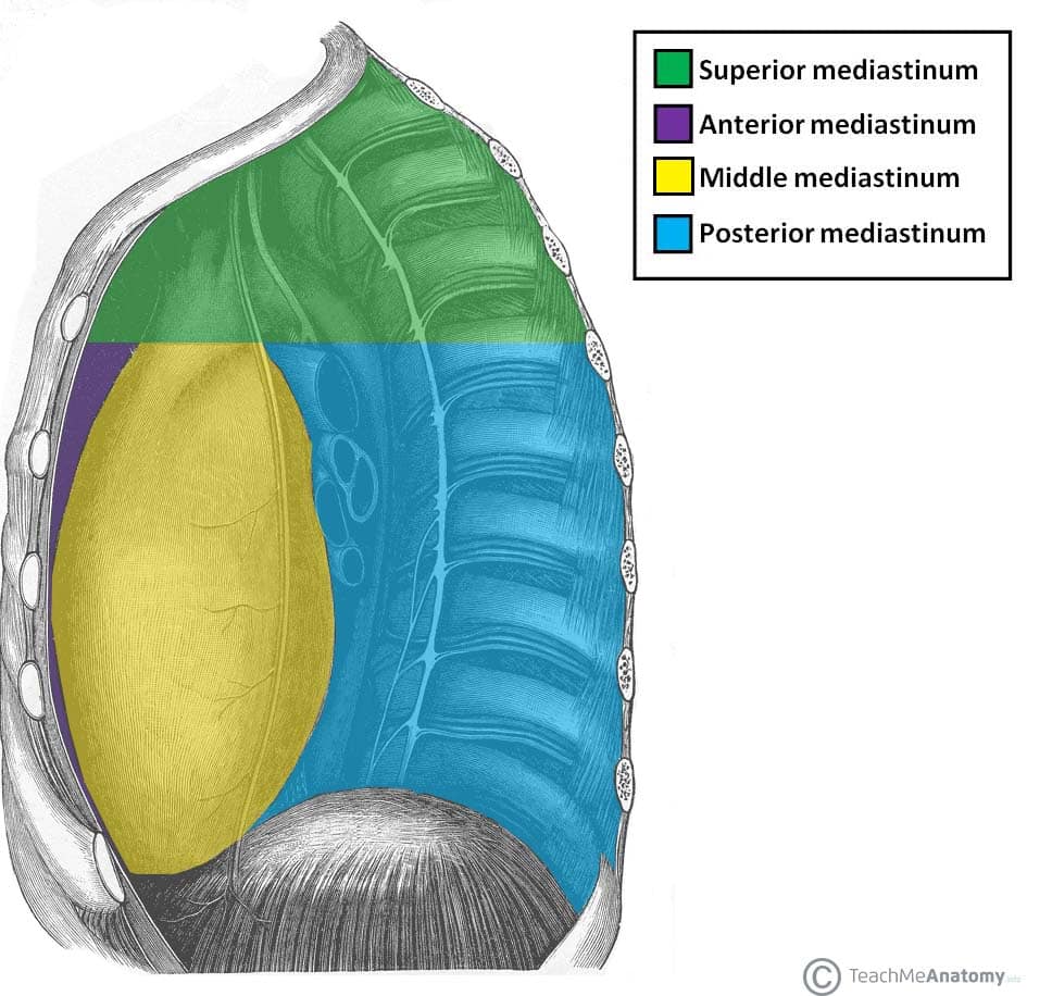 The mediastinum is the central compartment of the thoracic cavity, located between the two pleural sacs. It contains most of the thoracic organs, and acts as a conduit for structures traversing the thorax on their way into the abdomen. Anatomically, the mediastinum is divided into two parts by an imaginary line that runs from the sternal angle (the angle formed by the junction of the sternal body and manubrium) to the T4 vertebrae: Superior mediastinum – extends upwards, terminating at the superior thoracic aperture. Inferior mediastinum – extends downwards, terminating at the diaphragm. It is further subdivided into the anterior mediastinum, middle mediastinum and posterior mediastinum. In this article, we shall look at the anatomy of the middle mediastinum – its borders, contents and clinical correlations. Pro Feature - 3D Model You've Discovered a Pro Feature Access our 3D Model Library Explore, cut, dissect, annotate and manipulate our 3D models to visualise anatomy in a dynamic, interactive way. Learn More Borders The middle mediastinum is bordered by the following thoracic structures: Anterior: Anterior margin of the pericardium. Posterior: Posterior border of the pericardium. Laterally: Mediastinal pleura of the lungs. Superiorly: Imaginary line extending between the sternal angle (the angle formed by the junction of the sternal body and manubrium) and the T4 vertebrae. Inferiorly: Superior surface of the diaphragm. By TeachMeSeries Ltd (2025) Fig 1.0The mediastina of the thorax. Contents The middle mediastinum is the largest subdivision of the inferior mediastinum. It contains several important organs, vessels, nerves and lymphatic structures. Organs The middle mediastinum contains the heart, and its protective sheath, the pericardium. It also contains the tracheal bifurcation and the left and right main bronchi. Vessels The middle mediastinum is associated with the origins of the great vessels that run to and from the heart: Ascending aorta – the first part of the aorta, which arises from the aortic orifice. It moves upwards, exiting the fibrous pericardium and entering the superior mediastinum – where it then becomes the aortic arch. The ascending aorta gives rise to two branches; the left and right coronary arteries. Pulmonary trunk – gives rise to the left and right pulmonary arteries. The trunk itself is relatively short and wide, allowing a large volume of blood to pass through it. Superior vena cava – returns deoxygenated blood from the upper half of the body. It is formed by the right and left brachiocephalic veins. By TeachMeSeries Ltd (2025) Fig 1.1The great vessels of the middle mediastinum. Note how only the origins of the vessels are contained within the middle mediastinum. Nerves The cardiac plexus and the phrenic nerves are both located within the middle mediastinum. Cardiac plexus – a network of nerves located at the base of the heart, containing sympathetic and parasympathetic fibres. The sympathetic nerves are derived from the T1-T4 segments of the spinal cord, and the parasympathetic innervation is supplied by the vagus nerve. The plexus can be subdivided into superficial and deep components. Phrenic nerves (left and right) – mixed nerves that provides motor innervation to the diaphragm. They arise in the neck, and descend through the middle mediastinum to reach the diaphragm. By TeachMeSeries Ltd (2025) Fig 1.2The anatomical course of the phrenic nerves, which passes through the middle mediastinum to innervate the diaphragm. Lymphatics The tracheobronchial lymph nodes are located within the middle mediastinum. They are a group of nodes associated with the trachea and bronchi of the respiratory tract – and are characteristically enlarged in certain lung pathologies. They form from the gathering of bronchial nodes within the hila of the lungs. Individual groups of nodes are connected via fine lymphatic channels. Do you think you’re ready? Take the quiz below Pro Feature - Quiz The Middle Mediastinum Question 1 of 3 Submitting... Skip Next Rate question: You scored 0% Skipped: 0/3 1800 More Questions Available Upgrade to TeachMeAnatomy Pro Challenge yourself with over 1800 multiple-choice questions to reinforce learning Learn More Rate This Article