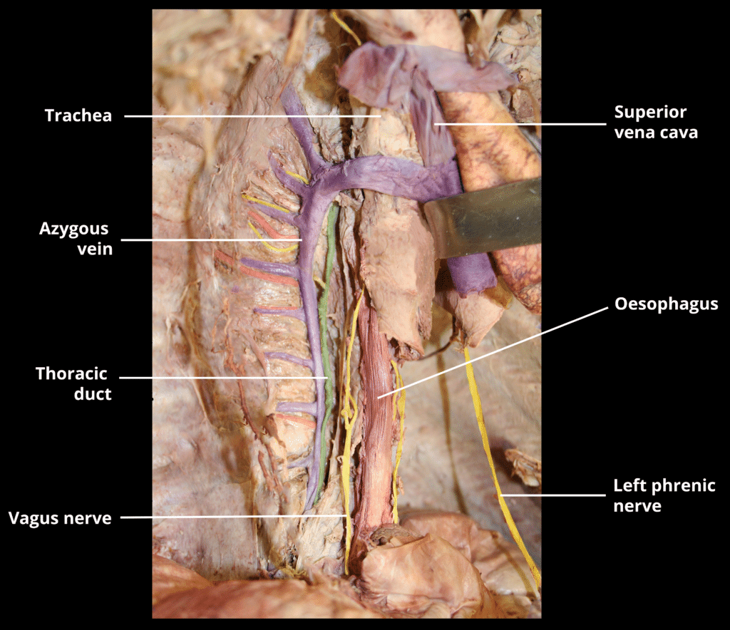 The mediastinum is the central compartment of the thoracic cavity, located between the two pleural sacs. It contains most of the thoracic organs, and acts as a conduit for structures traversing the thorax on their way into the abdomen. Anatomically, the mediastinum is divided into two parts by an imaginary line that runs from the sternal angle (the angle formed by the junction of the sternal body and manubrium) to the T4 vertebrae: Superior mediastinum – extends upwards, terminating at the superior thoracic aperture. Inferior mediastinum – extends downwards, terminating at the diaphragm. It is further subdivided into the anterior mediastinum, middle mediastinum and posterior mediastinum. In this article, we shall look at the anatomy of the posterior mediastinum – its borders, contents and clinical correlations. Pro Feature - 3D Model You've Discovered a Pro Feature Access our 3D Model Library Explore, cut, dissect, annotate and manipulate our 3D models to visualise anatomy in a dynamic, interactive way. Learn More Borders The posterior mediastinum is bordered by the following thoracic structures: Lateral: Mediastinal pleura (part of the parietal pleural membrane). Anterior: Pericardium. Posterior: T5-T12 vertebrae. Roof: Imaginary line extending between the sternal angle (the angle formed by the junction of the sternal body and manubrium) and the T4 vertebrae. Floor: Diaphragm. By TeachMeSeries Ltd (2025) Fig 1The mediastina of the thorax. Pro Feature - Dissection Images Dissection of the posterior mediastinum, demonstrating the course and drainage of the azygous vein. Dissection of the posterior mediastinum, demonstrating the course and drainage of the azygous vein. You've Discovered a Pro Feature Access our Dissection Image Library Enhance your understanding with high-resolution dissection images showcasing real-life anatomy. Learn More Contents The posterior mediastinum contains a number of major organs, blood vessels and nerves. We shall now explore the anatomy of these structures in more detail. Thoracic Aorta The thoracic (descending) aorta is a continuation of the arch of the aorta, beginning at the lower edge of the T4 vertebra. It descends through the posterior mediastinum to the left of the vertebrae, becoming more medially located as it moves. At the inferior border of T12, the thoracic aorta becomes the abdominal aorta, and passes through the aortic hiatus of the diaphragm. A number of branches arise from the thoracic aorta in the posterior mediastinum. These tend to arise in three vascular planes; unpaired branches to viscera extend anteriorly, paired branches to viscera extend laterally, and paired segmental parietal branches extend mostly posterolaterally. The major branches are: Posterior intercostal arteries – Paired parietal branches. Nine such pairs branch from the posterior aspect of the aorta, supplying the intercostal spaces (except the first two). Pass posteriorly and laterally, in parallel with the ribs. Bronchial arteries – Paired visceral branches, usually one or two. The left bronchial arteries always arise directly from the thoracic aorta, while those on the right usually branch indirectly from a right posterior intercostal artery. They go on to supply the tracheobronchial tree. Oesophageal arteries – Unpaired visceral branches, arising from the anterior aspect of the aorta. In most individuals there are two, but there can up to five. As the name suggests, these branches go on to supply the oesophagus. Superior phrenic arteries – Arise from the anterior aspect of the thoracic aorta at the aortic hiatus, varying in number. They supply the superior aspect of the diaphragm. Oesophagus The oesophagus is a muscular tube that connects the pharynx to the stomach; allowing swallowed food to pass into the digestive system. It passes into the posterior mediastinum from the superior mediastinum, descending posteriorly to the arch of the aorta and the heart. Whilst initially positioned to the right, the oesophagus deviates to the left as it moves downwards. It leaves the mediastinum via the oesophageal hiatus of the diaphragm. The oesophageal plexus is a network of nerves surrounding the oesophagus as it descends, comprising of branches from the left and right vagus nerves. Immediately above the diaphragm, the fibres of the plexus converge to form the anterior vagal trunk and posterior vagal trunk, which travel along the surface of the oesophagus as it exits the thorax. By TeachMeSeries Ltd (2025) Fig 2Posterior view of the oesophagus. Some of the thoracic vasculature is noted. Thoracic Duct The thoracic duct is the largest lymphatic vessel in the body, allowing return of lymph from most of the body (all but the right superior quadrant) into the venous system. The duct originates from the cisterna chyli in the abdomen and enters the mediastinum via the aortic hiatus. It ascends to lie directly anterior to the T6-T12 vertebrae, before deviating left as it ascends into the superior mediastinum. While located in the posterior mediastinum, the thoracic duct receives lymphatic drainage from the intercostal spaces and neighbouring anatomical structures through a number of branches. Azygos System of Veins This venous network drains blood from the body walls and mediastinal viscera and empties into the superior vena cava. It consists of three major veins: Azygos vein – Formed by the union of the right lumbar vein and the right subcostal vein. It enters the mediastinum via the aortic hiatus and drains into the superior vena cava. Hemiazygos vein – Formed by the union of the left lumbar vein and left subcostal vein. It enters the mediastinum through the left crus of the diaphragm, ascending on the left side. At the level of T8, it turns to the right and combines with the azygos vein. Accessory hemiazygos vein – Formed by the union of the fourth to eighth intercostal veins. It drains into the azygos vein at T7. By TeachMeSeries Ltd (2025) Fig 3The azygos venous n