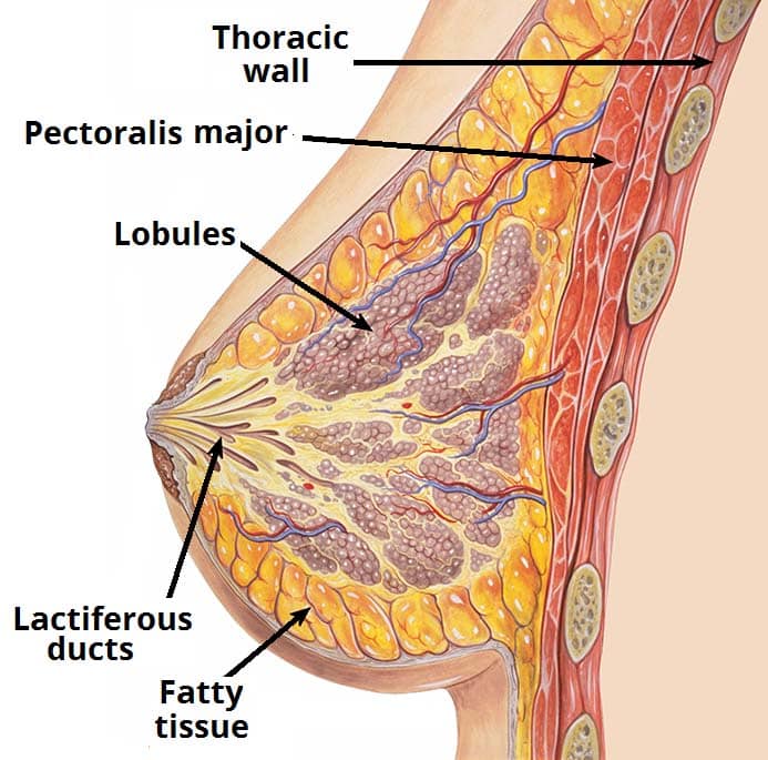 The breasts are paired structures located on the anterior thoracic wall, in the pectoral region. They are present in both males and females, yet are more prominent in females following puberty. In females, the breasts contain the mammary glands – an accessory gland of the female reproductive system. The mammary glands are the key structures involved in lactation. In this article, we shall look at the anatomy of the breasts – their structure, innervation, vascular supply and any clinical relevance. Note: This article will consider the structure of the breasts in the female. Pro Feature - 3D Model You've Discovered a Pro Feature Access our 3D Model Library Explore, cut, dissect, annotate and manipulate our 3D models to visualise anatomy in a dynamic, interactive way. Learn More Surface Anatomy The breast is located on the anterior thoracic wall. It extends horizontally from the lateral border of the sternum to the mid-axillary line. Vertically, it spans between the 2nd and 6th costal cartilages. It lies superficially to the pectoralis major and serratus anterior muscles. The breast can be considered to be composed of two regions: Circular body – largest and most prominent part of the breast. Axillary tail – smaller part, runs along the inferior lateral edge of the pectoralis major towards the axillary fossa. At the centre of the breast is the nipple, composed mostly of smooth muscle fibres. Surrounding the nipple is a pigmented area of skin termed the areolae. There are numerous sebaceous glands within the areolae – these enlarge during pregnancy, secreting an oily substance that acts as a protective lubricant for the nipple. By Ralf Roletschek [CC-BY-SA-3.0], via Wikimedia Commons Fig 1The surface anatomy of the breast. Note that the axillary tail has not been labelled in this diagram. Anatomical Structure The breast is composed of mammary glands surrounded by a connective tissue stroma. Mammary Glands The mammary glands are modified sweat glands. They consist of a series of ducts and secretory lobules (15-20). Each lobule consists of many alveoli drained by a single lactiferous duct. These ducts converge at the nipple like spokes of a wheel. Connective Tissue Stroma The connective tissue stroma is a supporting structure which surrounds the mammary glands. It has a fibrous and a fatty component. The fibrous stroma condenses to form suspensory ligaments (of Cooper). These ligaments have two main functions: Attach and secure the breast to the dermis and underlying pectoral fascia. Separate the secretory lobules of the breast. Pectoral Fascia The base of the breast lies on the pectoral fascia – a flat sheet of connective tissue associated with the pectoralis major muscle. It acts as an attachment point for the suspensory ligaments. There is a layer of loose connective tissue between the breast and pectoral fascia – known as the retromammary space. This is a potential space, often used in reconstructive plastic surgery. By Patrick J. Lynch, medical illustrator [CC BY 3.0], via Wikimedia Commons Fig 2The internal structure of the breast Vasculature Arterial supply to the medial aspect of the breast is via the internal thoracic artery (also known as internal mammary artery) – a branch of the subclavian artery. The lateral part of the breast receives blood from four vessels: Lateral thoracic and thoracoacromial branches – originate from the axillary artery. Lateral mammary branches – originate from the posterior intercostal arteries (derived from the aorta). They supply the lateral aspect of the breast in the 2nd 3rd and 4th intercostal spaces. Mammary branch – originates from the anterior intercostal artery. The veins of the breast correspond with the arteries, draining into the axillary and internal thoracic veins. Lymphatics The lymphatic drainage of the breast is of great clinical importance due to its role in the metastasis of breast cancer cells. There are three groups of lymph nodes that receive lymph from breast tissue – the axillary nodes (75%), parasternal nodes (20%) and posterior intercostal nodes (5%). The skin of the breast also receives lymphatic drainage: Skin – drains to the axillary, inferior deep cervical and infraclavicular nodes. Nipple and areola – drains to the subareolar lymphatic plexus. By TeachMeSeries Ltd (2025) Fig 3The five groups of axillary lymphatic nodes. All groups drain into the apical nodes. Nerve Supply The breast is innervated by the anterior and lateral cutaneous branches of the 4th to 6th intercostal nerves. These nerves contain both sensory and autonomic nerve fibres (the autonomic fibres regulate smooth muscle and blood vessel tone). It should be noted that these nerves do not control the production and secretion of milk. This is regulated by the hormones prolactin and oxytocin, which are secreted from the pituitary gland. Clinical Relevance Breast Cancer Breast cancer is the most common type of cancer to be diagnosed within the UK. After lung cancer it has the second highest death rate due to cancer. It is more common in women than men. Common presentations associated with breast cancer are due to blockages of the lymphatic drainage. Excess lymph builds up in the subcutaneous tissue, resulting in clinical features such as nipple deviation and retraction, and prominent skin between small dimpled pores (peau d’orange). Larger dimples are generally caused by cancerous invasions and fibrosis. This causes traction of the suspensory ligaments, causing them to shorten. Metastasis commonly occurs through the lymph nodes. It is most likely to be the axillary lymph nodes that are involved. They become stony hard and fixed. Following this, the cancer can spread to distant places such as the liver, lungs, bones and ovary. To assess a suspected breast cancer a triple assessment is carried out. This involves clinical examination, imaging using a mammogram and ultrasound scan and finally a biopsy. The staging of breast cancer uses the I-