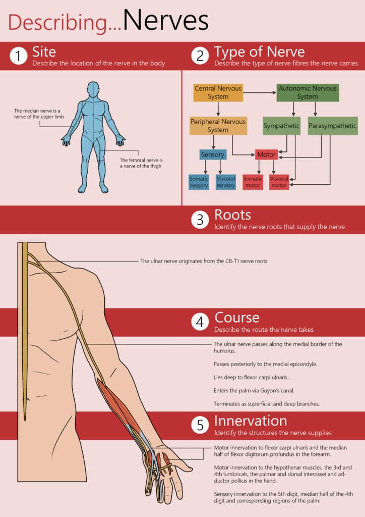 The study of the nervous system is essential for understanding innervation patterns, motor and sensory function, and neurovascular relationships. Given the complexity of the nervous system, using a consistent method to learn the features of each nerve is beneficial. In this article, a five-part framework for describing nerves will be outlined – site, type of nerve, roots, course, and innervation. This structure can be applied to any peripheral nerve and forms the basis for effective anatomical learning. Department of Anatomy, University of East Anglia A 5-part framework for learning the anatomy of nerves Pro Feature - 3D Model You've Discovered a Pro Feature Access our 3D Model Library Explore, cut, dissect, annotate and manipulate our 3D models to visualise anatomy in a dynamic, interactive way. Learn More Site The site refers to the anatomical region in which the nerve is located. This provides context for the structures the nerve supplies and its relationship to other anatomical landmarks. Examples: The median nerve is a nerve of the upper limb. The femoral nerve is a nerve of the thigh. The sciatic nerve is a nerve of the posterior lower limb. Type of Nerve The type of nerve describes the kind of fibres the nerve carries, which may include motor, sensory, or autonomic components. This classification helps predict the function of the nerve. Examples: The median nerve carries motor and sensory fibres to the forearm and hand. The femoral nerve carries motor fibres to the anterior thigh and sensory fibres to the thigh and leg. The vagus nerve carries motor, sensory, and parasympathetic fibres to thoracic and abdominal organs. Roots The roots describe the spinal nerve roots that contribute to the formation of a peripheral nerve. Peripheral nerves arise from the spinal cord as ventral (motor) and dorsal (sensory) roots, which join to form a spinal nerve. These roots combine and reorganise within nerve plexuses to give rise to the major peripheral nerves of the body. Examples: The ulnar nerve contains fibres from the C8–T1 nerve roots. The median nerve contains fibres from the C5–T1 nerve roots. The femoral nerve contains fibres from the L2–L4 nerve roots. Course The course describes the route the nerve takes as it travels through the body. This includes its relationships with surrounding structures and any notable anatomical landmarks it passes. Example (ulnar nerve): Passes along the medial border of the humerus. Passes posterior to the medial epicondyle. Lies deep to the flexor carpi ulnaris in the forearm. Enters the palm via Guyon’s canal. Terminates as superficial and deep branches. Innervation The innervation describes the structures supplied by the nerve. This includes motor innervation to muscles, sensory innervation to skin and joints, and in some cases, autonomic innervation (such as sympathetic or parasympathetic fibres to glands, blood vessels, or internal organs). Examples: The ulnar nerve provides motor supply to intrinsic hand muscles and sensory supply to the medial 1.5 digits. The median nerve provides motor supply to most forearm flexors and thenar muscles, and sensory supply to the lateral 3.5 digits. The vagus nerve provides motor, sensory, and parasympathetic supply to thoracic and abdominal organs. Rate This Article