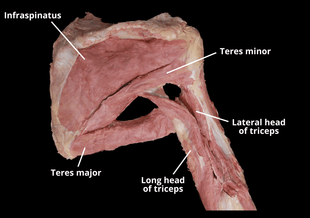 The quadrangular space is an anatomical space is the posterior axilla region. It provides a conduit for structures to pass between the axilla and the posterior compartment of the arm. In this article, we shall look at the anatomy of the quadrangular space – its borders, contents and clinical relevance. Pro Feature - 3D Model You've Discovered a Pro Feature Access our 3D Model Library Explore, cut, dissect, annotate and manipulate our 3D models to visualise anatomy in a dynamic, interactive way. Learn More Borders The quadrangular space is rectangular-shaped with four boundaries: Superior – inferior margin of teres minor. Lateral – surgical neck of the humerus. Medial – long head of triceps brachii. Inferior – superior aspect of teres major. By TeachMeSeries Ltd (2025) Fig 1Posterior view of the shoulder region, showing the quadrangular space. The subscapularis muscle lies anteriorly, and so cannot be seen on this view. Pro Feature - Dissection Images Prosection of the muscles of the posterior shoulder and upper arm, demonstrating the quadrangular space. Prosection of the muscles of the posterior shoulder and upper arm, demonstrating the quadrangular space. You've Discovered a Pro Feature Access our Dissection Image Library Enhance your understanding with high-resolution dissection images showcasing real-life anatomy. Learn More Contents The quadrangular space is a passageway that allows structures to travel between the axilla and posterior compartment of the upper arm. It contains the axillary nerve and posterior circumflex humeral artery (and accompanying vein) as they travel into the posterior upper arm. By TeachMeSeries Ltd (2025) Fig 2Contents of the quadrangular space; the axillary nerve and posterior circumflex humeral artery. Quadrangular Space Syndrome Quadrangular space syndrome refers to compression of the axillary nerve and posterior circumflex humeral artery as they pass through the quadrangular space. Compression is thought to occur secondary to hypertrophy of the muscular borders of the space, or by the formation of fibrotic bands between the muscles. Clinical features include pain and paraesthesia in the distribution of the axillary nerve, as well as pain upon shoulder abduction and external rotation. Do you think you’re ready? Take the quiz below Pro Feature - Quiz The Quadrangular Space Question 1 of 3 Submitting... Skip Next Rate question: You scored 0% Skipped: 0/3 1800 More Questions Available Upgrade to TeachMeAnatomy Pro Challenge yourself with over 1800 multiple-choice questions to reinforce learning Learn More Rate This Article