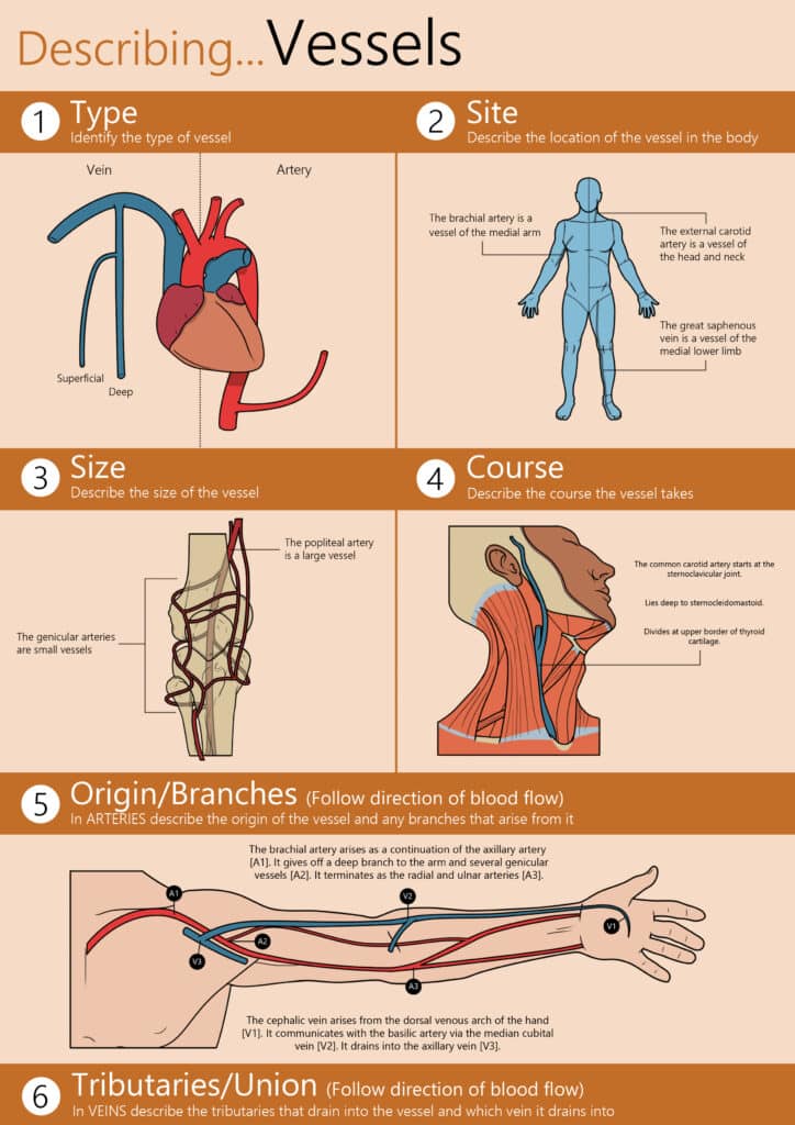 The study of vascular anatomy is essential for understanding circulation, organ perfusion, and relationships within neurovascular bundles. Given the complexity of the vascular system, using a consistent method to learn the features of each vessel is beneficial. In this article, a six-part framework for describing vessels will be outlined – type, site, size, course, origin/branches, and tributaries/union. This structure can be applied to any vessel and forms the basis for effective anatomical learning. Department of Anatomy, University of East Anglia A 6-part framework for learning the anatomy of blood vessels Pro Feature - 3D Model You've Discovered a Pro Feature Access our 3D Model Library Explore, cut, dissect, annotate and manipulate our 3D models to visualise anatomy in a dynamic, interactive way. Learn More Type The type identifies whether the vessel is an artery or a vein. For veins, it is also useful to specify whether the vessel is part of the superficial or deep venous system. Examples: The brachial artery is an artery of the upper limb. The cephalic vein is a superficial vein of the upper limb. The femoral vein is a deep vein of the lower limb. Site The site describes the anatomical region in which the vessel is located. This helps to relate the vessel to nearby structures. Examples: The brachial artery is a vessel of the medial arm. The external carotid artery is a vessel of the head and neck. The great saphenous vein is a vessel of the medial lower limb. Size The size describes the relative calibre of the vessel. This can help distinguish between major arteries or veins and their smaller branches. Examples: The popliteal artery is a large vessel. The genicular arteries are small vessels. The basilic vein is a large superficial vein. Course The course describes the path the vessel takes through the body, including its relation to key anatomical landmarks. Examples: The common carotid artery starts at the sternoclavicular joint, lies deep to sternocleidomastoid, and divides at the upper border of the thyroid cartilage. The great saphenous vein ascends anterior to the medial malleolus and travels along the medial aspect of the thigh. The brachial artery runs along the medial side of the humerus, deep to the biceps brachii. Origin/Branches In arteries, this describes where the vessel originates and any branches that arise from it. The pattern follows the direction of blood flow. Examples: The brachial artery arises as a continuation of the axillary artery. It gives off branches to the arm and terminates as the radial and ulnar arteries. The external carotid artery arises from the common carotid artery and gives off several branches to the face and neck. The popliteal artery is a continuation of the femoral artery and gives rise to the genicular arteries. Tributaries/Union In veins, this describes the tributaries that drain into the vessel and where the vessel ultimately drains. Examples: The cephalic vein arises from the dorsal venous arch, receives the median cubital vein, and drains into the axillary vein. The great saphenous vein receives tributaries from the superficial veins of the leg and drains into the femoral vein. The basilic vein receives tributaries from the medial forearm and joins the brachial veins to form the axillary vein. Rate This Article