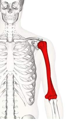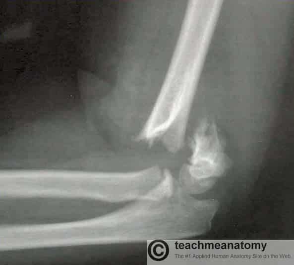 The humerus is a long bone of the upper limb, which extends from the shoulder to the elbow. The proximal aspect of the humerus articulates with the glenoid fossa of the scapula, forming the glenohumeral joint. Distally, at the elbow joint, the humerus articulates with the head of the radius and trochlear notch of the ulna. In this article, we shall look at the anatomy of the humerus – its bony landmarks and clinical correlations. By Anatomography [CC BY-SA 2.1 jp], via Wikimedia Commons Fig 1The anatomical position of the humerus Pro Feature - 3D Model You've Discovered a Pro Feature Access our 3D Model Library Explore, cut, dissect, annotate and manipulate our 3D models to visualise anatomy in a dynamic, interactive way. Learn More Proximal Landmarks The proximal humerus is marked by a head, anatomical neck, surgical neck, greater and lesser tuberosity and intertubercular sulcus. The upper end of the humerus consists of the head. This faces medially, upwards and backwards and is separated from the greater and lesser tuberosities by the anatomical neck. The greater tuberosity is located laterally on the humerus and has anterior and posterior surfaces. It serves as an attachment site for three of the rotator cuff muscles – supraspinatus, infraspinatus and teres minor – they attach to superior, middle and inferior facets (respectively) on the greater tuberosity. The lesser tuberosity is much smaller, and more medially located on the bone. It only has an anterior surface. It provides attachment for the last rotator cuff muscle – the subscapularis. Separating the two tuberosities is a deep groove, known as the intertubercular sulcus. The tendon of the long head of the biceps brachii emerges from the shoulder joint and runs through this groove. The edges of the intertubercular sulcus are known as lips. Pectoralis major, teres major and latissimus dorsi insert on the lips of the intertubercular sulcus. This can be remembered with the mnemonic “a lady between two majors”, with latissimus dorsi attaching between teres major on the medial lip and pectoralis major laterally. The surgical neck extends from just distal to the tuberosities to the shaft of the humerus. The axillary nerve and circumflex humeral vessels lie against the bone here. By TeachMeSeries Ltd (2025) Fig 2The proximal aspect of the humerus. Note the greater and lesser tuberosities as a site of attachment for muscles. Clinical Relevance Surgical Neck Fracture The surgical neck of the humerus is a frequent site of fracture – usually by a direct blow to the area, or falling on an outstretched hand. The key neurovascular structures at risk here are the axillary nerve and posterior circumflex artery. Axillary nerve damage will result in paralysis to the deltoid and teres minor muscles. The patient will have difficulty performing abduction of the affected limb. The nerve also innervates the skin over the lower deltoid (regimental badge area), and therefore sensation in this region may be impaired. Shaft The shaft of the humerus is the site of attachment for various muscles. Cross section views reveal it to be circular proximally and flattened distally. On the lateral side of the humeral shaft is a roughened surface where the deltoid muscle attaches. This is known is as the deltoid tuberosity. The radial (or spiral) groove is a shallow depression that runs diagonally down the posterior surface of the humerus, parallel to the deltoid tuberosity. The radial nerve and profunda brachii artery lie in this groove. The following muscles attach to the humerus along its shaft: Anteriorly – coracobrachialis, deltoid, brachialis, brachioradialis. Posteriorly – medial and lateral heads of the triceps (the spiral groove demarcates their respective origins). Clinical Relevance Mid-Shaft Fracture A mid-shaft fracture of the humerus risk damage to the radial nerve and profunda brachii artery (as they are tightly bound in the radial groove). The radial nerve innervates the extensors of the wrist. In the event of damage to this nerve (either direct or as a consequence of swelling), the extensors will be paralysed. This results in unopposed flexion of the wrist, known as ‘wrist drop’. There can also be some sensory loss over the dorsal (posterior) surface of the hand, and the proximal ends of the lateral 3 and a half fingers dorsally. By Shoulderdoc.co.uk [CC BY-SA 2.0] Fig 3Wristdrop of the left forearm, as a result of radial nerve palsy. Distal Region The lateral and medial borders of the distal humerus form medial and lateral supraepicondylar ridges. The lateral supraepicondylar ridge is more roughened, providing the site of common origin of the forearm extensor muscles. Immediately distal to the supraepicondylar ridges are extracapsular projections of bone, the lateral and medial epicondyles. Both can be palpated at the elbow. The medial is the larger of the two and extends more distally. The ulnar nerve passes in a groove on the posterior aspect of the medial epicondyle where it is palpable. Distally, the trochlea is located medially, and extends onto the posterior aspect of the bone. Lateral to the trochlea is the capitulum, which articulates with the radius. Also located on the distal portion of the humerus are three depressions, known as the coronoid, radial and olecranon fossae. They accommodate the forearm bones during flexion or extension at the elbow. By TeachMeSeries Ltd (2025) Fig 4Bony landmarks of the distal humerus. It articulates with the radius and ulna to form the elbow joint. Articulations The proximal region of the humerus articulates with the glenoid fossa of the scapula to form the glenohumeral joint (shoulder joint). Distally, at the elbow joint, the capitulum of the humerus articulates with the head of the radius and the trochlea of the humerus articulates with the trochlear notch of the ulna. Clinical Relevance Supracondylar Fracture A supracondylar fracture is a fracture of the distal humerus just above th