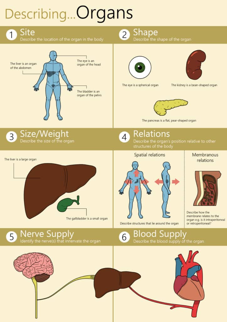 The study of visceral anatomy is essential for understanding the structure, function, and relationships of the internal systems of the body. Given the number and complexity of organs, using a consistent method to learn their features is beneficial. In this article, a six-part framework for describing organs will be outlined – site, shape, size/weight, relations, nerve supply, and blood supply. This structure can be applied to any organ and forms the basis for effective anatomical learning. Department of Anatomy, University of East Anglia A 6-part framework for learning the anatomy of organs Pro Feature - 3D Model You've Discovered a Pro Feature Access our 3D Model Library Explore, cut, dissect, annotate and manipulate our 3D models to visualise anatomy in a dynamic, interactive way. Learn More Site The site refers to the anatomical location of the organ within the body. This provides context for its function and neighbouring structures. Examples: The liver is an organ of the abdomen. The eye is an organ of the head. The bladder is an organ of the pelvis. Shape The shape describes the external form of the organ. This is often linked to its function and anatomical relations. Examples: The eye is a spherical organ. The kidney is a bean-shaped organ. The pancreas is a flat, pear-shaped organ. Size/Weight The size or weight describes the physical dimensions of the organ. This can vary between individuals and may change with age or disease. Examples: The liver is a large organ. The gallbladder is a small organ. The thyroid gland is a small, butterfly-shaped organ. Relations The relations describe the position of the organ relative to other structures. This includes both spatial relations (surrounding organs or structures) and membranous relations (such as whether the organ is intraperitoneal or retroperitoneal). Examples: The stomach lies anterior to the pancreas. The kidney is a retroperitoneal organ. The bladder is positioned posterior to the pubic symphysis. Nerve Supply The nerve supply identifies the nerves that innervate the organ. This may include both somatic and autonomic fibres, depending on the organ. Examples: The liver is innervated by the hepatic plexus. The bladder receives innervation from the pelvic splanchnic nerves (parasympathetic) and hypogastric plexus (sympathetic). The heart is innervated by the cardiac plexus, which carries sympathetic and parasympathetic fibres. Blood Supply The blood supply describes the arterial supply and venous drainage of the organ. This is key to understanding physiological function and conditions that impair blood flow – such as ischaemia. Examples: The liver is supplied by the hepatic artery and portal vein. The kidney is supplied by the renal artery. The bladder is supplied by the superior and inferior vesical arteries. Rate This Article