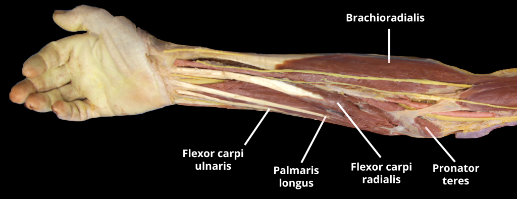 The anterior compartment of the forearm contains muscles primarily involved in flexion and pronation. These muscles are arranged into three layers based on their depth: Superficial – flexor carpi ulnaris, palmaris longus, flexor carpi radialis, pronator teres. Intermediate – flexor digitorum superficialis. Deep – flexor pollicis longus, flexor digitorum profundus and pronator quadratus. They are mostly innervated by the median nerve (except for the flexor carpi ulnaris and medial half of flexor digitorum profundus, innervated by the ulnar nerve). They receive arterial supply from the ulnar artery and radial artery. In this article, we shall look at the anatomy of the muscles in the anterior compartment of the forearm – their attachments, actions, innervation and clinical correlations. Pro Feature - 3D Model You've Discovered a Pro Feature Access our 3D Model Library Explore, cut, dissect, annotate and manipulate our 3D models to visualise anatomy in a dynamic, interactive way. Learn More Superficial Compartment The superficial muscles in the anterior compartment are the flexor carpi ulnaris, palmaris longus, flexor carpi radialis and pronator teres. They all originate from a common tendon, which arises from the medial epicondyle of the humerus. Flexor Carpi Ulnaris Attachments: The flexor carpi ulnaris has two origins. The humeral head originates from the medial epicondyle of the humerus with the other superficial flexors, whilst the ulnar head originates from the olecranon of the ulna. The muscle tendon passes into the wrist and attaches to the pisiform bone, hook of hamate, and base of the 5th metacarpal Actions: Flexion and adduction at the wrist. Innervation: Ulnar nerve. Palmaris Longus This muscle is absent in about 15% of the population. Attachments: Originates from the medial epicondyle of the humerus. It attaches to the flexor retinaculum and palmar aponeurosis of the hand. Actions: Flexion at the wrist. Innervation: Median nerve. Flexor Carpi Radialis Attachments: Originates from the medial epicondyle, attaches to the base of metacarpals II and III. Actions: Flexion and abduction at the wrist. Innervation: Median nerve. Pronator Teres The lateral border of the pronator teres forms the medial border of the cubital fossa, an anatomical triangle located over the elbow. Attachments: It has two origins, one from the medial epicondyle, and the other from the coronoid process of the ulna. It attaches laterally to the mid-shaft of the radius. Actions: Pronation of the forearm. Innervation: Median nerve. By TeachMeSeries Ltd (2025) Fig 1The superficial muscles of the anterior forearm. Pro Feature - Dissection Images Prosetion of the superficial compartment of the anterior forearm Prosetion of the superficial compartment of the anterior forearm You've Discovered a Pro Feature Access our Dissection Image Library Enhance your understanding with high-resolution dissection images showcasing real-life anatomy. Learn More Intermediate Compartment The flexor digitorum superficialis is the only muscle of the intermediate compartment. It can sometimes be classed as a superficial muscle, but in most individuals, it lies between the deep and superficial muscle layers. The muscle is a good anatomical landmark in the forearm – the median nerve and ulnar artery pass between its two heads, and then travel posteriorly. Attachments: It has two heads – one originates from the medial epicondyle of the humerus, the other from the radius. The muscle splits into four tendons at the wrist, which travel through the carpal tunnel, and attach to the base of the middle phalanx of the four digits. Actions: Flexes the metacarpophalangeal joints and proximal interphalangeal joints at the 4 fingers, and flexes at the wrist. Innervation: Median nerve. Adobe Stock, Licensed to TeachMeSeries Ltd Fig 2Flexor digitorum superficialis. It has two heads, which arise from the medial epicondyle of the humerus and the shaft of the radius. Deep Compartment There are three muscles in the deep anterior forearm: flexor digitorum profundus, flexor pollicis longus, and pronator quadratus. Flexor Digitorum Profundus Attachments: Originates from the ulna and associated interosseous membrane. At the wrist, it splits into four tendons, that pass through the carpal tunnel and attach to the distal phalanges of the four fingers. Actions: It is the only muscle that can flex the distal interphalangeal joints of the fingers. It also flexes at metacarpophalangeal joints and at the wrist. Innervation: The medial half (acts on the little and ring fingers) is innervated by the ulnar nerve. The lateral half (acts on the middle and index fingers) is innervated by the anterior interosseous branch of the median nerve. Flexor Pollicis Longus This muscle lies laterally to the flexor digitorum profundus Attachments: Originates from the anterior surface of the radius and surrounding interosseous membrane. Attaches to the base of the distal phalanx of the thumb. Actions: Flexes the interphalangeal joint and metacarpophalangeal joint of the thumb. Innervation: Median nerve (anterior interosseous branch). Pronator Quadratus A square shaped muscle found deep to the tendons of the flexor digitorum profundus and flexor pollicis longus. Attachments: Originates from the anterior surface of the ulna and attaches to the anterior surface of the radius. Actions: Pronates the forearm. Innervation: Median nerve (anterior interosseous branch). By TeachMeSeries Ltd (2025) Fig 3Deep flexor muscles of the anterior forearm. Do you think you’re ready? Take the quiz below Pro Feature - Quiz Muscles in the Anterior Compartment of the Forearm Question 1 of 3 Submitting... Skip Next Rate question: You scored 0% Skipped: 0/3 1800 More Questions Available Upgrade to TeachMeAnatomy Pro Challenge yourself with over 1800 multiple-choice questions to reinforce learning Learn More Rate This Article