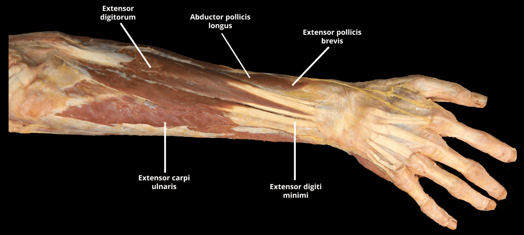 The muscles in the posterior compartment of the forearm are commonly known as the extensor muscles. The general function of these muscles is to produce extension at the wrist and fingers. They are all innervated by the radial nerve. The muscles in this compartment are organised into two layers deep and superficial. These two layers are separated by a layer of fascia. In this article, we shall look at the anatomy of the muscles in the posterior forearm – their attachments, actions and clinical relevance. Pro Feature - 3D Model You've Discovered a Pro Feature Access our 3D Model Library Explore, cut, dissect, annotate and manipulate our 3D models to visualise anatomy in a dynamic, interactive way. Learn More Superficial Muscles The superficial layer of the posterior forearm contains seven muscles. Four of these muscles (extensor carpi radialis brevis, extensor digitorum, extensor carpi ulnaris and extensor digiti minimi) share a common tendinous origin at the lateral epicondyle. Brachioradialis The brachioradialis is a paradoxical muscle. Its origin and innervation are characteristic of an extensor muscle, but it is actually a flexor at the elbow. The muscle is most visible when the forearm is half pronated, and flexing at the elbow against resistance. In the distal forearm, the radial artery and nerve are sandwiched between the brachioradialis and the deep flexor muscles. Attachments: Originates from the proximal aspect of the lateral supracondylar ridge of humerus, and attaches to the distal end of the radius, just before the radial styloid process. Actions: Flexes at the elbow. Contributes to supination at the proximal radioulnar joint. Innervation: Radial nerve. By TeachMeSeries Ltd (2025) Fig 1The muscles in the superficial layer of the posterior forearm. Extensor Carpi Radialis Longus and Brevis The extensor carpi radialis muscles are situated on the lateral aspect of the posterior forearm. Due to their position, they are able to produce abduction as well as extension at the wrist. Attachments: The ECRL originates from the lateral supracondylar ridge of the humerus, while the ECRB originates from the lateral epicondyle. Their tendons attach to metacarpal bones II and III. Actions: Extends and abducts the wrist. Innervation: Radial nerve. Extensor Digitorum Communis The extensor digitorum is the main extensor of the fingers. To test the function of the muscle, the forearm is pronated, and the fingers extended against resistance. Attachments: Originates from the lateral epicondyle. The tendon continues into in the distal part of the forearm, where it splits into four, and inserts into the extensor hood of each finger. Actions: Extension of the digits at the interphalangeal and metacarpophalangeal joints. Innervation: Radial nerve (deep branch). Extensor Digiti Minimi The extensor digiti minimi is thought to originate from the extensor digitorum muscle. In some people, these two muscles are fused together. It lies medially to the extensor digitorum. Attachments: Originates from the lateral epicondyle of the humerus. It attaches, with the extensor digitorum tendon, into the extensor hood of the little finger. Actions: Extends the little finger, and contributes to extension at the wrist. Innervation: Radial nerve (deep branch). Extensor Carpi Ulnaris The extensor carpi ulnaris is located on the medial aspect of the posterior forearm. Due to its position, it is able to produce adduction as well as extension at the wrist. Attachments: Originates from the lateral epicondyle of the humerus, and posterior border of the ulna. It attaches to the base of fifth metacarpal. Actions: Extension and adduction of wrist. Innervation: Radial nerve (deep branch). Anconeus The anconeus is situated medially and proximally in the extensor compartment of the forearm. It is blended with the fibres of the triceps brachii, and the two muscles can be indistinguishable. Attachments: Originates from the lateral epicondyle, and attaches to the posterior and lateral part of the olecranon. Actions: Extends and stabilises the elbow joint. Abducts the ulna during pronation of the forearm. Innervation: Radial nerve. By TeachMeSeries Ltd (2025) Fig 2Cross section of the muscles of the distal forearm. Some extensor muscles, such as the anconeus, are not visible as they are situated proximally in the forearm. Clinical Relevance Lateral Epicondylitis Lateral epicondylitis (or tennis elbow) refers to inflammation of the periosteum of the lateral epicondyle. The peak age of onset is 40-50 years old. It is caused by repeated use of the superficial extensor muscles, which strains their common tendinous attachment to the lateral epicondyle. Pro Feature - Dissection Images Prosection of the superficial layer of muscles within the posterior compartment of the forearm. Prosection of the superficial layer of muscles within the posterior compartment of the forearm. You've Discovered a Pro Feature Access our Dissection Image Library Enhance your understanding with high-resolution dissection images showcasing real-life anatomy. Learn More Deep Muscles There are five muscles in the deep compartment of the posterior forearm – the supinator, abductor pollicis longus, extensor pollicis brevis, extensor pollicis longus and extensor indicis. With the exception of the supinator, these muscles act on the thumb and the index finger. Supinator The supinator lies in the floor of the cubital fossa. It has two heads, which the deep branch of the radial nerve passes between. Attachments: It has two heads of origin. One originates from the lateral epicondyle of the humerus, the other from the posterior surface of the ulna. They insert together into the posterior surface of the radius. Actions: Supinates the forearm. Innervation: Radial nerve (deep branch). By TeachMeSeries Ltd (2025) Fig 3Muscles in the deep layer of the posterior forearm. Abductor Pollicis Longus The abductor pollicis longus is situated immediately distal to the supinator muscle.