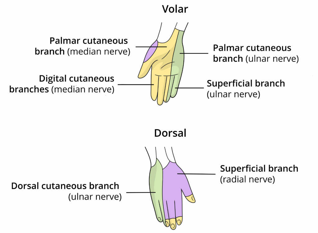 The cutaneous innervation of the upper limb describes the nerve supply to specific areas of the skin of the upper limb. There are two distinct innervation patterns: Peripheral nerve pattern – area of skin supplied by a specific peripheral nerve. Dermatome pattern – area of skin supplied by a specific spinal nerve. In this article, we shall look at the anatomy of both the peripheral nerve and dermatome patterns of cutaneous innervation of the upper limb. Pro Feature - 3D Model You've Discovered a Pro Feature Access our 3D Model Library Explore, cut, dissect, annotate and manipulate our 3D models to visualise anatomy in a dynamic, interactive way. Learn More Shoulder Region The cutaneous sensation to the shoulder region is supplied mainly by the supraclavicular nerve, axillary nerve, and intercostobrachial nerve. Supraclavicular nerves (C3–C4) – arise from the cervical plexus and supply the skin over the clavicle, upper pectoral region, and superior shoulder. Axillary nerve (C5–C6) – arises from the posterior cord of the brachial plexus and gives rise to the upper lateral cutaneous nerve of the arm. This branch supplies skin over the lower part of the deltoid muscle (the regimental badge area). Intercostobrachial nerve (T2) – the lateral cutaneous branch of T2 and supplies the axilla and proximal medial arm. By TeachMeSeries Ltd (2025) Fig 1Peripheral nerve cutaneous innervation to the upper limb Upper Arm In the upper arm, sensory supply is delivered through branches of the radial nerve, the medial brachial cutaneous nerve, and communicating branches from the intercostobrachial nerve. The radial nerve gives rise to two main branches that supply sensation to the upper arm: Lower lateral cutaneous nerve of the arm – supplies the lower lateral aspect of the upper arm. Posterior cutaneous nerve of the arm – supplies the posterior aspect of the upper arm. The medial cutaneous nerve of arm is a direct branch of the medial cord of the brachial plexus, containing fibres from C8 and T1. It supplies the medial arm and overlaps with the intercostobrachial nerve. The medial cutaneous nerve of the forearm primarily supplies the forearm but may also contribute sensory fibres to the distal medial upper arm, creating additional overlap in this region. Forearm The forearm is supplied by the lateral, medial, and posterior antebrachial cutaneous nerves. Lateral cutaneous nerve of forearm – the terminal sensory branch of the musculocutaneous nerve and supplies the lateral forearm. Medial cutaneous nerve of forearm – direct branch of the medial cord of the brachial plexus, containing fibres from C8 and T1. It supplies the anterior and posterior medial forearm. Posterior cutaneous nerve of forearm – arises from the radial nerve and supplies the posterior forearm to the wrist. Hand The cutaneous innervation of the hand is provided primarily by the median, ulnar, and superficial branch of the radial nerve. Sensation is ultimately delivered to the digits via common palmar digital nerves (which run in the palm) and proper palmar digital nerves (which supply the sides of each finger). Median Nerve The median nerve arises from both the lateral and medial cords of the brachial plexus, containing fibres from C5–T1. Proximal to the carpal tunnel, it gives rise to the palmar cutaneous branch – which runs superficial to the flexor retinaculum to innervate the palm. After passing through the carpal tunnel, the nerve gives off sensory branches that supply the digits: Lateral branch – gives proper digital nerves to the palmar aspect of the thumb and the radial side of the index finger. Medial branch – gives two common palmar digital nerves. Each divides into proper palmar digital nerves that supply: Ulnar side of the index finger and radial side of the middle finger. Ulnar side of the middle finger and radial side of the ring finger. The median nerve also gives dorsal digital branches to the nail beds of the thumb, index finger, middle finger, and radial side of the ring finger. Adobe Stock, Licensed to TeachMeSeries Ltd Fig 2The cutaneous supply to the hands. Ulnar Nerve The ulnar nerve arises from the medial cord of the brachial plexus (C8–T1). It gives off a palmar cutaneous branch in the distal forearm that supplies the hypothenar region of the palm, and a dorsal cutaneous branch that supplies the dorsoulnar hand and proximal phalanges of the ring and little fingers. After passing through Guyon’s canal at the wrist, it divides into a superficial branch (sensory) and a deep branch (motor). The superficial branch gives rise to: Common palmar digital nerve – bifurcates into proper digital nerves that supply the ulnar side of the ring finger and radial side of the little finger. Proper palmar digital nerve – for the ulnar side of the little finger. It also contributes dorsal digital branches to the dorsal aspects of these digits. Superficial Radial Nerve The superficial branch of the radial nerve arises from the radial nerve in the proximal forearm. It travels deep to brachioradialis before emerging near the wrist. It supplies the dorsolateral hand, including the dorsal thumb and the proximal dorsal aspects of the index, middle, and radial side of the ring finger. The fingertips of these digits are instead innervated by the median and ulnar nerves. Dermatomes Dermatomes refer to a region of skin supplied by nerve fibres from a spinal root. They are most commonly used when assessing for spinal cord pathology The dermatomes of the upper limb are as follows: C4 – superior shoulder C5 – lateral upper arm C6 – lateral forearm and thumb C7 – index and middle fingers C8 – little finger and medial hand T1 – medial forearm T2 – distal medial upper arm T3 – proximal medial upper arm and axilla By TeachMeSeries Ltd (2025) Fig 2The Keegan and Garrett dermatomal distribution. Do you think you’re ready? Take the quiz below Pro Feature - Quiz The Cutaneous Innervation of the Upper 