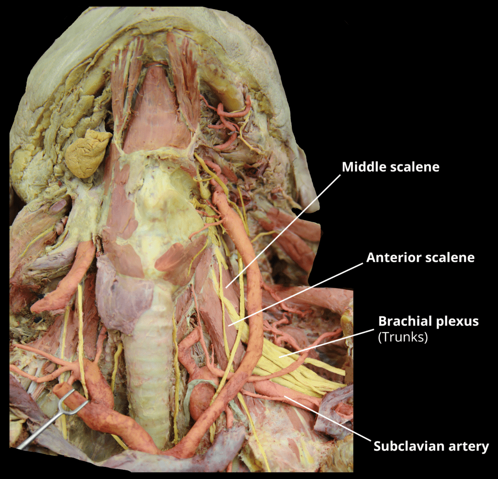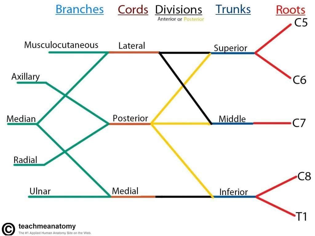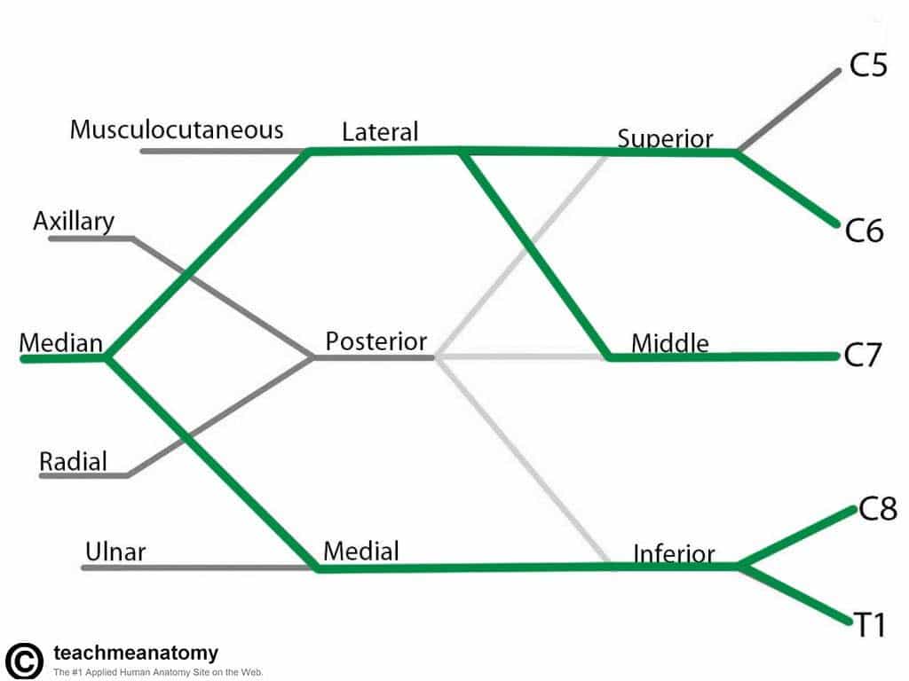 The brachial plexus is a network of nerve fibres that supplies the skin and musculature of the upper limb. It begins in the root of the neck, passes through the axilla, and runs through the entire upper extremity. The plexus is formed by the anterior rami (divisions) of cervical spinal nerves C5, C6, C7 and C8, and the first thoracic spinal nerve, T1. In this article, we shall look at the anatomy of the brachial plexus – its formation and anatomical course through the body. The brachial plexus is divided into five parts; roots, trunks, divisions, cords and branches (a good mnemonic for this is Read That Damn Cadaver Book). There are no functional differences between these divisions – they are simply used to aid explanation of the brachial plexus. Pro Feature - 3D Model You've Discovered a Pro Feature Access our 3D Model Library Explore, cut, dissect, annotate and manipulate our 3D models to visualise anatomy in a dynamic, interactive way. Learn More Roots The ‘roots’ refer the anterior rami of the spinal nerves that comprise the brachial plexus. These are the anterior rami of spinal nerves C5, C6, C7, C8, and T1. At each vertebral level, paired spinal nerves arise. They leave the spinal cord via the intervertebral foramina of the vertebral column. Each spinal nerve then divides into an anterior and a posterior ramus. The roots of the brachial plexus are formed by the anterior rami of spinal nerves C5-T1 (the posterior divisions innervate the skin and musculature of the intrinsic back muscles). After their formation, these nerves pass between the anterior and medial scalene muscles to enter the base of the neck. By TeachMeSeries Ltd (2025) Fig 1Proximal portion of the brachial plexus in the neck. By TeachMeSeries Ltd (2025) Fig 2The spinal cord outflow at each vertebral level. The anterior rami of vertebral levels C5-C8 and T1 make up the roots of the brachial plexus. Pro Feature - Dissection Images The root of the neck. The trunks of the brachial plexus are visible emerging between the anterior and middle scalene muscles. The root of the neck. The trunks of the brachial plexus are visible emerging between the anterior and middle scalene muscles. You've Discovered a Pro Feature Access our Dissection Image Library Enhance your understanding with high-resolution dissection images showcasing real-life anatomy. Learn More Trunks At the base of the neck, the roots of the brachial plexus converge to form three trunks. These structures are named by their relative anatomical location: Superior trunk – a combination of C5 and C6 roots. Middle trunk – continuation of C7. Inferior trunk – combination of C8 and T1 roots. The trunks traverse laterally, crossing the posterior triangle of the neck. Divisions Each trunk divides into two branches within the posterior triangle of the neck. One division moves anteriorly (toward the front of the body) and the other posteriorly (towards the back of the body). Thus, they are known as the anterior and posterior divisions. We now have three anterior and three posterior nerve fibres. These divisions leave the posterior triangle and pass into the axilla. They recombine into the cords of the brachial plexus. Cords Once the anterior and posterior divisions have entered the axilla, they combine together to form three cords, named by their position relative to the axillary artery. The lateral cord is formed by: The anterior division of the superior trunk The anterior division of the middle trunk The posterior cord is formed by: The posterior division of the superior trunk The posterior division of the middle trunk The posterior division of the inferior trunk The medial cord is formed by: The anterior division of the inferior trunk. The cords give rise to the major branches of the brachial plexus. By TeachMeSeries Ltd (2025) Fig 3Diagrammatic representation of the brachial plexus. For simplicity, the smaller branches of the brachial plexus are not shown. The posterior divisions are shown in yellow, and anterior divisions in black. Major Branches In the axilla and the proximal aspect of the upper limb, the three cords give rise to five major branches. These nerves continue into the upper limb to provide innervation to the muscles and skin present. In this section, we shall concentrate on these five nerves. Note: these are only brief notes on the function of the nerves – for more detailed information click on the title to visit their respective pages. Musculocutaneous Nerve See more detailed information here. Roots: C5, C6, C7. Motor Functions: Innervates the brachialis, biceps brachii and coracobrachialis muscles. Sensory Functions: Gives off the lateral cutaneous branch of the forearm, which innervates the lateral half of the anterior forearm, and a small lateral portion of the posterior forearm. By TeachMeSeries Ltd (2025) Fig 4The derivation of the musculocutaneous nerve from the brachial plexus Axillary Nerve See more detailed information here. Roots: C5 and C6. Motor Functions: Innervates the teres minor and deltoid muscles. Sensory Functions: Gives off the superior lateral cutaneous nerve of arm, which innervates the inferior region of the deltoid (“regimental badge area”). By TeachMeSeries Ltd (2025) Fig 5The derivation of the axillary nerve from the brachial plexus. Median Nerve See more detailed information here. Roots: C6 – T1. (Also contains fibres from C5 in some individuals). Motor Functions: Innervates most of the flexor muscles in the forearm, the thenar muscles, and the two lateral lumbricals associated with the index and middle fingers. Sensory Functions: Gives off the palmar cutaneous branch, which innervates the lateral part of the palm, and the digital cutaneous branch, which innervates the lateral three and a half fingers on the anterior (palmar) surface of the hand. By TeachMeSeries Ltd (2025) Fig 6The derivation of the median nerve from the brachial plexus Radial Nerve See more detailed information here. Roots: C5 – T1. Mot