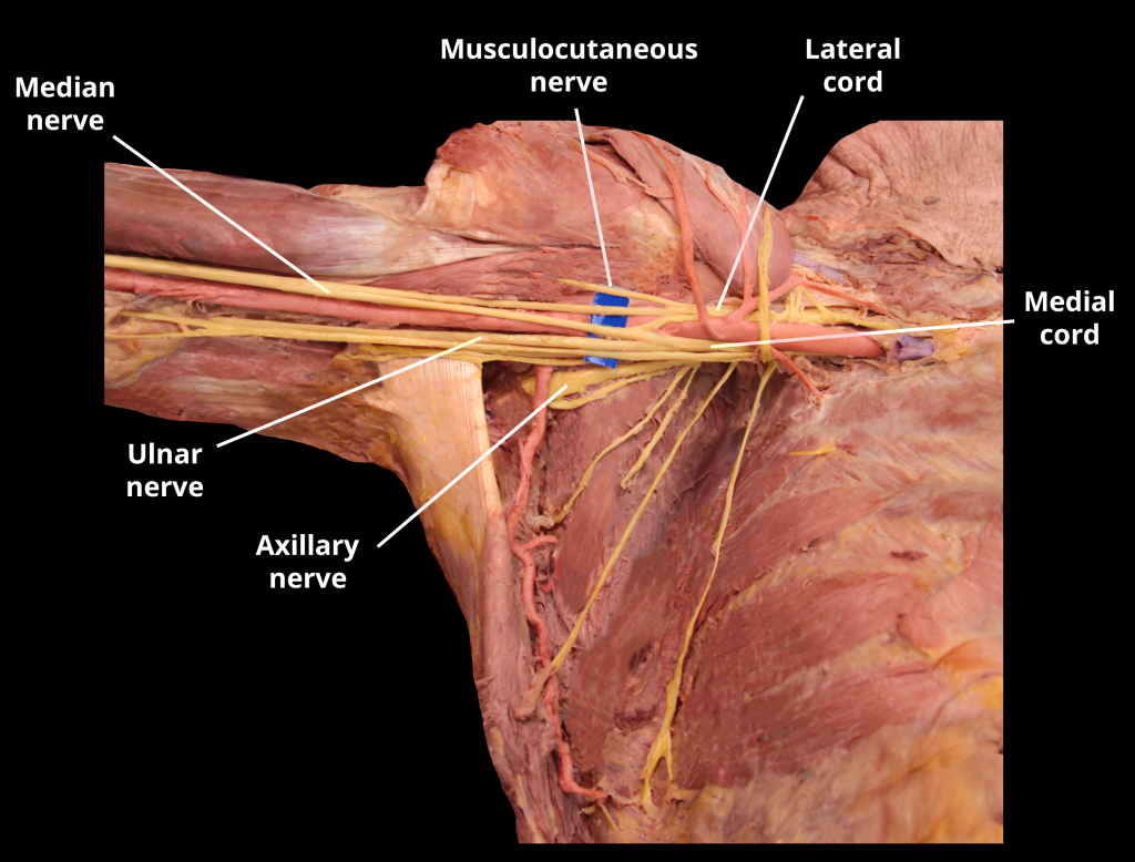 The median nerve is a major peripheral nerve of the upper limb. In this article, we shall look at the anatomy of the median nerve – its anatomical course, motor and sensory functions, and clinical correlations. Pro Feature - 3D Model You've Discovered a Pro Feature Access our 3D Model Library Explore, cut, dissect, annotate and manipulate our 3D models to visualise anatomy in a dynamic, interactive way. Learn More Overview Nerve roots: C6 – T1 (also contains fibres from C5 in some individuals). Motor functions: Innervates the flexor and pronator muscles in the anterior compartment of the forearm (except the flexor carpi ulnaris and part of the flexor digitorum profundus, innervated by the ulnar nerve). Also supplies innervation to the thenar muscles and lateral two lumbricals in the hand. Sensory functions: Gives rise to the palmar cutaneous branch, which innervates the lateral aspect of the palm, and the digital cutaneous branch, which innervates the lateral three and a half fingers on the anterior (palmar) surface of the hand. By TeachMeSeries Ltd (2025) Fig 1Anatomical course of the median nerve through the upper limb. Pro Feature - Dissection Images Prosection of the brachial plexus, demonstrating the medial and lateral cords. The posterior cord is a deeper structure and can not be visualised. Prosection of the brachial plexus, demonstrating the medial and lateral cords. The posterior cord is a deeper structure and can not be visualised. You've Discovered a Pro Feature Access our Dissection Image Library Enhance your understanding with high-resolution dissection images showcasing real-life anatomy. Learn More Anatomical Course The median nerve is derived from the medial and lateral cords of the brachial plexus. It contains fibres from roots C6-T1 and can contain fibres from C5 in some individuals. After originating from the brachial plexus in the axilla, the median nerve descends down the arm, initially lateral to the brachial artery. Halfway down the arm, the nerve crosses over the brachial artery, and becomes situated medially. The median nerve enters the anterior compartment of the forearm via the cubital fossa. In the forearm, the nerve travels between the two heads of pronator teres, and then descends in a plane between the flexor digitorum profundus and flexor digitorum superficialis muscles. The median nerve gives rise to two major branches in the forearm: Anterior interosseous nerve – supplies the deep muscles in the anterior forearm. Palmar cutaneous nerve – innervates the skin of the lateral palm. (The functions of these nerves are explored in more detail later in the article). After giving off the anterior interosseous and palmar cutaneous branches, the median nerve enters the hand via the carpal tunnel – where it terminates by dividing into two branches: Recurrent branch – innervates the thenar muscles. Palmar digital nerves – innervate the palmar surface and fingertips of the lateral three and half digits. Also provides branches to the lateral two lumbrical muscles. By TeachMeSeries Ltd (2025) Fig 2Branches of the median nerve at the distal wrist and hand. Clinical Relevance Carpal Tunnel Syndrome Compression of the median nerve within the carpal tunnel can cause carpal tunnel syndrome (CTS). It is the most common mononeuropathy and is caused by an increased tissue pressure within the carpal tunnel. Whilst risk factors for CTS have been identified (such as diabetes, pregnancy and acromegaly), the exact underlying aetiology is not well understood. Clinical features include numbness, tingling, and pain in the distribution of the median nerve. Importantly, the palm is usually spared – as the palmar cutaneous branch does not travel through the carpal tunnel. Symptoms can wake the patient from sleep and are usually worse in the morning. If left untreated, chronic CTS can cause weakness and atrophy of the thenar muscles. Tests for carpal tunnel syndrome can be performed during physical examination: Tinel’s sign – tapping the nerve in the carpal tunnel to elicit pain in median nerve distribution. Phalen’s manoeuvre – holding the wrist in flexion for 60 seconds to elicit numbness/pain in median nerve distribution. Treatment involves the use of a splint, holding the wrist in extension overnight to relieve symptoms. If this is unsuccessful, corticosteroid injections into the carpal tunnel can be trialled. Surgical decompression of the carpal tunnel may be required in severe cases. By TeachMeSeries Ltd (2025) Fig 3Thenar muscle wasting, secondary to carpal tunnel syndrome. Motor Functions The median nerve innervates the majority of the muscles in the anterior forearm, and some intrinsic hand muscles. Anterior Forearm In the forearm, the median nerve directly innervates muscles in the superficial and intermediate layers: Superficial layer – pronator teres, flexor carpi radialis and palmaris longus. Intermediate layer – flexor digitorum superficialis. The median nerve also gives rise to the anterior interosseous nerve, which supplies the deep flexors: Deep layer – flexor pollicis longus, pronator quadratus, and the lateral half of the flexor digitorum profundus (the medial half of the muscle is innervated by the ulnar nerve). In general, these muscles perform pronation of the forearm, flexion of the wrist and flexion of the digits of the hand. Hand The median nerve innervates some of the muscles in the hand via two branches. The recurrent branch of the median nerve innervates the thenar muscles (muscles associated with movements of the thumb). The palmar digital branches innervates the lateral two lumbricals – these muscles perform flexion at the metacarpophalangeal joints and extension at the interphalangeal joints of the index and middle fingers (The remaining muscles in the anterior forearm and hand are innervated by the ulnar nerve). By TeachMeSeries Ltd (2025) Fig 4Deep flexor muscles of the anterior forearm. Sensory Functions The median nerve is 