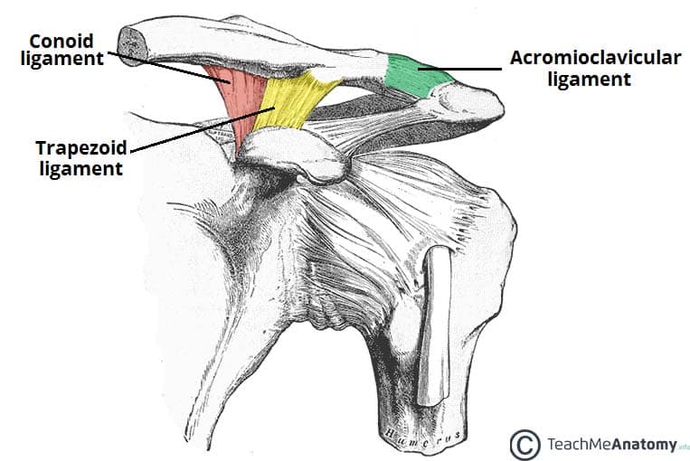 The acromioclavicular joint is an articulation in the shoulder region between the clavicle and the acromion of the scapula. It is a plane type synovial joint. In this article, we shall look at the anatomy of the acromioclavicular joint – its anatomical structure, neurovascular supply and any clinical correlations. By TeachMeSeries Ltd (2025) Fig 1Articulating surfaces of the acromioclavicular joint. Pro Feature - 3D Model You've Discovered a Pro Feature Access our 3D Model Library Explore, cut, dissect, annotate and manipulate our 3D models to visualise anatomy in a dynamic, interactive way. Learn More Anatomical Structure Articulating Surfaces The acromioclavicular joint consists of an articulation between the lateral end of the clavicle and the acromion of the scapula. It has two atypical features: Articular surfaces of the joint are lined with fibrocartilage – as opposed to hyaline cartilage. Joint cavity is partially divided by an articular disc – a wedge of fibrocartilage suspended from the upper part of the capsule. Joint Capsule The joint capsule of the acromioclavicular joint encloses the two articular surfaces. It consists of a loose layer of fibrous tissue, which is lined internally by a synovial membrane. The posterior aspect of the joint capsule is reinforced by fibres from the trapezius muscle. Ligaments There are three main ligaments that strengthen and stabilise the acromioclavicular joint: Acromioclavicular ligament – runs horizontally from the acromion to the lateral clavicle. It covers the joint capsule, reinforcing its superior aspect. Conoid ligament – runs vertically from the coracoid process of the scapula to the conoid tubercle of the clavicle. Trapezoid ligament – runs from the coracoid process of the scapula to the trapezoid line of the clavicle. The conoid and trapezoid ligaments are collectively known as the coracoclavicular ligament. It is a very strong structure, effectively suspending the weight of the upper limb from the clavicle. By TeachMeSeries Ltd (2025) Fig 2The major ligaments of the acromioclavicular joint. Movements The acromioclavicular joint allows a gliding movement in the superior/inferior and anteroposterior planes, along with a small amount of axial rotation. As no muscle acts directly on the joint, all movements are passive, and are initiated by movement at other joints Blood Supply The arterial supply to the acromioclavicular joint is via the: Suprascapular artery – arises from the subclavian artery at the thyrocervical trunk. Thoracoacromial artery – arises from the axillary artery. The venous drainage accompanies the major arteries. Innervation The acromioclavicular joint is innervated by articular branches of the suprascapular and lateral pectoral nerves. They both arise directly from the brachial plexus. Clinical Relevance Acromioclavicular Dislocation Acromioclavicular joint dislocation (also known as a separated shoulder) occurs when the two articulating surfaces of the joint are separated. It most commonly occurs from a direct blow to the joint, or a fall on an outstretched hand. The injury is more serious if ligamental rupture occurs (acromioclavicular or coracoclavicular). If the coracoclavicular ligament is torn, the weight of the upper limb is not supported, and the shoulder drops inferiorly. Management of AC joint dislocation is dependent on injury severity and impact on quality of life. The treatment options range from ice and rest, to ligament reconstruction surgery. Note: this injury is not to be confused with shoulder dislocation – an injury affecting the glenohumeral joint. By Jay F. Cox (2006) [CC-BY-2.5], via Wikimedia Commons Fig 3Acromioclavicular joint dislocation Do you think you’re ready? Take the quiz below Pro Feature - Quiz The Acromioclavicular Joint Question 1 of 3 Submitting... Skip Next Rate question: You scored 0% Skipped: 0/3 1800 More Questions Available Upgrade to TeachMeAnatomy Pro Challenge yourself with over 1800 multiple-choice questions to reinforce learning Learn More Rate This Article