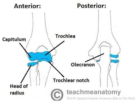 The elbow is the joint connecting the upper arm to the forearm. It is classed as a hinge-type synovial joint. In this article, we shall look at the anatomy of the elbow joint – its articulating surfaces, movements, stability, and the clinical relevance. Pro Feature - 3D Model You've Discovered a Pro Feature Access our 3D Model Library Explore, cut, dissect, annotate and manipulate our 3D models to visualise anatomy in a dynamic, interactive way. Learn More Structures of the Elbow Joint Articulating Surfaces The elbow joint consists of two separate articulations: Trochlear notch of the ulna and the trochlea of the humerus Head of the radius and the capitulum of the humerus Note: The proximal radioulnar joint is found within same joint capsule of the elbow, but most resources consider it as a separate articulation. By TeachMeSeries Ltd (2025) Fig 1Anterior and posterior views of the articulations of the elbow joint Joint Capsule and Bursae Like all synovial joints, the elbow joint has a capsule enclosing the joint. This is strong and fibrous, strengthening the joint. The joint capsule is thickened medially and laterally to form collateral ligaments, which stabilise the flexing and extending motion of the arm. A bursa is a sac-like structure containing a small amount of synovial fluid. It functions to decrease friction between tendons, bone, and skin during movement. There are many bursae in the elbow, but only a few have clinical importance: Intratendinous olecranon – located within the tendon of the triceps brachii. Subtendinous olecranon – between the olecranon and the tendon of the triceps brachii, reducing friction between the two structures during extension and flexion of the arm. Subcutaneous olecranon bursa – between the olecranon and the overlying connective tissue (implicated in olecranon bursitis). Ligaments The joint capsule of the elbow is strengthened by ligaments medially and laterally. The radial collateral ligament is found on the lateral side of the joint, extending from the lateral epicondyle, and blending with the annular ligament of the radius (a ligament from the proximal radioulnar joint). The ulnar collateral ligament originates from the medial epicondyle, and attaches to the coronoid process and olecranon of the ulna. By TeachMeSeries Ltd (2025) Fig 2Ligaments of the elbow joint. Blood Supply The elbow joint receives a rich arterial supply from a surrounding network of vessels, which is formed by branches of the brachial artery. Innervation The elbow joint is innervated by branches of the medial, musculocutaneous, radial and ulnar nerves. Movements The orientation of the bones forming the elbow joint produces a hinge type synovial joint, which allows for extension and flexion of the forearm: Extension – triceps brachii and anconeus Flexion – brachialis, biceps brachii, brachioradialis Note – pronation and supination do not occur at the elbow – they are produced at the nearby radioulnar joints. Clinical Relevance Injuries to the Elbow Joint Bursitis Subcutaneous bursitis: Repeated friction and pressure on the bursa can cause it to become inflamed. Because this bursa lies relatively superficially, it can also become infected (e.g. skin laceration from a fall on the elbow) Subtendinous bursitis: This is caused by repeated flexion and extension of the forearm, commonly seen in assembly line workers. Usually flexion is more painful as more pressure is put on the bursa. Dislocation An elbow dislocation usually occurs when a young child falls on a hand with the elbow flexed. The distal end of the humerus is driven through the weakest part of the joint capsule, which is the anterior side. The ulnar collateral ligament is usually torn and there can also be ulnar nerve involvement Most elbow dislocations are posterior, and it is important to note that elbow dislocations are named by the position of the ulna and radius, not the humerus. By Life in the Fast Lane [CC BY-SA 4.0] Fig 3X-ray of a posterior dislocation of the elbow. Epicondylitis (Tennis elbow or Golfer’s elbow) Most of the flexor and extensor muscles in the forearm have a common tendinous origin. The flexor muscles originate from the medial epicondyle, and the extensor muscles from the lateral. Sportspersons can develop an overuse strain of the common tendon – which results in pain and inflammation around the area of the affected epicondyle. Typically, tennis players experience pain in the lateral epicondyle from the common extensor origin. Golfers experience pain in the medial epicondyle from the common flexor origin. This is easily remembered as golfers aim for the ‘middle’ of the fairway, while tennis players aim for the ‘lateral’ line of the court! Supracondylar Fracture A supracondylar fracture usually occurs due to a fall onto on outstretched, extended hand in a child (95%) but more rarely can occur by a direct impact onto a flexed elbow. It is typically a transverse fracture, spanning between the two epicondyles in the relatively weak epicondylar region formed by the olecranon fossa and coronoid fossa which lie opposite each other in the distal humerus. Direct damage, or swelling can cause the interference to the blood supply of the forearm via the brachial artery. The resulting ischaemia can cause Volkmann’s ischaemic contracture – uncontrolled flexion of the hand, as flexors muscles become fibrotic and short. There also can be damage to the medial, ulnar or radial nerves. As a result, the neurovascular examination and documentation of all patients presenting with these injuries is vital. Sometimes, the blood supply can be interrupted acutely leading to a ‘pale, pulseless’ limb often in a child, usually requiring emergency surgery. Do you think you’re ready? Take the quiz below Pro Feature - Quiz The Elbow Joint Question 1 of 3 Submitting... Skip Next Rate question: You scored 0% Skipped: 0/3 1800 More Questions Available Upgrade to TeachMeAnatomy Pro Challenge yourself