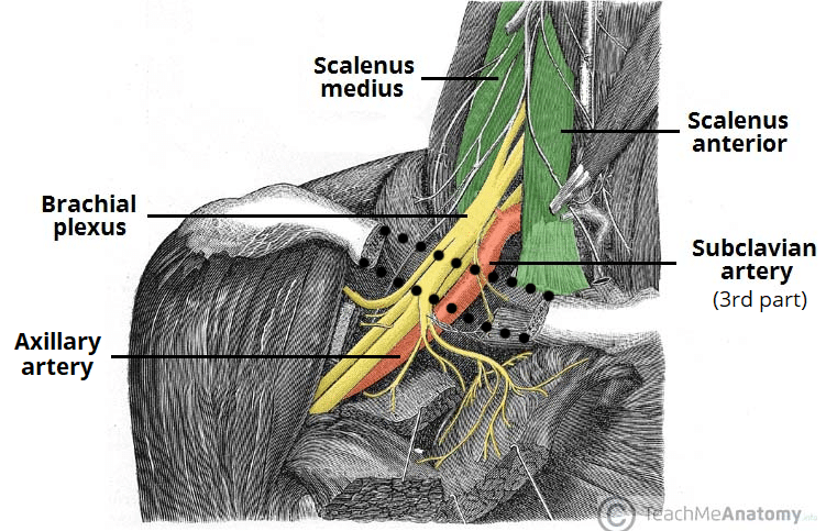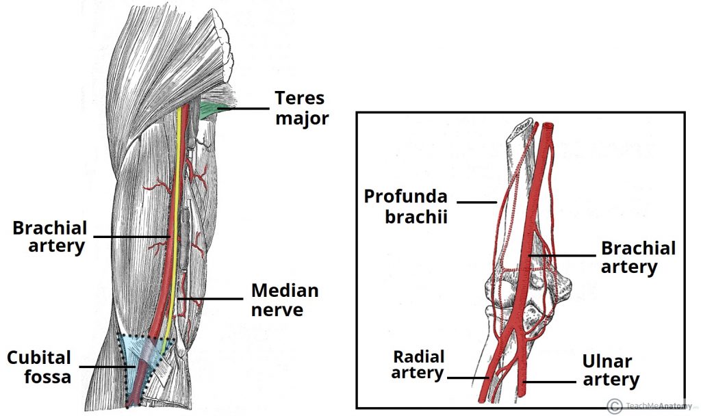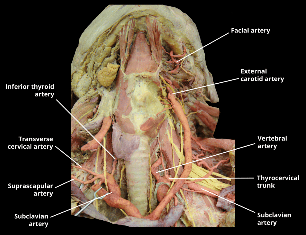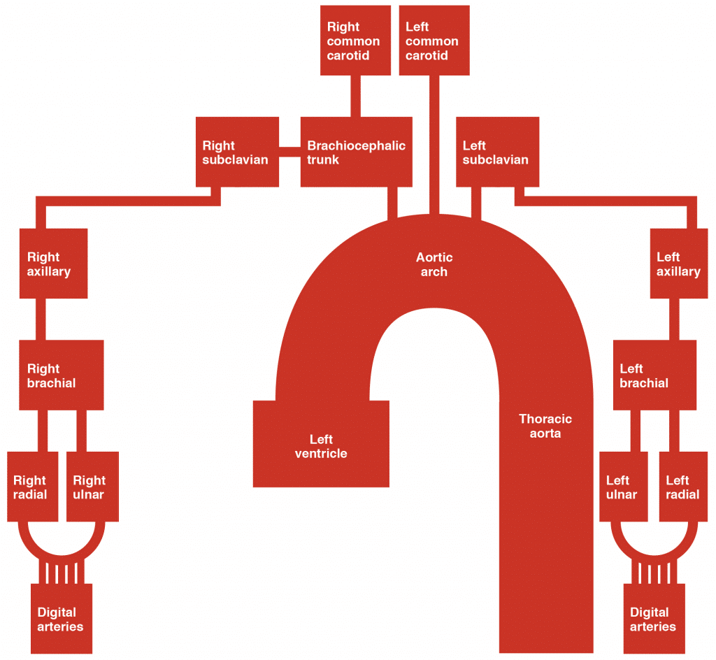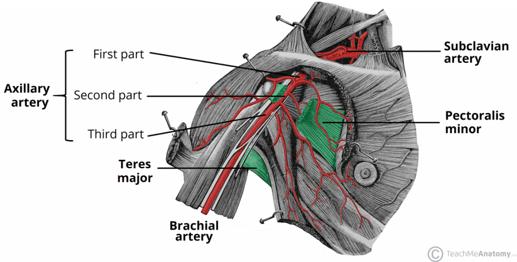 The arterial supply to the upper limb is delivered via five main vessels (proximal to distal): Subclavian artery Axillary artery Brachial artery Radial artery Ulnar artery In this article, we shall look at the anatomy of the arteries of the upper limb – their anatomical course, branches and clinical correlations. By OpenStax College [CC BY 3.0], via Wikimedia Commons Fig 1Schematic demonstrating the arterial supply to the upper limb. Pro Feature - 3D Model You've Discovered a Pro Feature Access our 3D Model Library Explore, cut, dissect, annotate and manipulate our 3D models to visualise anatomy in a dynamic, interactive way. Learn More Subclavian Artery The arterial supply to the upper limb begins as the subclavian artery. On the right, the subclavian artery arises from the brachiocephalic trunk. On the left, it branches directly from the arch of aorta. The subclavian artery travels laterally towards the axilla. It can be divided into three parts based on its position relative to the anterior scalene muscle: First part – origin of the subclavian artery to the medial border of the anterior scalene. Second part – posterior to the anterior scalene. Third part – lateral border of anterior scalene to the lateral border of the first rib. At the lateral border of the first rib, the subclavian artery enters the axilla – and is renamed the axillary artery. By TeachMeSeries Ltd (2025) Fig 2Anatomical course of the subclavian artery. When the vessel crosses the first rib (not shown), it is renamed the axillary artery. Pro Feature - Dissection Images The subclavian and external carotid arteries. Note the location and branching pattern of the thyrocervical trunk. The subclavian and external carotid arteries. Note the location and branching pattern of the thyrocervical trunk. You've Discovered a Pro Feature Access our Dissection Image Library Enhance your understanding with high-resolution dissection images showcasing real-life anatomy. Learn More Axilla: Axillary Artery The axillary artery lies deep to the pectoralis minor and is enclosed in the axillary sheath (a fibrous layer that covers the artery and the three cords of the brachial plexus). Importantly, the artery can be divided into three parts based on its position relative to the pectoralis minor muscle: First part – proximal to pectoralis minor Second part – posterior to pectoralis minor Third part – distal to pectoralis minor The main branches of the axillary artery include: First Part Second Part Third Part Superior thoracic artery Thoracoacromial artery Lateral thoracic artery Subscapular artery Anterior and posterior circumflex arteries The anterior and posterior circumflex humeral arteries form an anastomotic network around the surgical neck of the humerus and can be damaged in cases of fracture. At the lower border of the teres major muscle, the axillary artery is renamed the brachial artery. By TeachMeSeries Ltd (2025) Fig 3The axillary artery has three parts, named according to its position relative to the pectoralis minor muscle. Clinical Relevance Axillary Artery Aneurysm An axillary artery aneurysm is a dilation of the vessel to more than twice its original size. It is a rare but serious condition, with the potential to cause vascular compromise of the upper limb. The dilated portion of the axillary artery can compress the brachial plexus, producing neurological symptoms such as paraesthesia and muscle weakness. The definitive treatment of an axillary artery aneurysm is surgical. It involves excising the aneurysm and reconstructing the vessel wall using a vascular graft. Upper Arm: Brachial Artery The brachial artery is a continuation of the axillary artery past the lower border of the teres major. It is the main supply of blood for the arm. Immediately distal to the teres major, the brachial artery gives rise to the profunda brachii (deep artery), which travels with the radial nerve in the radial groove of the humerus and supplies structures in the posterior aspect of the upper arm (e.g. triceps brachii). The profunda brachii terminates by contributing to an anastomotic network around the elbow joint. The brachial artery proper descends down the arm. As it moves through the cubital fossa, underneath the bicipital aponeurosis, the brachial artery terminates by bifurcating into the radial and ulnar arteries. By TeachMeSeries Ltd (2025)Fig 4The anatomical course and major branches of the brachial artery. Note its relation to the median nerve as it descends the arm. Clinical Relevance Occlusion or Laceration of the Brachial Artery The arm has relatively good anastomotic supply. This means that it is well protected from ischaemia in cases of temporary or partial occlusion of the brachial artery. However, if the artery is completely occluded (or severed), the resulting ischaemia can cause necrosis of forearm muscles. Muscle fibres are replaced by scar tissue and shorten considerably – this can cause a characteristic flexion deformity, called Volkmann’s ischaemic contracture. Forearm: Radial and Ulnar Arteries The radial and ulnar arteries are formed by the bifurcation of the brachial artery within the cubital fossa: Radial artery – supplies the posterolateral aspect of the forearm. It contributes to anastomotic networks surrounding the elbow joint and carpal bones. The radial pulse can be palpated in the distal forearm, immediately lateral to the prominent tendon of the flexor carpi radialis muscle. Ulnar artery – supplies the anteromedial aspect of the forearm. It contributes to an anastomotic network surrounding the elbow joint. Also gives rise to the anterior and posterior interosseous arteries, which supply deeper structures in the forearm. These two arteries anastomose in the hand by forming two arches – the superficial palmar arch, and the deep palmar arch. By TeachMeSeries Ltd (2025) Fig 5Arterial supply to the forearm via the radial and ulnar arteries. Note the position of the ulnar nerve relative to t