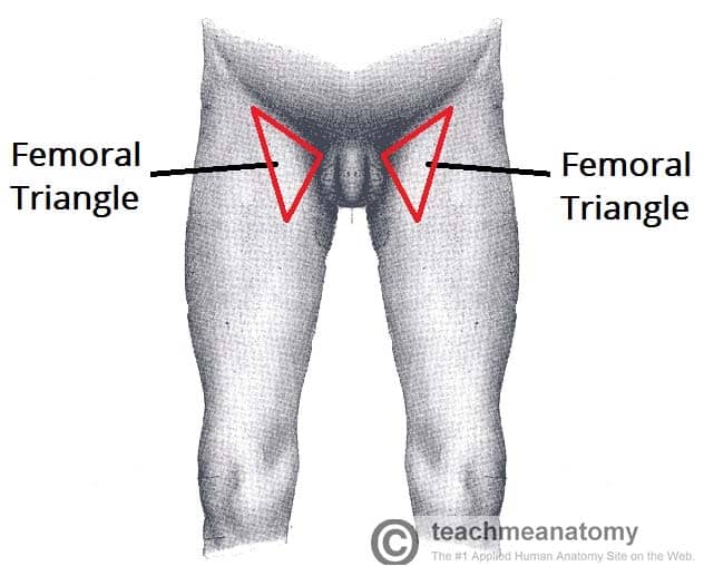 The femoral triangle is a wedge-shaped area located within the superomedial aspect of the anterior thigh. It acts as a conduit for structures entering and leaving the anterior thigh. In this article, we shall look at the anatomy of the femoral triangle – its borders, contents, and clinical relevance. By TeachMeSeries Ltd (2025) Fig 1Surface anatomy of the femoral triangle. Pro Feature - 3D Model You've Discovered a Pro Feature Access our 3D Model Library Explore, cut, dissect, annotate and manipulate our 3D models to visualise anatomy in a dynamic, interactive way. Learn More Borders The femoral triangle consists of three borders, a floor and a roof: Roof – fascia lata. Floor – pectineus, iliopsoas, and adductor longus muscles. Superior border – inguinal ligament (a ligament that runs from the anterior superior iliac spine to the pubic tubercle). Lateral border – medial border of the sartorius muscle. Medial border – medial border of the adductor longus muscle. The rest of this muscle forms part of the floor of the triangle. The inguinal ligament acts as a flexor retinaculum, supporting the contents of the femoral triangle during flexion at the hip. Note: Some sources consider the lateral border of the adductor longus to be the medial border of the femoral triangle. However, the majority state that it is the medial border of the adductor longus – and this is definition we have gone with. By TeachMeSeries Ltd (2025) Fig 2The borders of the right femoral triangle. Pro Feature - Dissection Images The borders and contents of the femoral triangle The borders and contents of the femoral triangle You've Discovered a Pro Feature Access our Dissection Image Library Enhance your understanding with high-resolution dissection images showcasing real-life anatomy. Learn More Contents The femoral triangle contains some of the major neurovascular structures of the lower limb. Its contents (lateral to medial) are: Femoral nerve – innervates the anterior compartment of the thigh, and provides sensory branches for the leg and foot. Femoral artery – responsible for the majority of the arterial supply to the lower limb. Femoral vein – the great saphenous vein drains into the femoral vein within the triangle. Femoral canal – contains deep lymph nodes and vessels. The femoral artery, vein and canal are contained within a fascial compartment – known as the femoral sheath. Acronym for the contents of the femoral triangle (lateral to medial) – NAVEL: Nerve, Artery, Vein, Empty space (allows the veins and lymph vessels to distend to accommodate different levels of flow), Lymph nodes. By TeachMeSeries Ltd (2025) Fig 3The contents of the femoral triangle. Clinical Relevance The Femoral Triangle Femoral Pulse Just inferior to where the femoral artery crosses the inguinal ligament, it can be palpated to measure the femoral pulse. The femoral artery crosses exactly midway between the pubic symphysis and anterior superior iliac spine (known as the mid-inguinal point). Access to the Femoral Artery The femoral artery is located superficially within the femoral triangle and is thus easy to access. This makes it suitable for a range of clinical procedures. One such procedure is coronary angiography. Here, the femoral artery is catheterised with a long, thin tube. This tube is navigated up the external iliac artery, common iliac artery, aorta, and into the coronary vessels. A radio-opaque dye is then injected into the coronary vessels, and any wall thickening or blockages can be visualised via x-ray. Femoral Hernia A hernia is defined as “a condition in which part of an organ is displaced and protrudes through the wall of the cavity containing it“. In the case of femoral hernia, part of the bowel pushes into the femoral canal, underneath the inguinal ligament. This manifests clinically as a lump or bulge in the area of the femoral triangle. It usually requires surgical intervention to treat. Do you think you’re ready? Take the quiz below Pro Feature - Quiz The Femoral Triangle Question 1 of 3 Submitting... Skip Next Rate question: You scored 0% Skipped: 0/3 1800 More Questions Available Upgrade to TeachMeAnatomy Pro Challenge yourself with over 1800 multiple-choice questions to reinforce learning Learn More Rate This Article