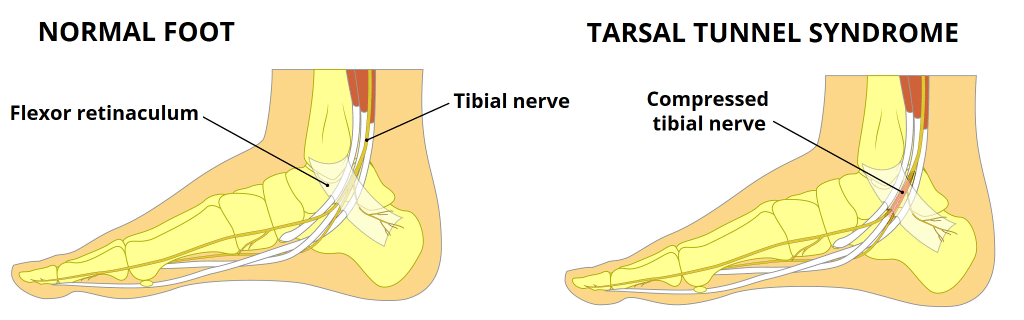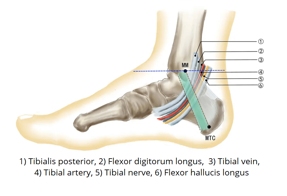 The tarsal tunnel is a fibro-osseous space located on the posteromedial aspect of the ankle. It acts as a passageway for tendons, nerves and vessels to travel between the posterior leg and the foot. In this article, we shall look at the anatomy of the tarsal tunnel – its borders, contents, and clinical relevance. Pro Feature - 3D Model You've Discovered a Pro Feature Access our 3D Model Library Explore, cut, dissect, annotate and manipulate our 3D models to visualise anatomy in a dynamic, interactive way. Learn More Borders The tarsal tunnel is formed by a bony floor and connective tissue roof. The floor is a concave surface formed by the medial aspect of the tibia, talus and calcaneus. It is converted into a tunnel by the flexor retinaculum, which spans obliquely between the medial malleolus and the medial tubercle of the calcaneus to form the roof. The flexor retinaculum is continuous with the deep fascia of the leg and foot. By Y. Yang, M. L. Du, Y. S. Fu, W. Liu, Q. Xu, X. Chen, Y. J. Hao, Z. Liu & M. J. Gao, [CC BY 4.0], via Wikimedia Commons Fig 1The roof of the tarsal tunnel is formed by a flexor retinaculum extending from the medial malleolus to the medial tubercle of the calcaneus. Contents The tarsal tunnel acts as a passageway for tendons, nerves and vessels to travel between the posterior leg and the foot. Its contents (anterior to posterior) are: Tibialis posterior tendon Flexor digitorum longus tendon Posterior tibial artery and vein Tibial nerve Flexor hallucis longus tendon The mnemonic Tom, Dick and a Very Nervous Harry can be used to aid recall of these structures. The tunnel is divided into four fibrous compartments – one containing the neurovascular structures and the other three containing the muscle tendons. Clinical Relevance Tarsal Tunnel Syndrome Tarsal tunnel syndrome refers to entrapment and compression of the tibial nerve as it passes through the tarsal tunnel. Patients may experience altered sensation in the sensory distribution of the tibial nerve – the sole of the foot. The motor function of the nerve can also be affected in severe disease, causing weakness and wasting of the intrinsic foot muscles. Management can be conservative or surgical: Conservative: Physiotherapy, NSAIDs, corticosteroid injections Surgical: Tarsal tunnel release (cutting through the flexor retinaculum to decompress the tunnel) Adobe Stock, Licensed to TeachMeSeries Ltd Fig 2Tarsal tunnel syndrome is caused by compression of the tibial nerve as it passes through the tarsal tunnel Do you think you’re ready? Take the quiz below Pro Feature - Quiz The Tarsal Tunnel Question 1 of 3 Submitting... Skip Next Rate question: You scored 0% Skipped: 0/3 1800 More Questions Available Upgrade to TeachMeAnatomy Pro Challenge yourself with over 1800 multiple-choice questions to reinforce learning Learn More Rate This Article