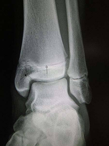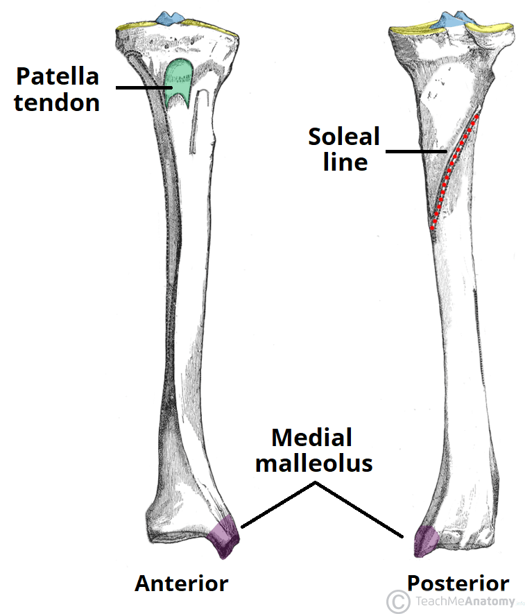 The tibia is the main bone of the lower leg, forming what is more commonly known as the shin. It expands at its proximal and distal ends; articulating at the knee and ankle joints respectively. The tibia is the second largest bone in the body and it is a key weight-bearing structure. In this article, we shall look at anatomy of the tibia – its bony landmarks, articulations and clinical correlations. By Anatomography [CC-BY-SA-2.1-jp], via Wikimedia Commons Fig 1Overview of the tibia in the human skeleton Pro Feature - 3D Model You've Discovered a Pro Feature Access our 3D Model Library Explore, cut, dissect, annotate and manipulate our 3D models to visualise anatomy in a dynamic, interactive way. Learn More Proximal The proximal tibia is widened by the medial and lateral condyles, which aid in weight-bearing. The condyles form a flat surface, known as the tibial plateau. This structure articulates with the femoral condyles to form the key articulation of the knee joint. Located between the condyles is a region called the intercondylar eminence – this projects upwards on either side as the medial and lateral intercondylar tubercles. This area is the main site of attachment for the ligaments and the menisci of the knee joint. The intercondylar tubercles of the tibia articulate with the intercondylar fossa of the femur. By TeachMeSeries Ltd (2025) Fig 2The tibial plateau. The tibial condyles articulate with the femoral condyles to form the knee joint. Shaft The shaft of the tibia is prism-shaped, with three borders and three surfaces; anterior, posterior and lateral. For brevity, only the anatomically and clinically important borders/surfaces are mentioned here. Anterior border – palpable subcutaneously down the anterior surface of the leg as the shin. The proximal aspect of the anterior border is marked by the tibial tuberosity; the attachment site for the patella ligament. Posterior surface – marked by a ridge of bone known as soleal line. This line is the site of origin for part of the soleus muscle, and extends inferomedially, eventually blending with the medial border of the tibia. There is usually a nutrient artery proximal to the soleal line. Lateral border – also known as the interosseous border. It gives attachment to the interosseous membrane that binds the tibia and the fibula together. By TeachMeSeries Ltd (2025) Fig 3Bony landmarks of the tibial shaft. Clinical Relevance Intraosseous Access Intraosseous access is a form of vascular access used in the emergency setting. It allows the administration of fluids, blood products and medications directly into the bone marrow. IO access is typically used in an emergency when intravenous access is not obtainable. There are two main sites in the tibia that are suitable for IO access: Anteromedial surface, 2-3cm below the tibial tuberosity Proximal to the medial malleolus Complications of IO access include osteomyelitis, iatrogenic fracture and compartment syndrome. IO infusions should be discontinued when IV access has been achieved. Distal The distal end of the tibia widens to assist with weight-bearing. The medial malleolus is a bony projection continuing inferiorly on the medial aspect of the tibia. It articulates with the tarsal bones to form part of the ankle joint. On the posterior surface of the tibia, there is a groove through which the tendon of tibialis posterior passes. Laterally is the fibular notch, where the fibula is bound to the tibia – forming the distal tibiofibular joint. Clinical Relevance Fractures of the Tibia Fractures of the tibia are relatively common. There are two main types: High energy trauma – occurs predominantly in the younger population. Low energy trauma or insufficiency fractures – occurs predominantly in the elderly. Fractures most commonly occur at the shaft of the tibia, and are typically associated with fibula fractures. Fractures of the proximal tibia are known as tibial plateau fractures; the condyles may be broken and injury to the menisci and ligaments of the knee is not uncommon. These fractures are classified using the Schatzker classification, and if very displaced will likely required operative management. It is important to monitor patients for signs of compartment syndrome in the pre-and post-operative phases. At the ankle, the medial malleolus can be fractured. This is caused by the ankle being twisted inwards (over-inversion) – the talus of the foot is forced against the medial malleolus, causing a spiral fracture. This rarely happens in isolation and typically the lateral malleolus is also fractured; potentially producing an unstable fracture that requires operative management. By James Heilman, MD [CC-BY-SA-3.0], via Wikimedia Commons Fig 4Fracture of the medial malleolus (black arrow) in a child, with the whiting arrow marking a normal growth plate. This is a Salter Harris type III fracture. Do you think you’re ready? Take the quiz below Pro Feature - Quiz The Tibia Question 1 of 3 Submitting... Skip Next Rate question: You scored 0% Skipped: 0/3 1800 More Questions Available Upgrade to TeachMeAnatomy Pro Challenge yourself with over 1800 multiple-choice questions to reinforce learning Learn More Rate This Article
