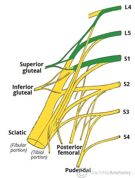The sacral plexus is a network of nerve fibres that supplies the skin and muscles of the pelvis and lower limb. It is located on the surface of the posterior pelvic wall, anterior to the piriformis muscle. The plexus is formed by the anterior rami (divisions) of the sacral spinal nerves S1, S2, S3 and S4. It also receives contributions from the lumbar spinal nerves L4 and L5. In this article, we shall look at the anatomy of the sacral plexus – its formation and major branches. Pro Feature - 3D Model You've Discovered a Pro Feature Access our 3D Model Library Explore, cut, dissect, annotate and manipulate our 3D models to visualise anatomy in a dynamic, interactive way. Learn More Spinal Nerves The spinal nerves S1 – S4 form the basis of the sacral plexus. At each vertebral level, paired spinal nerves leave the spinal cord via the intervertebral foramina of the vertebral column. Each nerve then divides into anterior and posterior nerve fibres. The sacral plexus begins as the anterior fibres of the spinal nerves S1, S2, S3, and S4. They are joined by the 4th and 5th lumbar roots, which combine to form the lumbosacral trunk. This descends into the pelvis to meet the sacral roots as they emerge from the spinal cord. By TeachMeSeries Ltd (2025) Fig 1The spinal cord outflow at each vertebral level. The anterior rami of vertebral levels S1-S4 make up the roots of the sacral plexus. The Branches The anterior rami of the S1-S4 spinal roots (and the lumbosacral trunk) divide into several cords. These cords then combine together to form the five major peripheral nerves of the sacral plexus. These nerves then descend down the posterior pelvic wall. They have two main destinations: Leave the pelvis via the greater sciatic foramen – these nerves enter the gluteal region of the lower limb, innervating the structures there. Remain in the pelvis – these nerves innervate the pelvic muscles, organs and perineum. We shall now consider the branches of the sacral plexus. (Note: In this article we shall include only brief notes on the function of these nerves – for more detailed information click on the title to visit their respective pages) By TeachMeSeries Ltd (2025) Fig 2The right lumbar plexus and the left sacral plexus. Superior Gluteal Nerve The superior gluteal nerve leaves the pelvis via the greater sciatic foramen, entering the gluteal region superiorly to the piriformis muscle. It is accompanied by the superior gluteal artery and vein for much of its course. Roots: L4, L5, S1. Motor Functions: Innervates the gluteus minimus, gluteus medius and tensor fascia lata. Sensory Functions: None. A useful memory aid for the major branches of the sacral plexus is ‘Some Irish Sailor Pesters Polly’. This stands for Superior Gluteal, Inferior Gluteal, Sciatic, Posterior cutaneous nerve of thigh, Pudendal. By TeachMeSeries Ltd (2025) Fig 3Derivation of the superior gluteal nerve from the sacral plexus Inferior Gluteal Nerve The inferior gluteal nerve leaves the pelvis via the greater sciatic foramen, entering the gluteal region inferiorly to the piriformis muscle. It is accompanied by the inferior gluteal artery and vein for much of its course. Roots: L5, S1, S2. Motor Functions: Innervates gluteus maximus. Sensory Functions: None. By TeachMeSeries Ltd (2025) Fig 4Derivation of the inferior gluteal nerve from the lumbar plexus Sciatic Nerve See more detailed information here Roots: L4, L5, S1, S2, S3 Motor Functions: Tibial portion – Innervates the muscles in the posterior compartment of the thigh (apart from the short head of the biceps femoris), and the hamstring component of adductor magnus. Innervates all the muscles in the posterior compartment of the leg and sole of the foot. Common fibular portion – Short head of biceps femoris, all muscles in the anterior and lateral compartments of the leg and extensor digitorum brevis. Sensory Functions: Tibial portion: supplies the skin of the posterolateral leg, lateral foot and the sole of the foot. Common fibular portion: supplies the skin of the lateral leg and the dorsum of the foot. For more details about the Tibial nerve, click here. For more details about the Common Fibular nerve, click here. By TeachMeSeries Ltd (2025) Fig 5Derivation of the sciatic nerve from the sacral plexus. Posterior Femoral Cutaneous The posterior cutaneous nerve of thigh leaves the pelvis via the greater sciatic foramen, entering the gluteal region inferiorly to the piriformis muscle. It descends deep to the gluteus maximus and runs down the back of the thigh to the knee. Roots: S1, S2, S3 Motor Functions: None Sensory Functions: Innervates the skin on the posterior surface of the thigh and leg. Also innervates the skin of the perineum. By TeachMeSeries Ltd (2025) Fig 6Derivation of the posterior cutaneous nerve. Pudendal Nerve This nerve leaves the pelvis via the greater sciatic foramen, then re-enters via the lesser sciatic foramen. It moves anterosuperiorly along the lateral wall of the ischiorectal fossa, and terminates by dividing into several branches. Roots: S2, S3, S4 Motor Functions: Innervates the skeletal muscles in the perineum, the external urethral sphincter, the external anal sphincter, levator ani. Sensory Functions: Innervates the penis and the clitoris and most of the skin of the perineum. (Tip – an easy way to remember the functions of the pudendal nerve is S2, S3, S4 keeps poo off the floor!) By TeachMeSeries Ltd (2025) Fig 7Derivation of the pudendal nerve from the sacral plexus Other Branches In addition to the five major nerves of the sacral plexus, there are a number of smaller branches. These tend to be nerves that directly supplying muscles (with the exception of the perforating cutaneous nerve, which supplies the skin over the inferior gluteal region and the pelvic splanchnic nerves, which innervate the abdominal viscera): Nerve to piriformis Nerve to obturator internus Nerve to quadratus femoris Clinical Relevance Lumbosacral Plexopathy A l