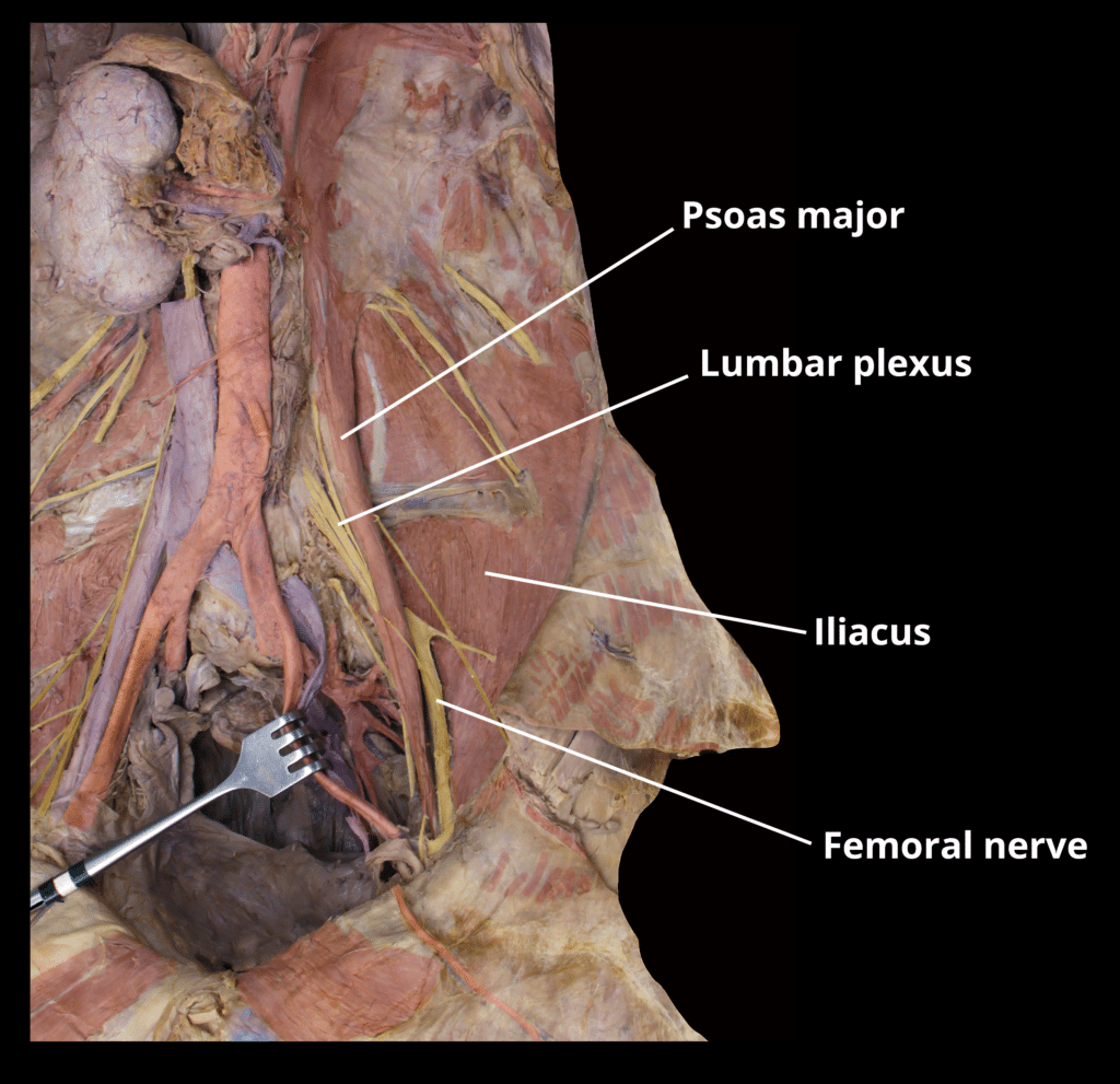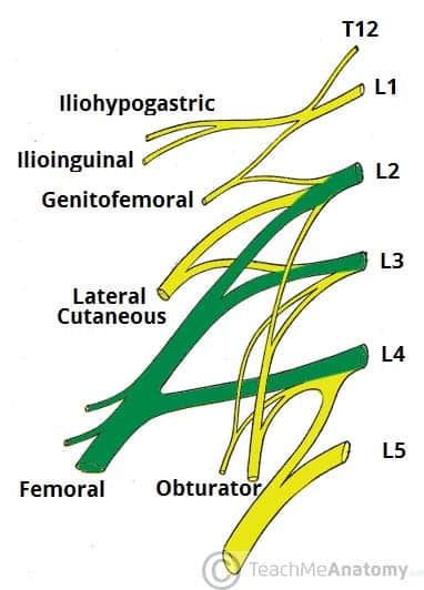 The femoral nerve is one of the major peripheral nerves of the lower limb. In this article, we shall look at the anatomy of the femoral nerve – its anatomical course, functions, and clinical correlations. Pro Feature - 3D Model You've Discovered a Pro Feature Access our 3D Model Library Explore, cut, dissect, annotate and manipulate our 3D models to visualise anatomy in a dynamic, interactive way. Learn More Overview Nerve roots: L2-L4 Motor functions: Innervates the anterior thigh muscles that flex the hip joint (pectineus, iliacus, sartorius) and extend the knee (quadriceps femoris: rectus femoris, vastus lateralis, vastus medialis and vastus intermedius), Sensory functions: Supplies cutaneous branches to the anteromedial thigh (anterior cutaneous branches of the femoral nerve) and the medial side of the leg and foot (saphenous nerve). By TeachMeSeries Ltd (2025) Fig 1Derivation of the femoral nerve from the lumbar plexus. Pro Feature - Dissection Images The lumbar plexus, femoral nerve and muscles of the posterior abdominal wall. The lumbar plexus, femoral nerve and muscles of the posterior abdominal wall. You've Discovered a Pro Feature Access our Dissection Image Library Enhance your understanding with high-resolution dissection images showcasing real-life anatomy. Learn More Anatomical Course The femoral nerve is the largest branch of the lumbar plexus. It is derived from the anterior rami of nerve roots L2, L3 and L4. After arising from the lumbar plexus, the femoral nerve travels inferiorly through the psoas major muscle of the posterior abdominal wall. It supplies branches to the iliacus and pectineus muscles prior to entering the thigh. The femoral nerve then passes underneath the inguinal ligament to enter the femoral triangle. Within this triangle, the nerve is located lateral to the femoral vessels (unlike the nerve, the femoral artery and vein are enclosed within the femoral sheath). Approximately 4cm below the inguinal ligament, the femoral nerve divides into anterior and posterior divisions: Anterior division of the femoral nerve Posterior division of the femoral nerve Anterior cutaneous branches Branch to sartorius Branch to pectineus Saphenous nerve Branches to quadriceps femoris The terminal cutaneous branch of the femoral nerve is the saphenous nerve. It travels through the adductor canal (accompanied by the femoral artery and vein) and exits prior to the adductor hiatus. The saphenous nerve innervates the medial aspect of the leg and the foot. By TeachMeSeries Ltd (2025) Fig 2Anatomical course of the femoral nerve and its two cutaneous branches – anterior cutaneous fibres and saphenous nerve. Motor Functions The femoral nerve supplies the muscles of the anterior thigh: Hip flexors: Pectineus – adducts and flexes the thigh, assists with medial rotation of the thigh. Iliacus – acts with psoas major and psoas minor (forming iliopsoas) to flex the thigh at the hip joint and stabilise the hip joint. Sartorius – flexes, abducts and laterally rotates the thigh at the hip joint. Flexes the leg at the knee joint. Knee extensors: Quadriceps femoris (rectus femoris, vastus lateralis, vastus medialis and vastus intermedius) – extends the leg at the knee joint. Rectus femoris also steadies the hip joint and assists iliopsoas in flexing the thigh. By TeachMeSeries Ltd (2025) Fig 3The muscles of the anterior thigh. Sensory Functions There are two main sensory branches that arise from the femoral nerve: Anterior cutaneous branches – derived from the anterior division of the femoral nerve. They supply the skin of the anteromedial thigh. Saphenous nerve – a continuation of the posterior division of the femoral nerve. It supplies the skin of the medial leg and foot. By TeachMeSeries Ltd (2025) Fig 4The cutaneous innervation of the branches of the femoral nerve. Clinical Relevance Stripping of the Saphenous Vein The saphenous vein is often stripped in individuals with problematic varicose veins. The long saphenous vein is accompanied in its course by the saphenous nerve. Damage to the saphenous nerve during this procedure can lead to pain, paraesthesia or complete loss of sensation the medial side of the lower leg. Femoral Nerve Block Femoral nerve block (in combination with a sciatic nerve block) may be indicated in patients requiring lower limb surgery who cannot tolerate a general anaesthetic. A femoral nerve block can also be used as peri- and post-operative analgesia for patients with a fractured neck of femur who cannot tolerate particular analgesics. Do you think you’re ready? Take the quiz below Pro Feature - Quiz The Femoral Nerve Question 1 of 3 Submitting... Skip Next Rate question: You scored 0% Skipped: 0/3 1800 More Questions Available Upgrade to TeachMeAnatomy Pro Challenge yourself with over 1800 multiple-choice questions to reinforce learning Learn More Rate This Article